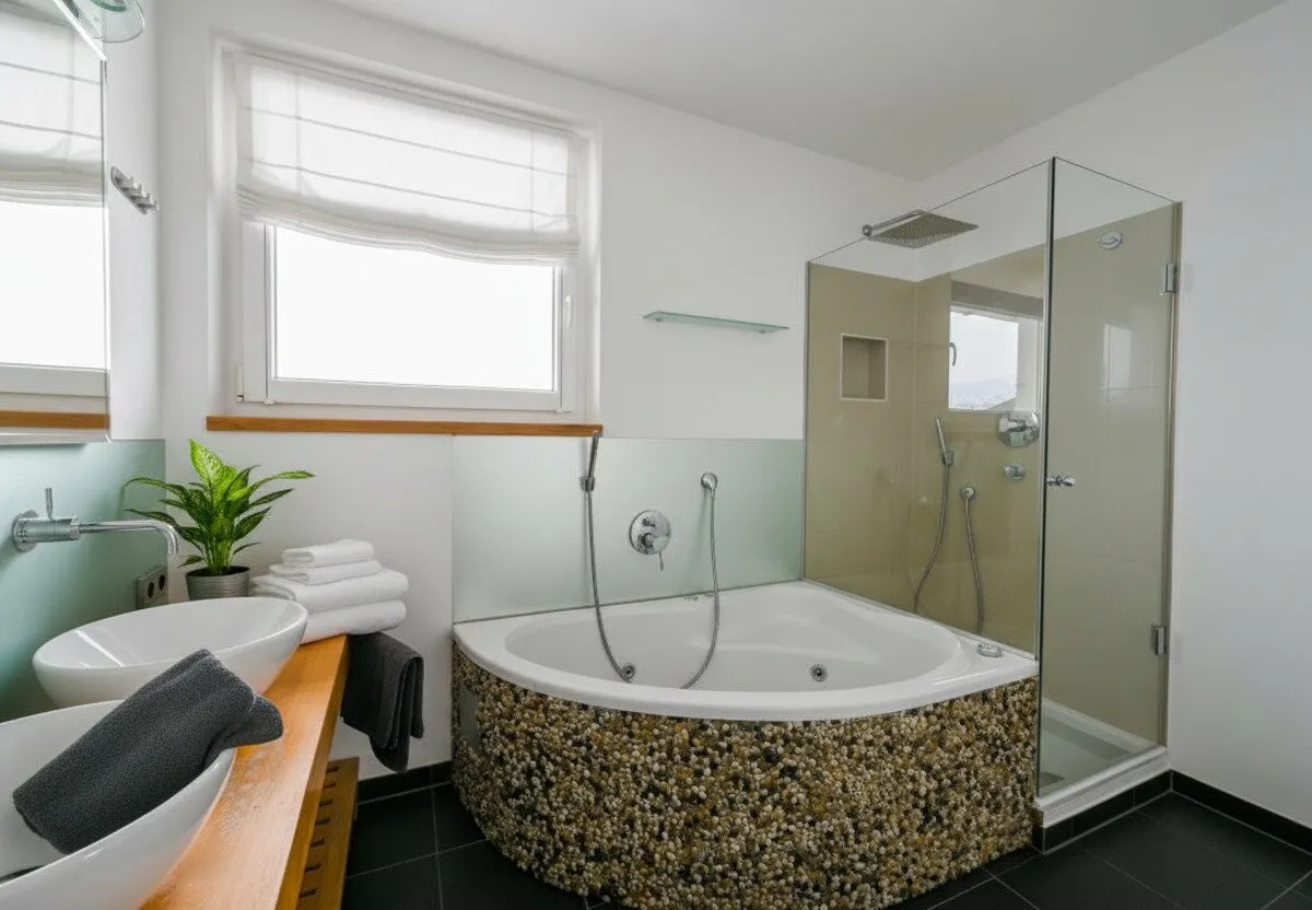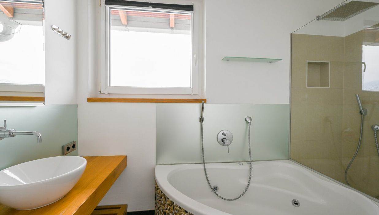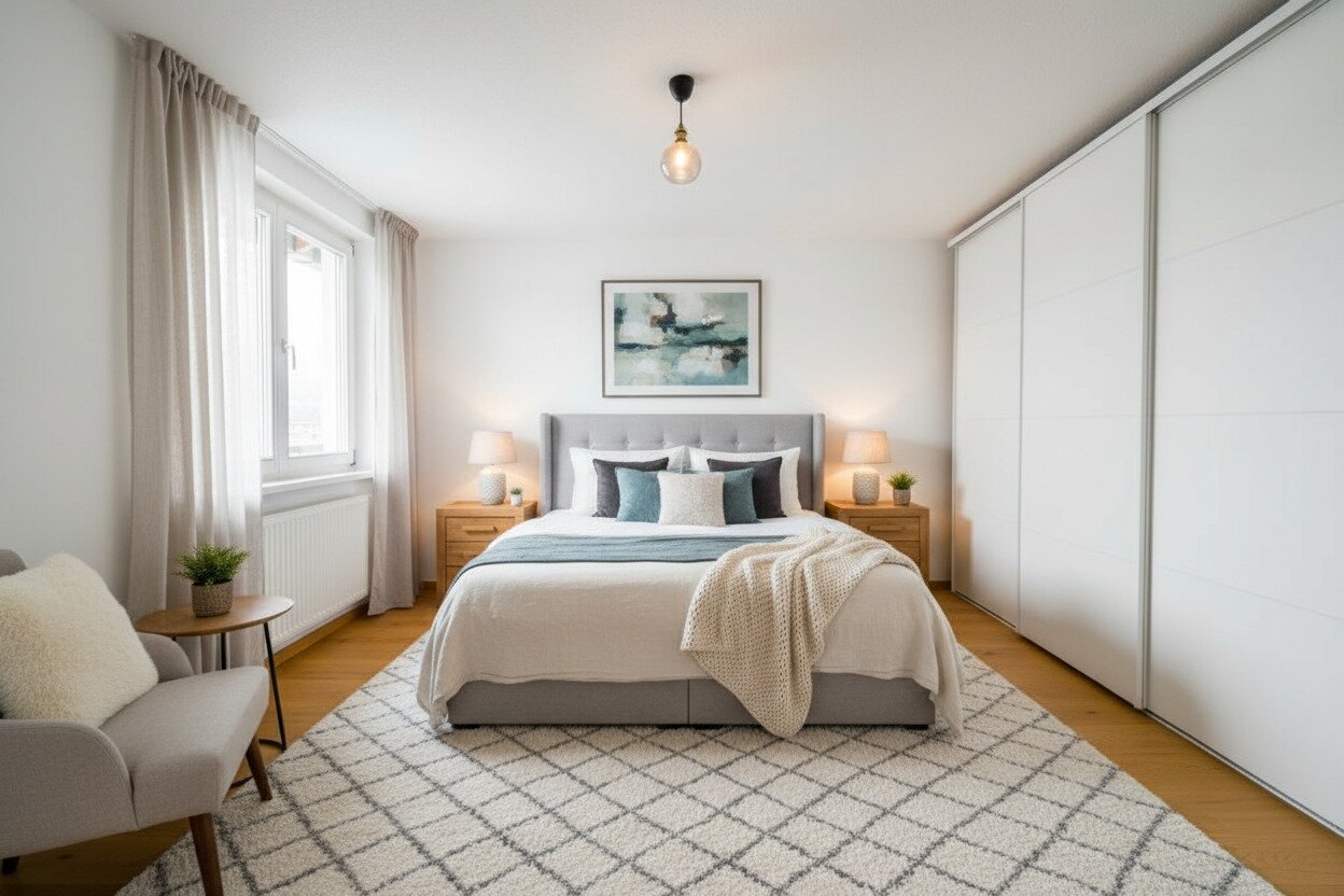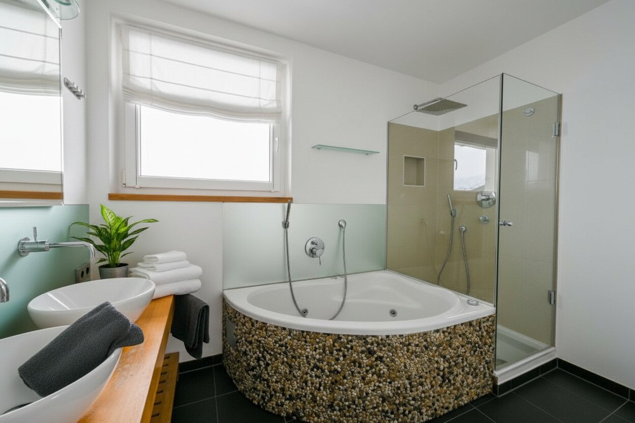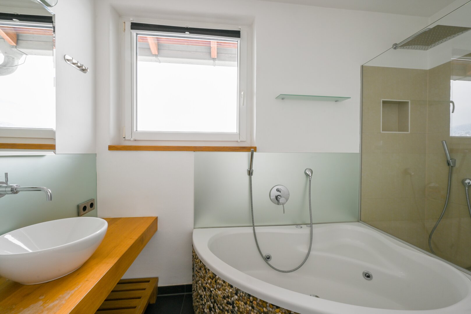 Die beiden geräumigen Schlafzimmer bieten viel Platz zur individuellen Gestaltung und sind mit hochwertigem Holzboden ausgestattet, der eine warme und stilvolle Atmosphäre schafft. Das Badezimmer überzeugt mit Fenster, Dusche sowie einer komfortablen Whirlpool-Badewanne und Doppelwaschtisch. Das WC ist separat angeordnet – ideal für den Alltag. Ein praktischer Abstellraum mit Anschluss für Waschmaschine und Platz für Vorräte sorgt für zusätzlichen Stauraum innerhalb der Wohnung.