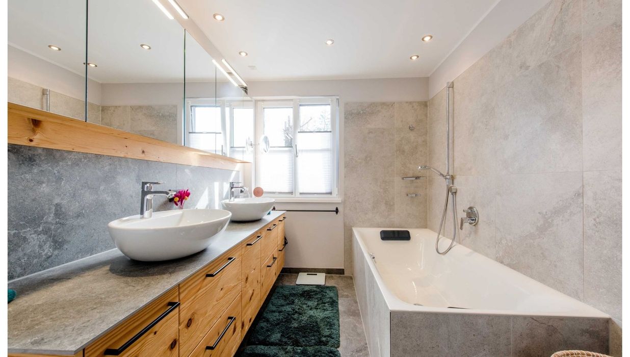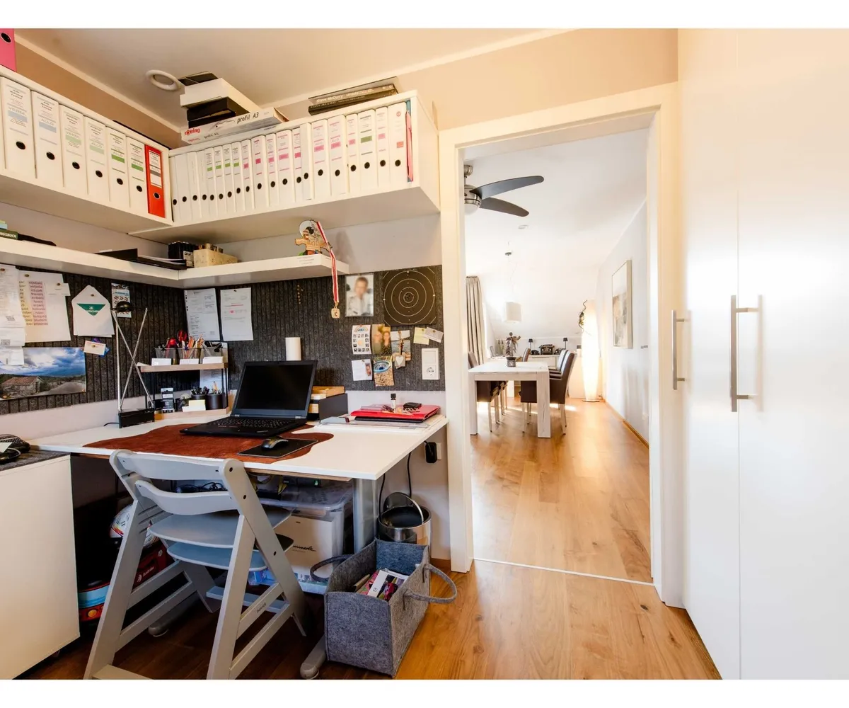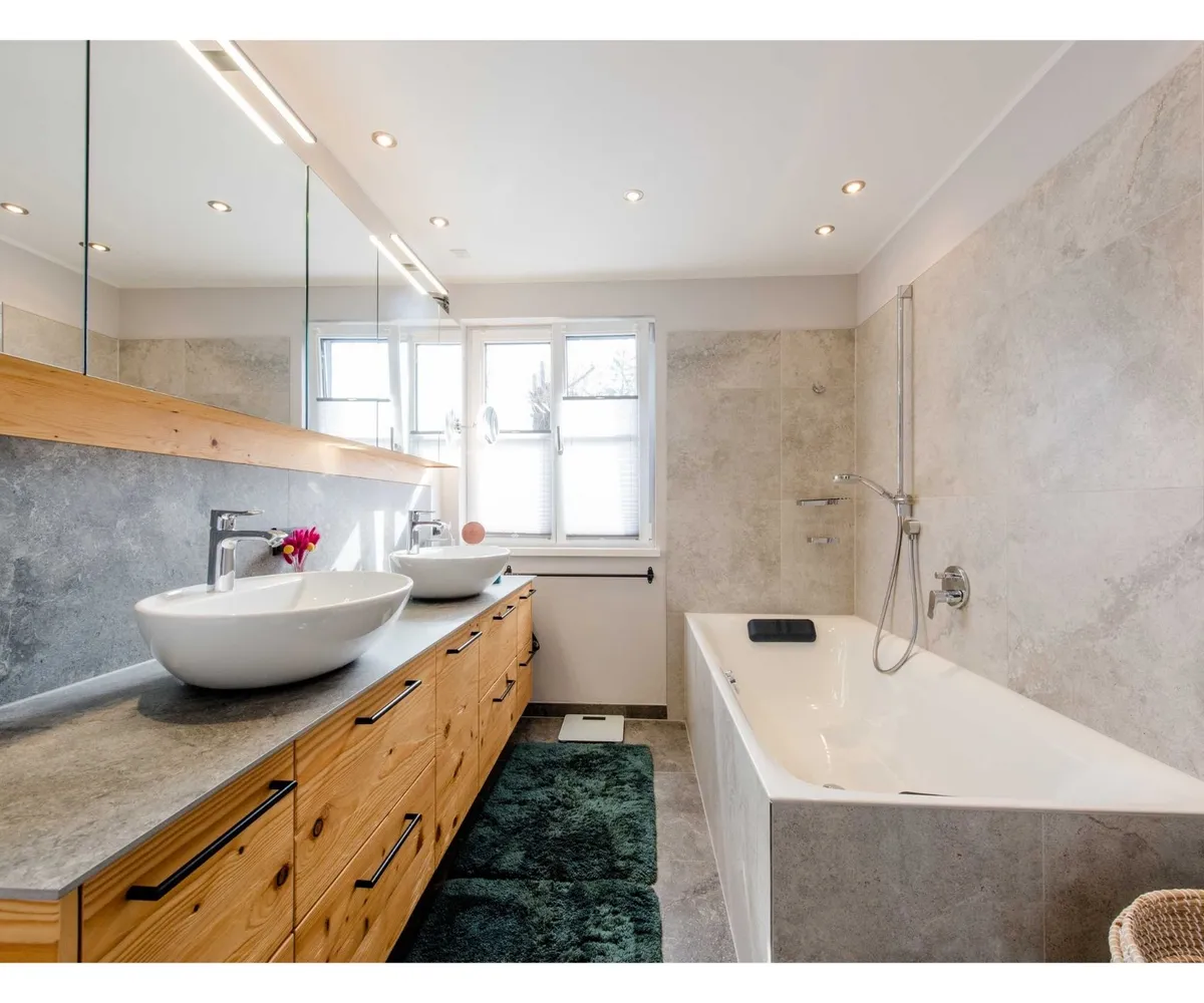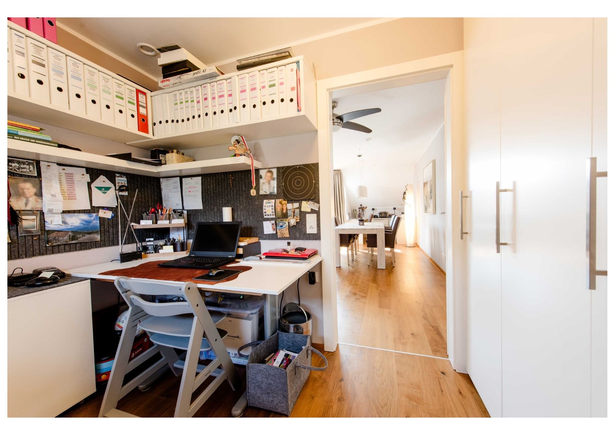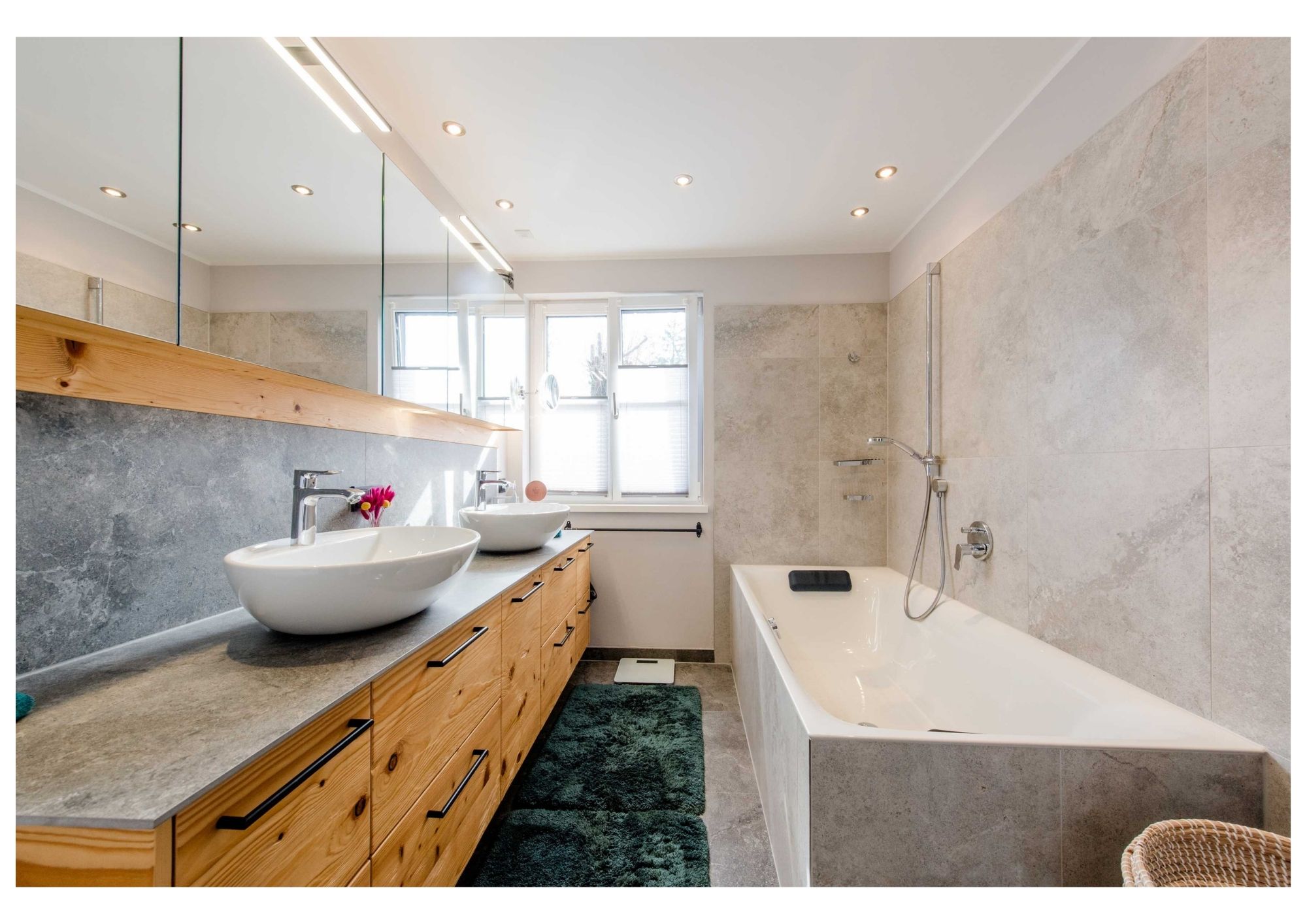 Das Hauptschlafzimmer mit raumhohen Einbauschränken bietet entspannte Ruhe, ergänzt durch ein weiteres Schlafzimmer mit Einbauschranksystem. Das elegante Badezimmer lässt keine Wünsche offen: Doppelwaschtisch mit Zirbenholz-Unterschrank, Badewanne, separate Dusche und stilvolle Beleuchtung schaffen eine private Wellnesszone. Ein Gäste-WC, ein helles Hobbyatelier sowie ein separates Arbeitszimmer erweitern das Raumangebot ideal für Homeoffice, Gäste oder kreative Nutzung.