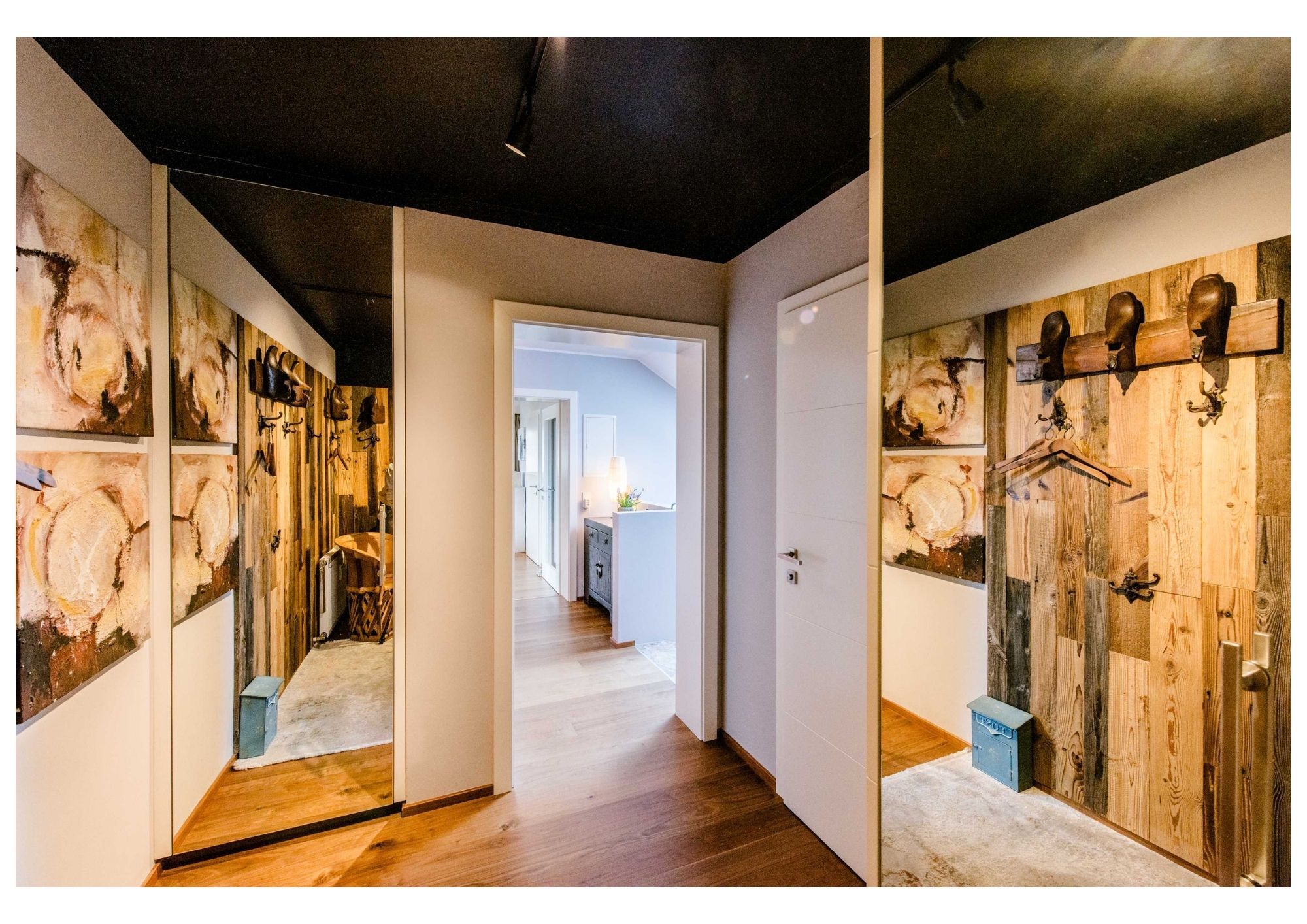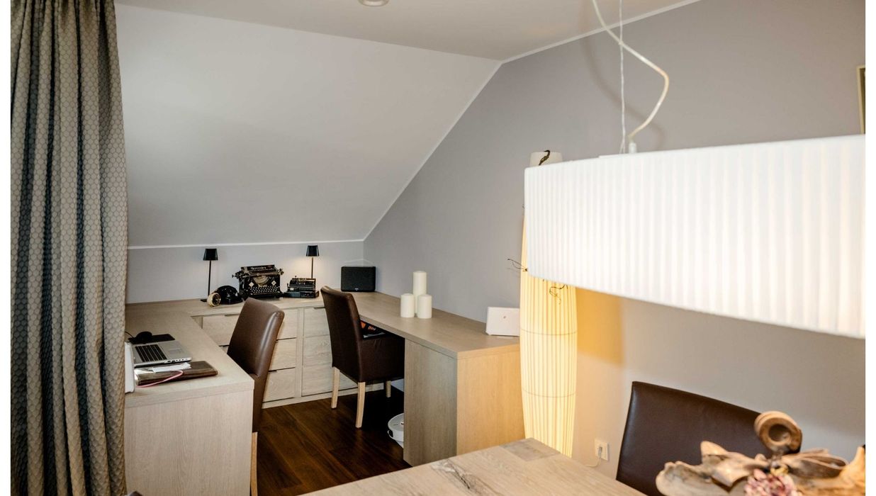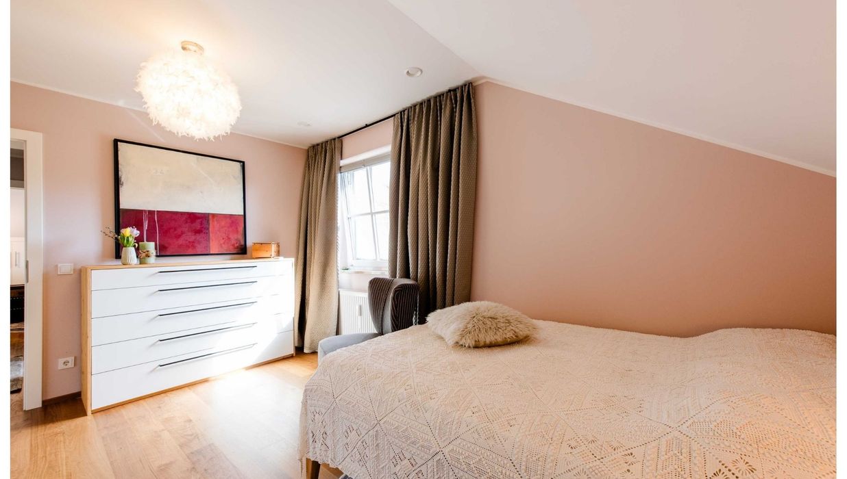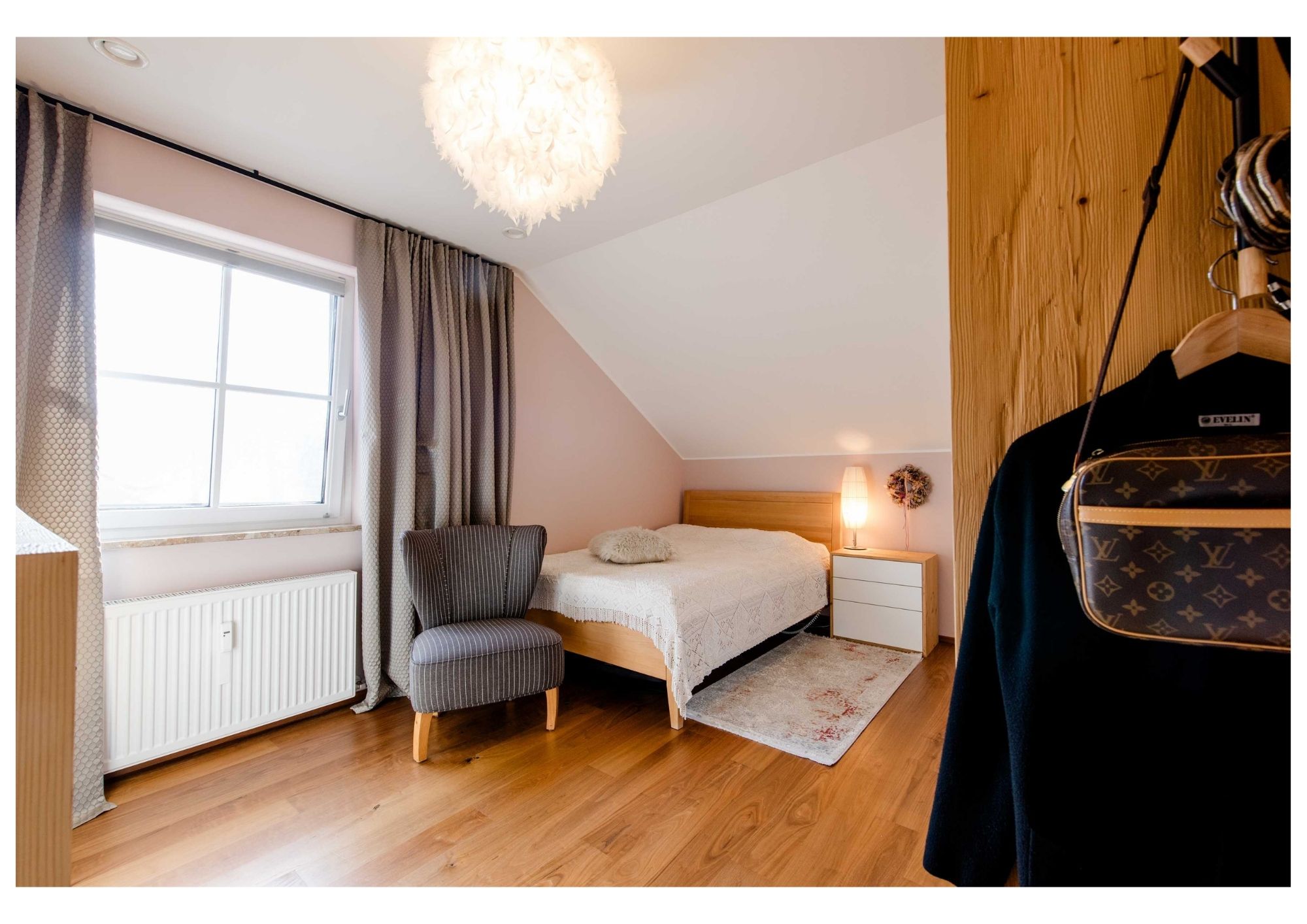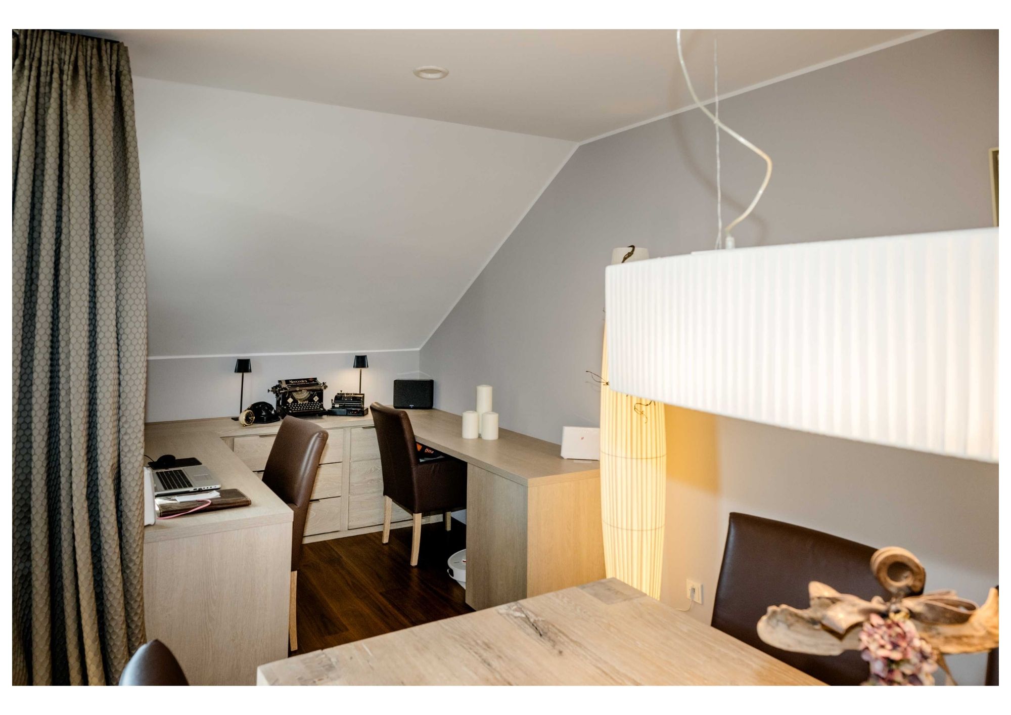 Das Hauptschlafzimmer mit raumhohen Einbauschränken bietet entspannte Ruhe, ergänzt durch ein weiteres Schlafzimmer mit Einbauschranksystem. Das elegante Badezimmer lässt keine Wünsche offen: Doppelwaschtisch mit Zirbenholz-Unterschrank, Badewanne, separate Dusche und stilvolle Beleuchtung schaffen eine private Wellnesszone. Ein Gäste-WC, ein helles Hobbyatelier sowie ein separates Arbeitszimmer erweitern das Raumangebot ideal für Homeoffice, Gäste oder kreative Nutzung.