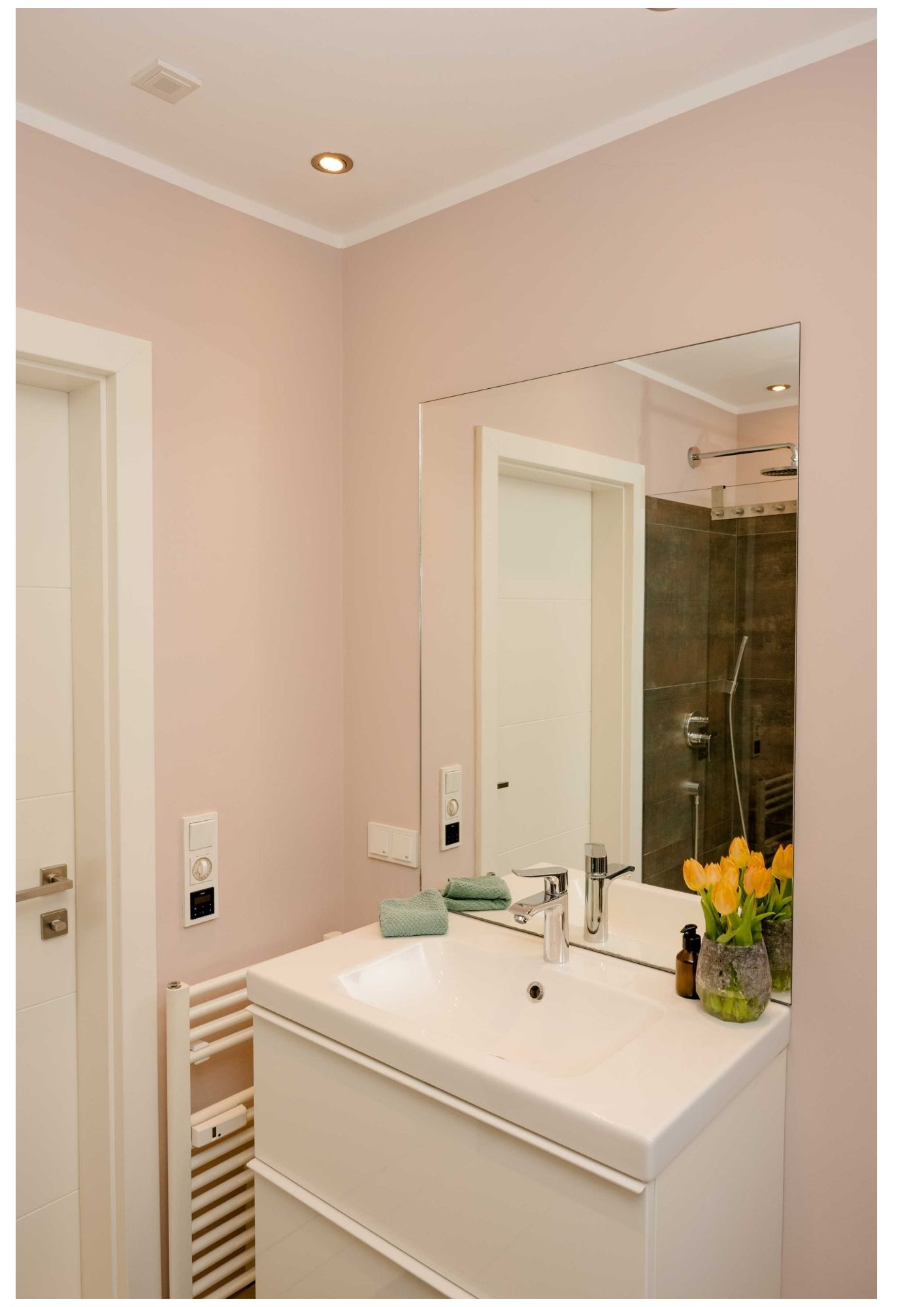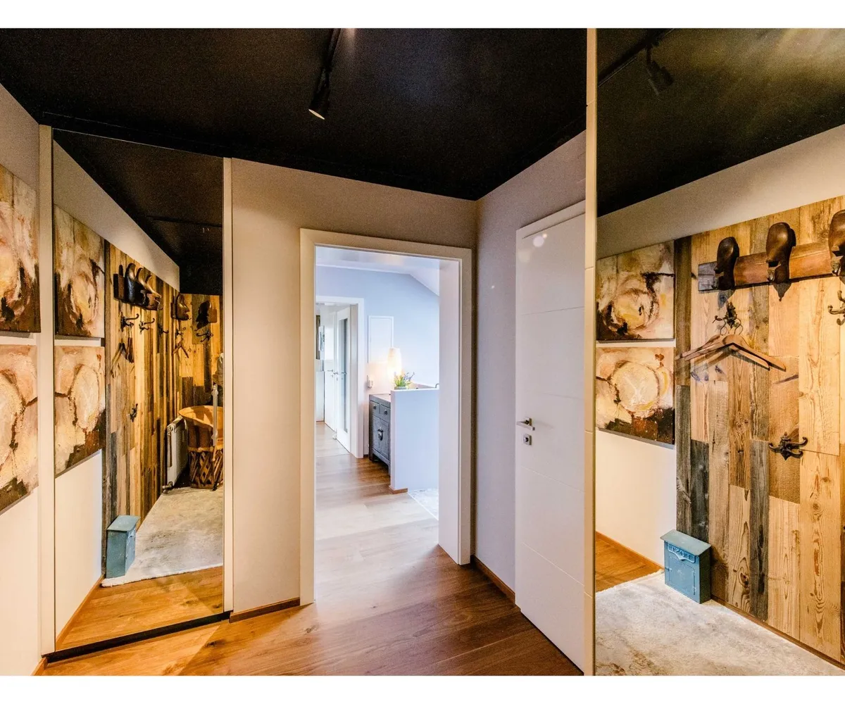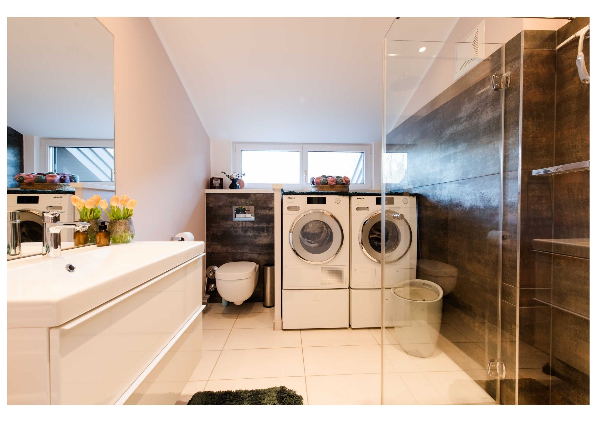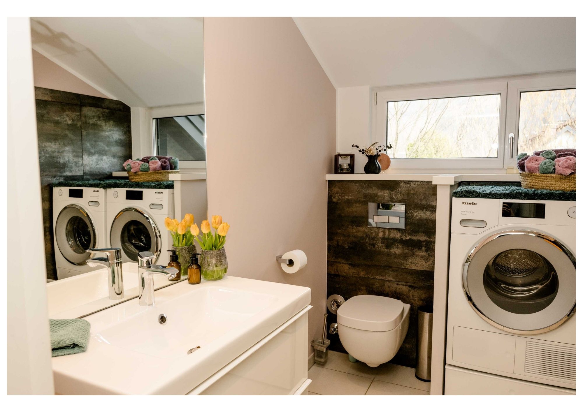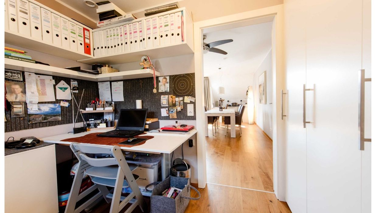 Das Hauptschlafzimmer mit raumhohen Einbauschränken bietet entspannte Ruhe, ergänzt durch ein weiteres Schlafzimmer mit Einbauschranksystem. Das elegante Badezimmer lässt keine Wünsche offen: Doppelwaschtisch mit Zirbenholz-Unterschrank, Badewanne, separate Dusche und stilvolle Beleuchtung schaffen eine private Wellnesszone. Ein Gäste-WC, ein helles Hobbyatelier sowie ein separates Arbeitszimmer erweitern das Raumangebot ideal für Homeoffice, Gäste oder kreative Nutzung.