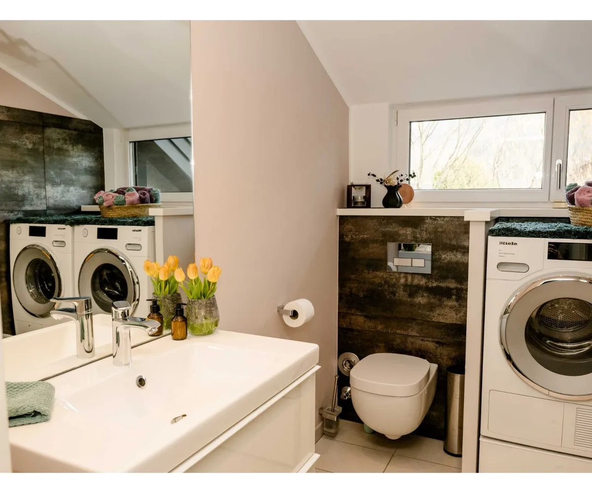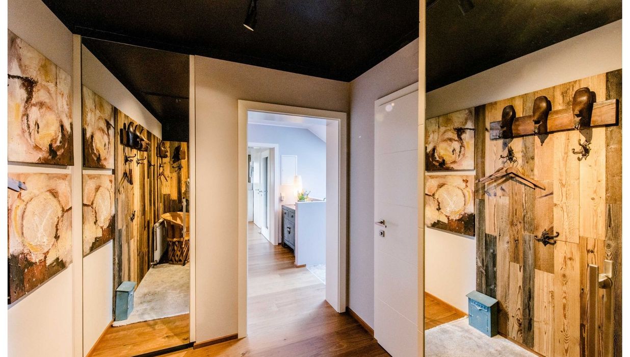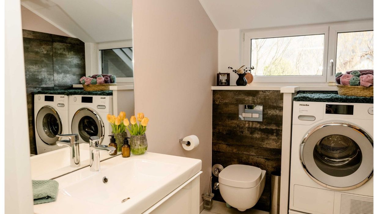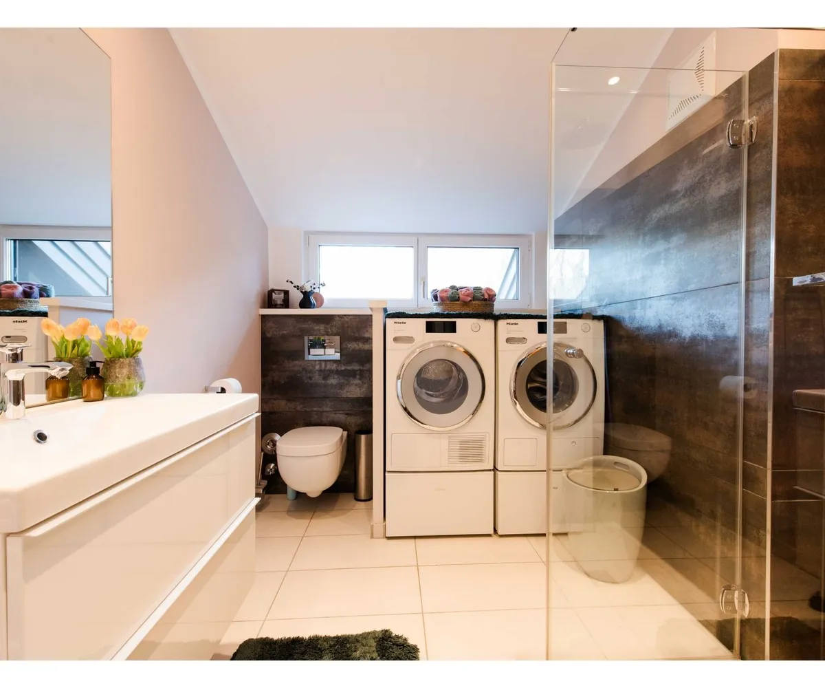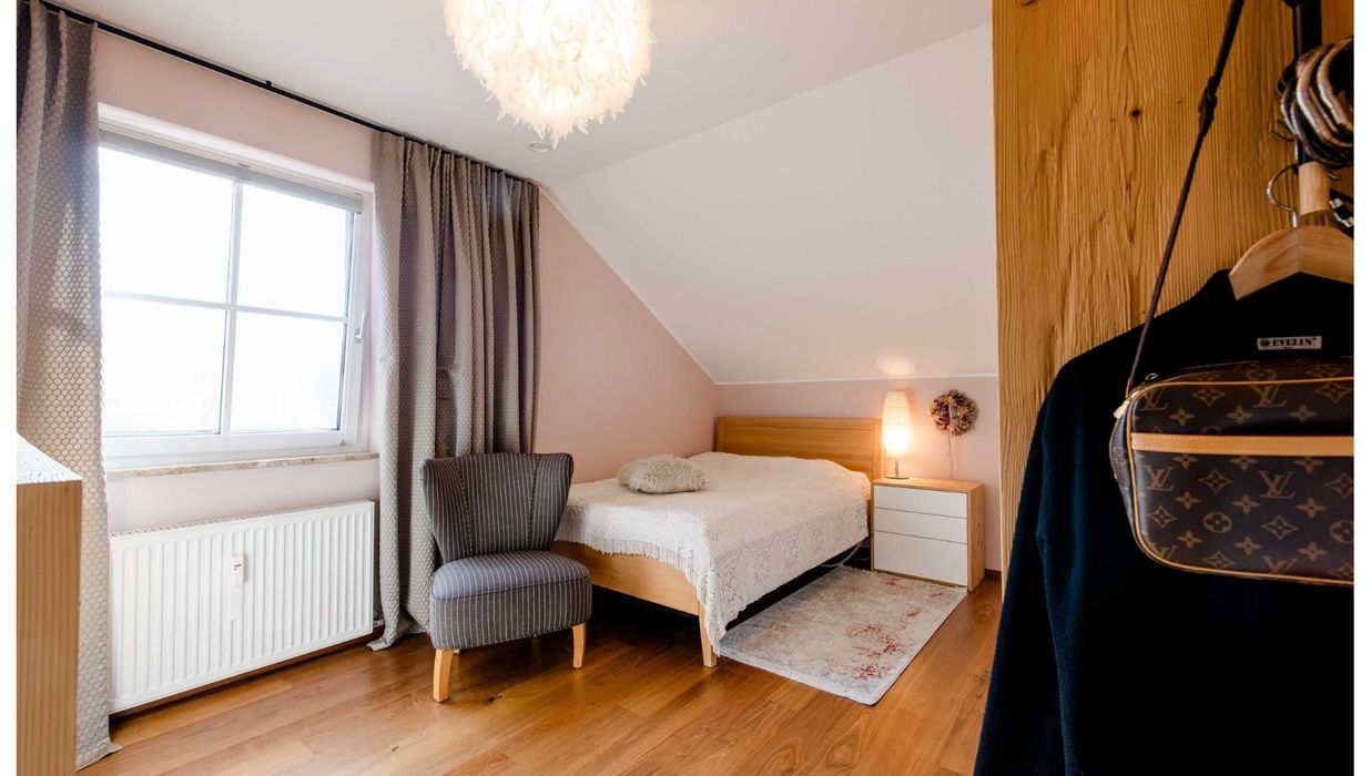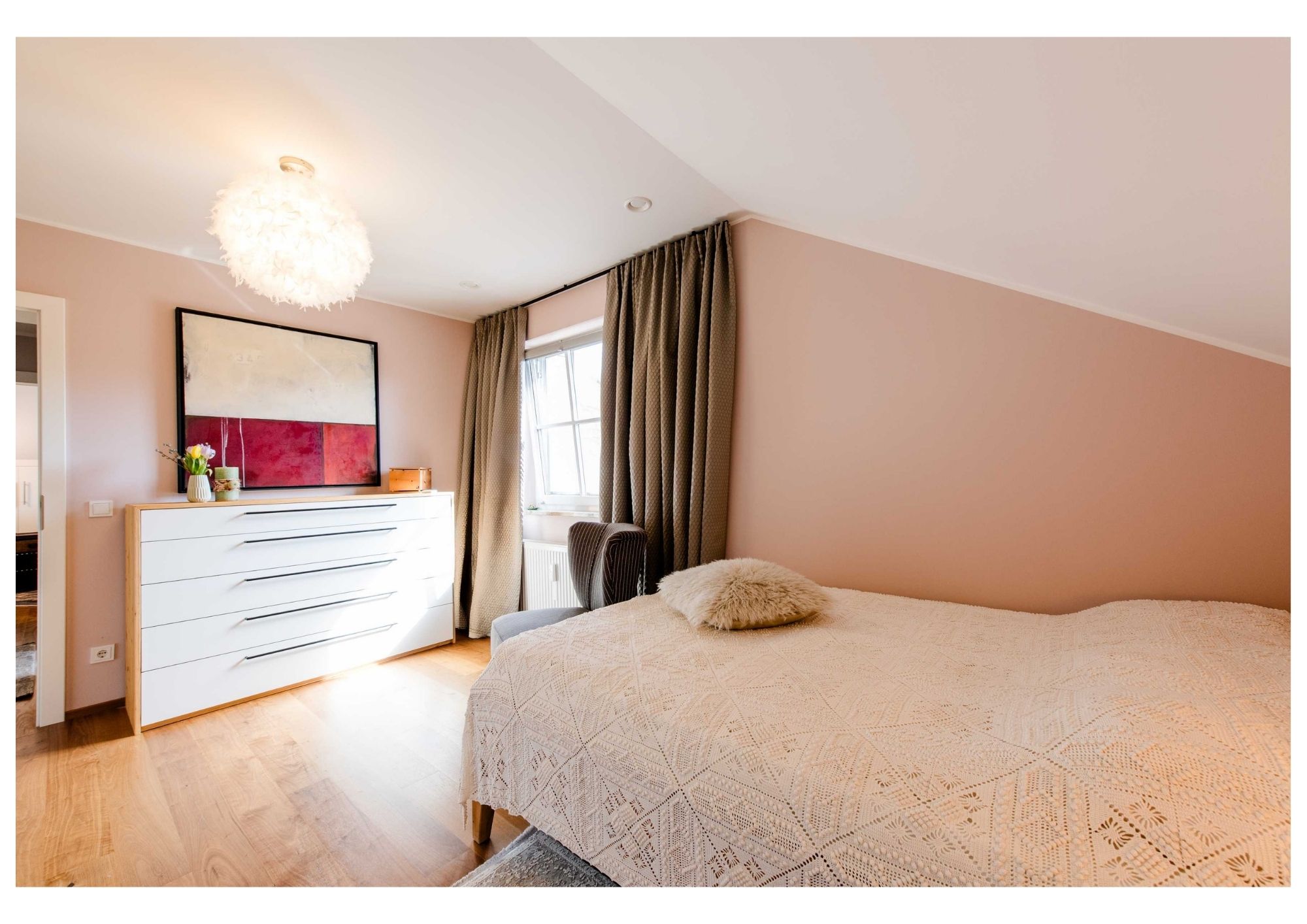 Das Hauptschlafzimmer mit raumhohen Einbauschränken bietet entspannte Ruhe, ergänzt durch ein weiteres Schlafzimmer mit Einbauschranksystem. Das elegante Badezimmer lässt keine Wünsche offen: Doppelwaschtisch mit Zirbenholz-Unterschrank, Badewanne, separate Dusche und stilvolle Beleuchtung schaffen eine private Wellnesszone. Ein Gäste-WC, ein helles Hobbyatelier sowie ein separates Arbeitszimmer erweitern das Raumangebot ideal für Homeoffice, Gäste oder kreative Nutzung.