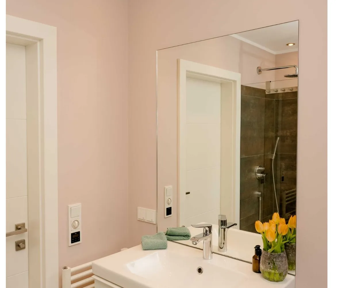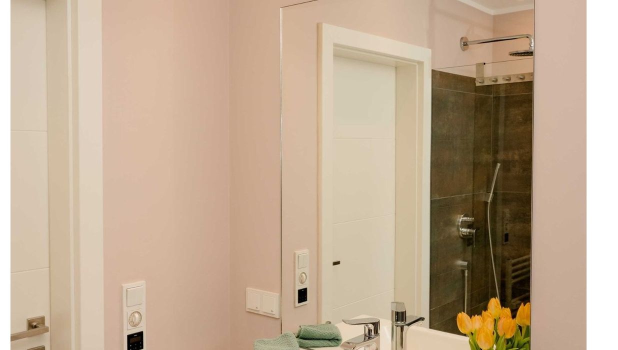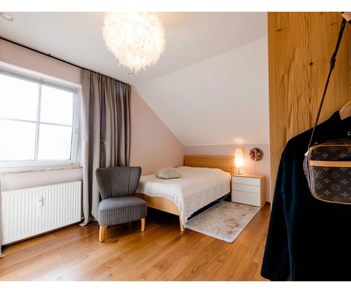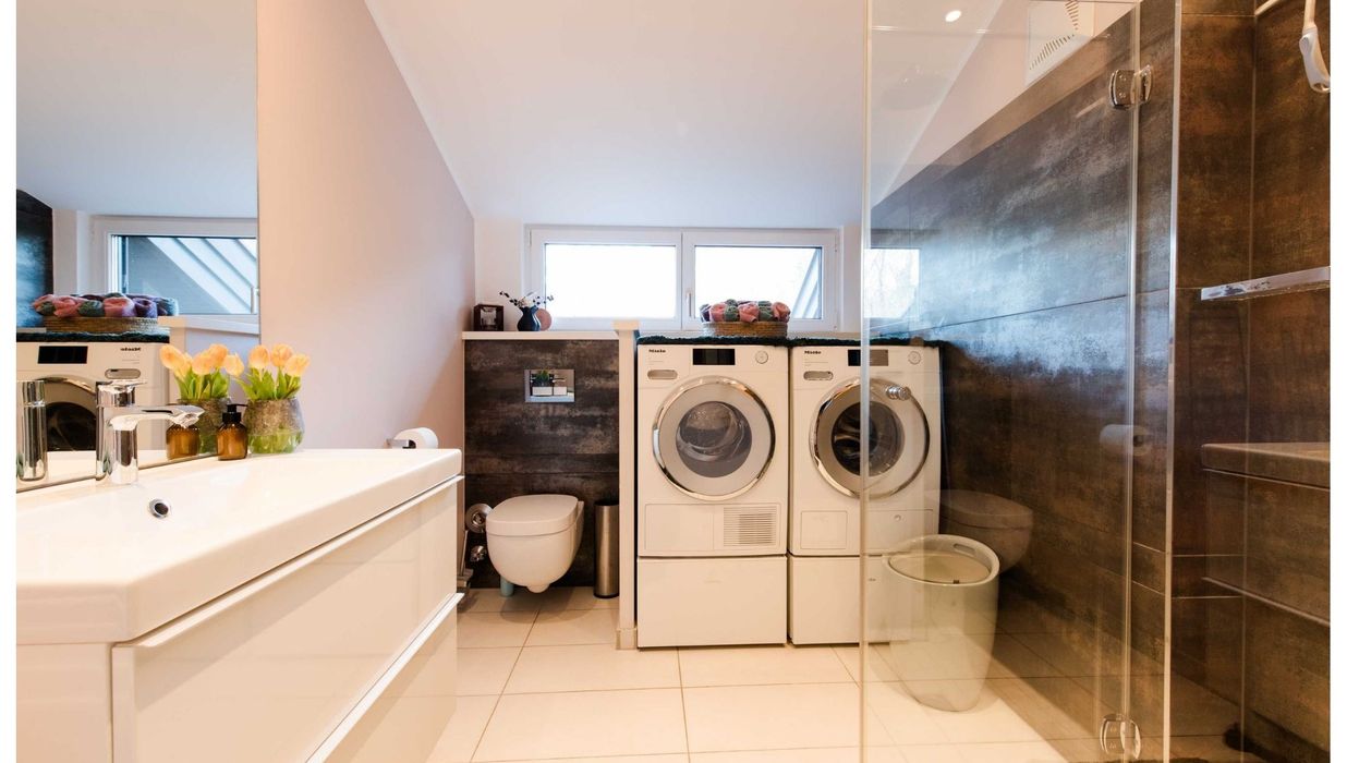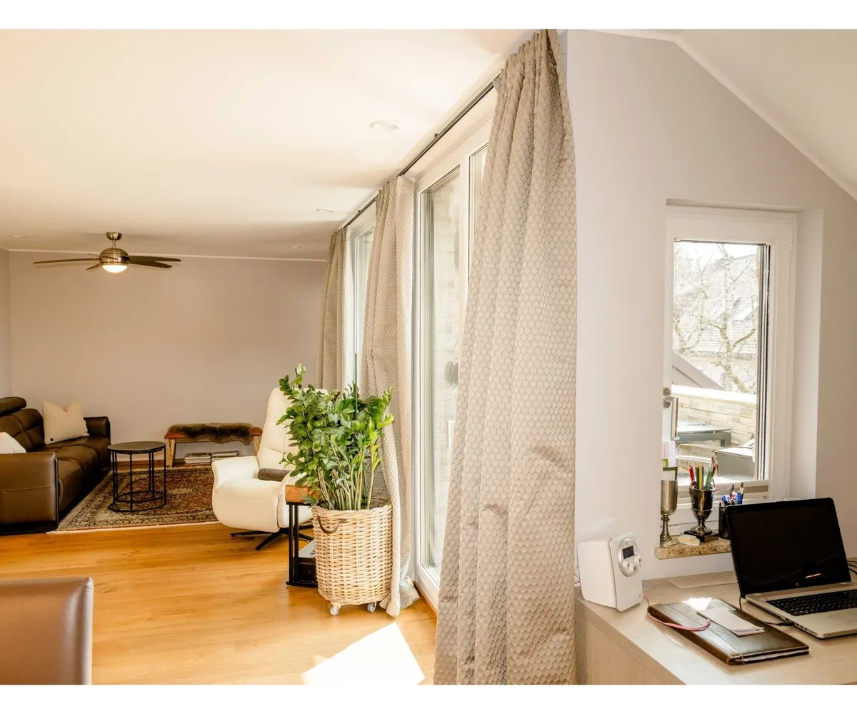Das Hauptschlafzimmer mit raumhohen Einbauschränken bietet entspannte Ruhe, ergänzt durch ein weiteres Schlafzimmer mit Einbauschranksystem. Das elegante Badezimmer lässt keine Wünsche offen: Doppelwaschtisch mit Zirbenholz-Unterschrank, Badewanne, separate Dusche und stilvolle Beleuchtung schaffen eine private Wellnesszone. Ein Gäste-WC, ein helles Hobbyatelier sowie ein separates Arbeitszimmer erweitern das Raumangebot ideal für Homeoffice, Gäste oder kreative Nutzung.