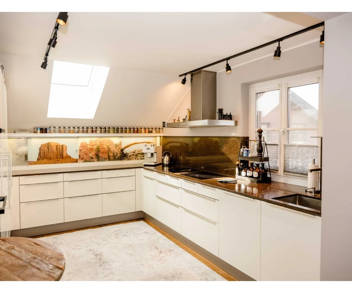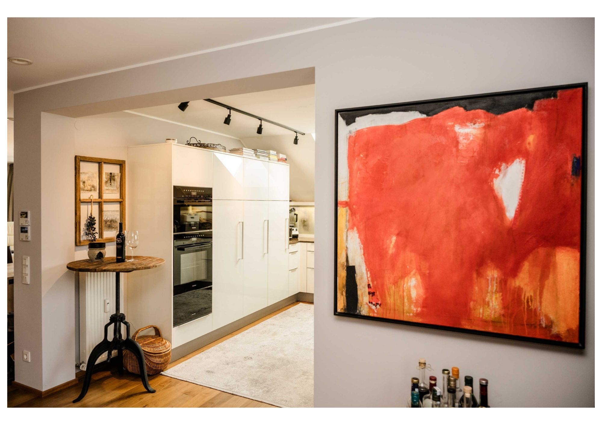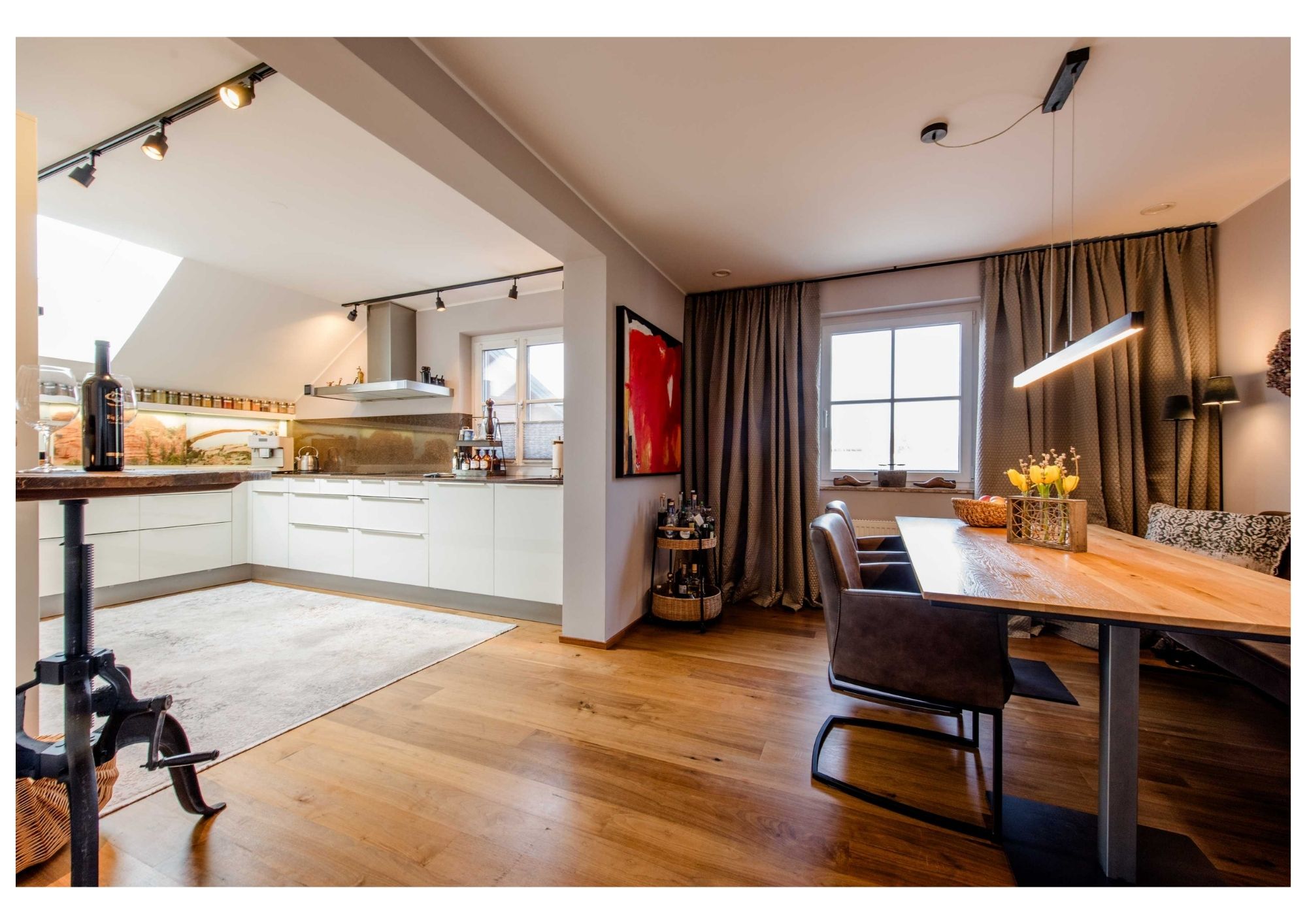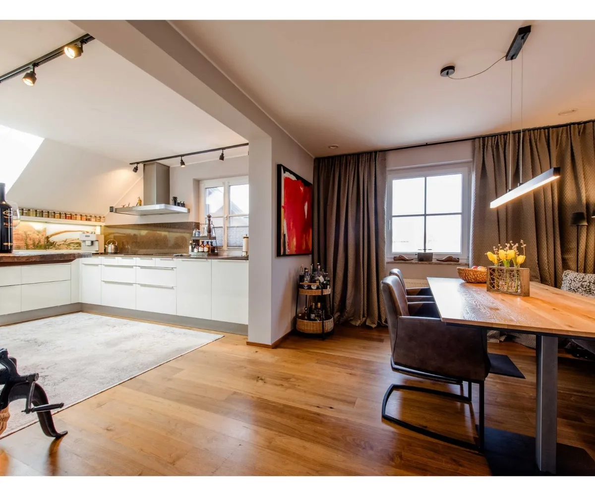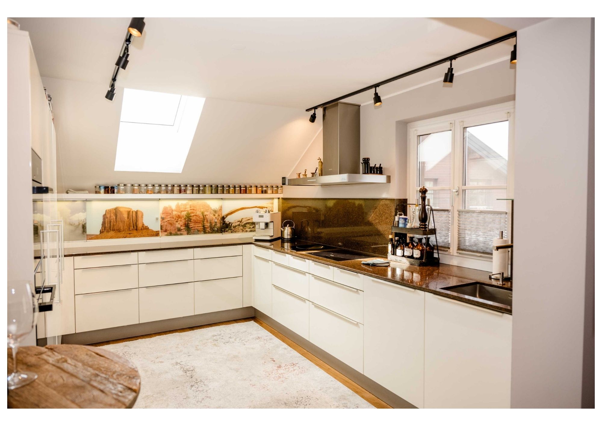Auf rund 162 m² Wohnfläche erwartet Sie eine vollständig sanierte, zentral begehbare 4-Zimmer-Wohnung mit außergewöhnlichem Raumgefühl. Der großzügige Wohn- und Essbereich mit edlem Eichenparkett, Kaminofen und direktem Zugang zum Balkon bildet das Herzstück der Wohnung. Die offene Designerküche mit weißen Hochglanzfronten, dunkler Granitarbeitsplatte und stimmungsvollem Glasrückwand-Panorama ist hochwertig ausgestattet und sofort nutzbar.