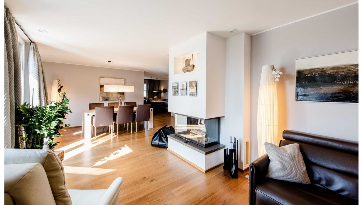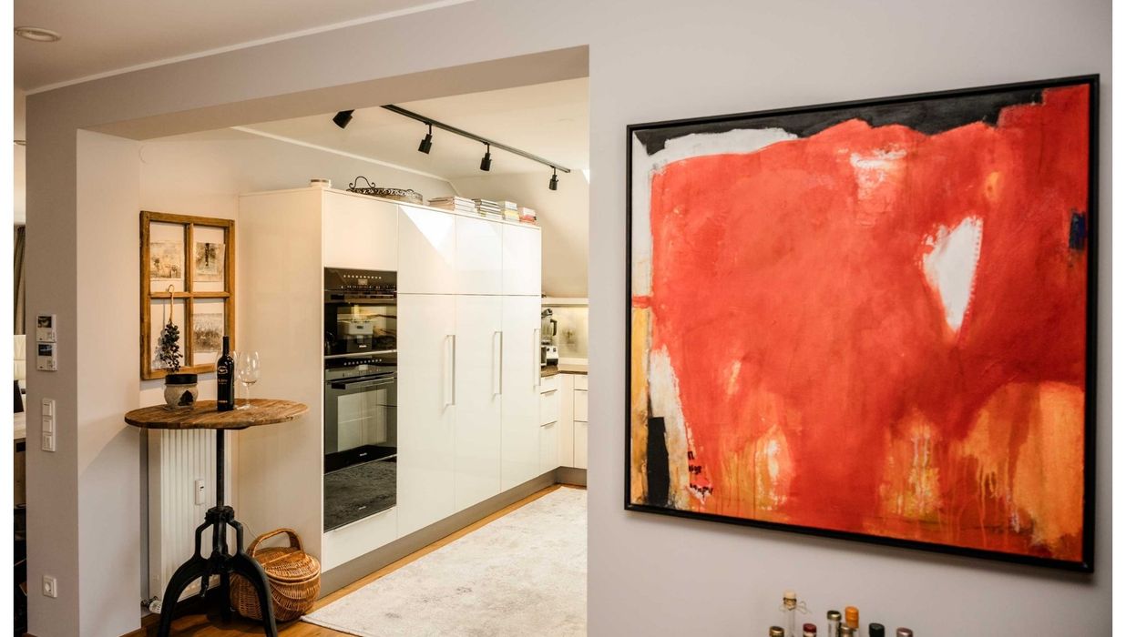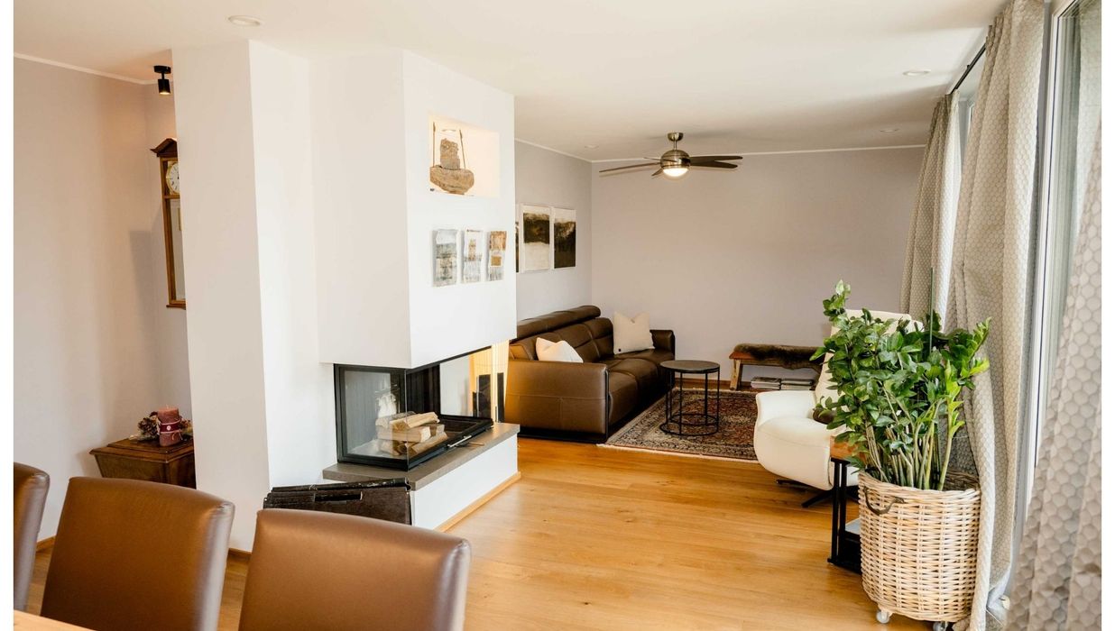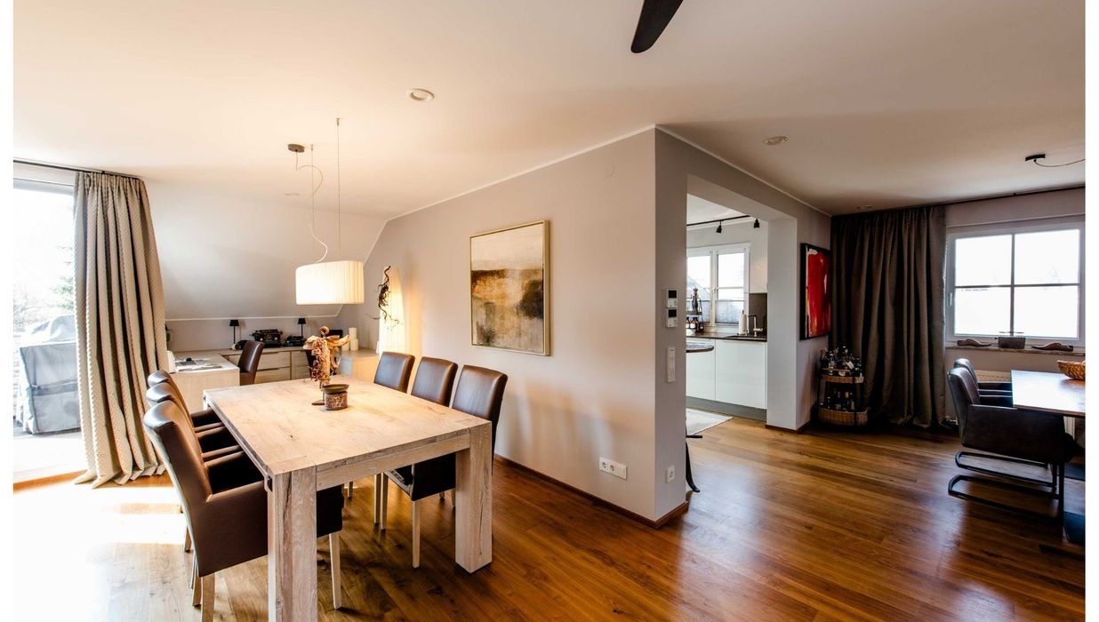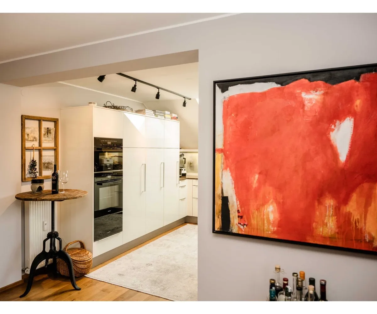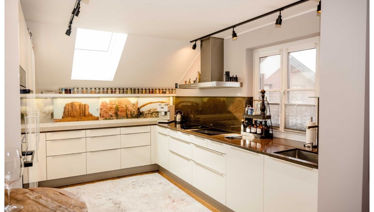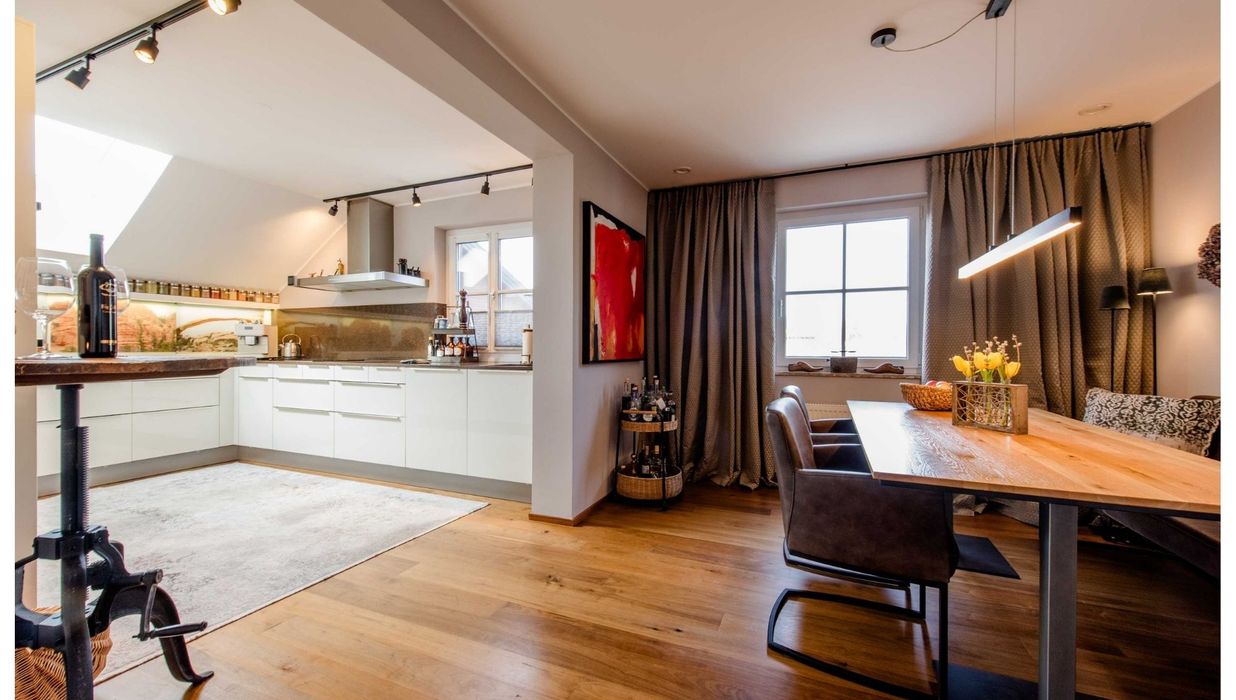 Auf rund 162 m² Wohnfläche erwartet Sie eine vollständig sanierte, zentral begehbare 4-Zimmer-Wohnung mit außergewöhnlichem Raumgefühl. Der großzügige Wohn- und Essbereich mit edlem Eichenparkett, Kaminofen und direktem Zugang zum Balkon bildet das Herzstück der Wohnung. Die offene Designerküche mit weißen Hochglanzfronten, dunkler Granitarbeitsplatte und stimmungsvollem Glasrückwand-Panorama ist hochwertig ausgestattet und sofort nutzbar.