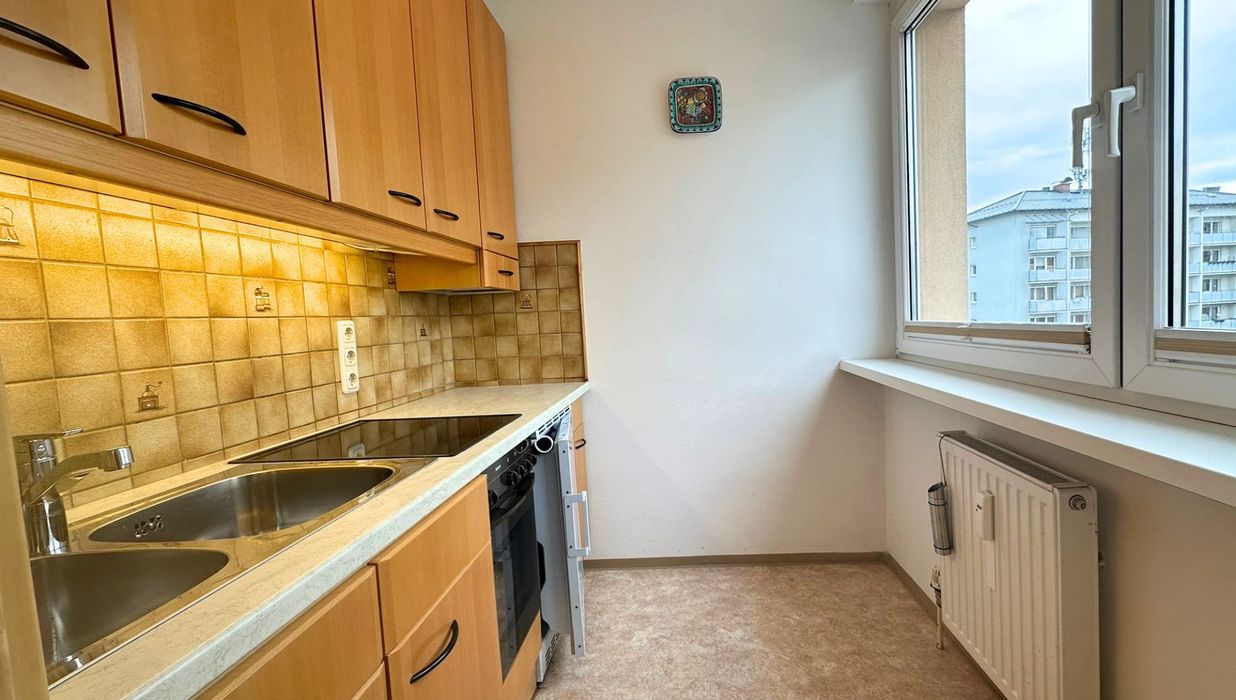 Von hier zentral begehbar: Bad, WC, separate ausgestattete Küche und ca. 18 qm Wohnraum. Im Wohnbereich ist ausreichend Platz für ein Bett oder eine Schlafcouch, einen kleinen Essbereich oder Schreibtisch.