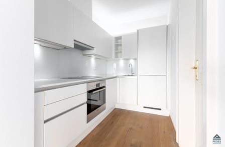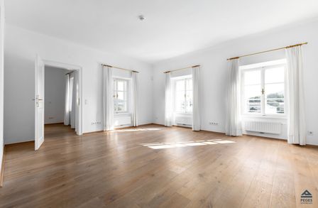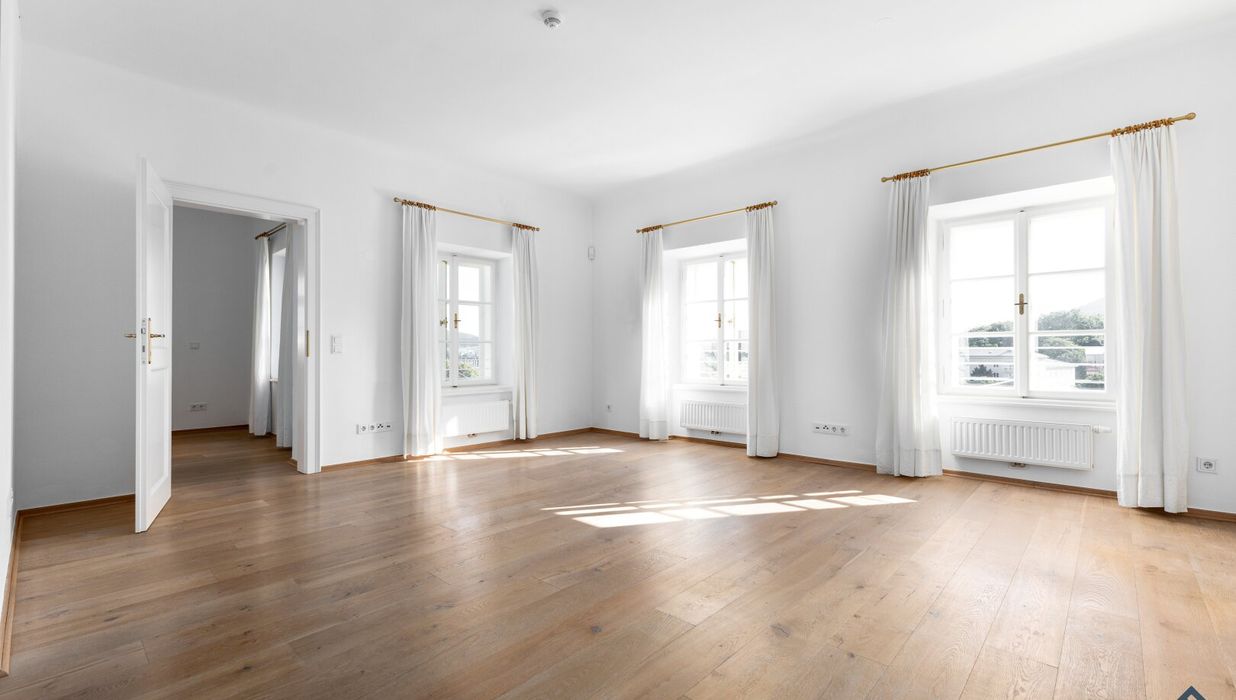 Bereits die Gestaltung des Eingangsbereichs und des Innenhofs mit sternförmigem Brunnen lässt viel Liebe zum Detail und Bedachtnahme auf die Erhaltung und denkmalgerechte Pflege des historischen Bestands erkennen. In der Wohnung selbst sorgen edle Landhausdielen in Eiche in den Wohnräumlichkeiten für ein angenehmes Wohnambiente, während im Abstellraum und Sanitärbereichen auf Naturstein in Untersberger Marmor gesetzt wird. Kastenstockfenster nach historischem Vorbild sorgen für ein besonderes Flair.