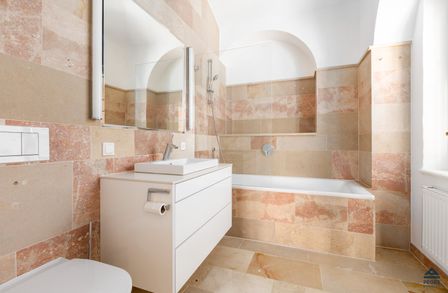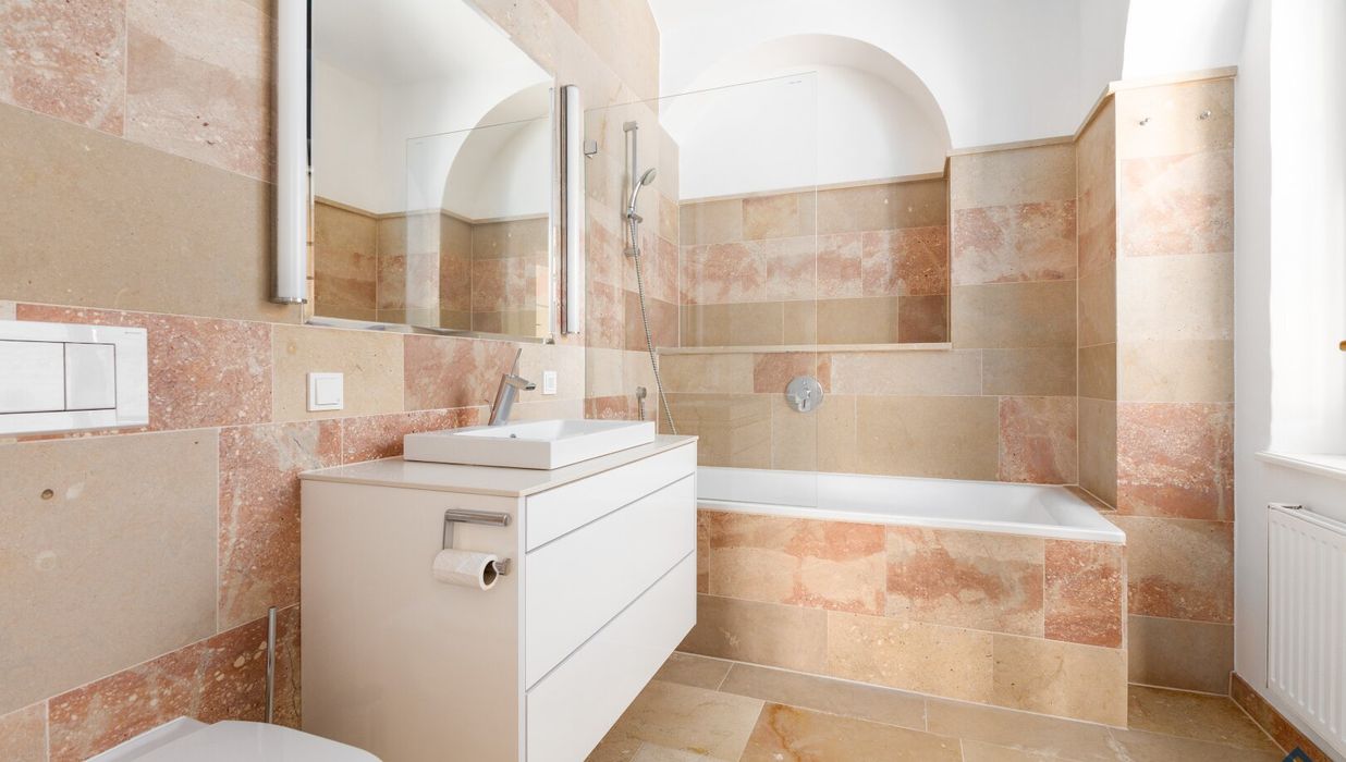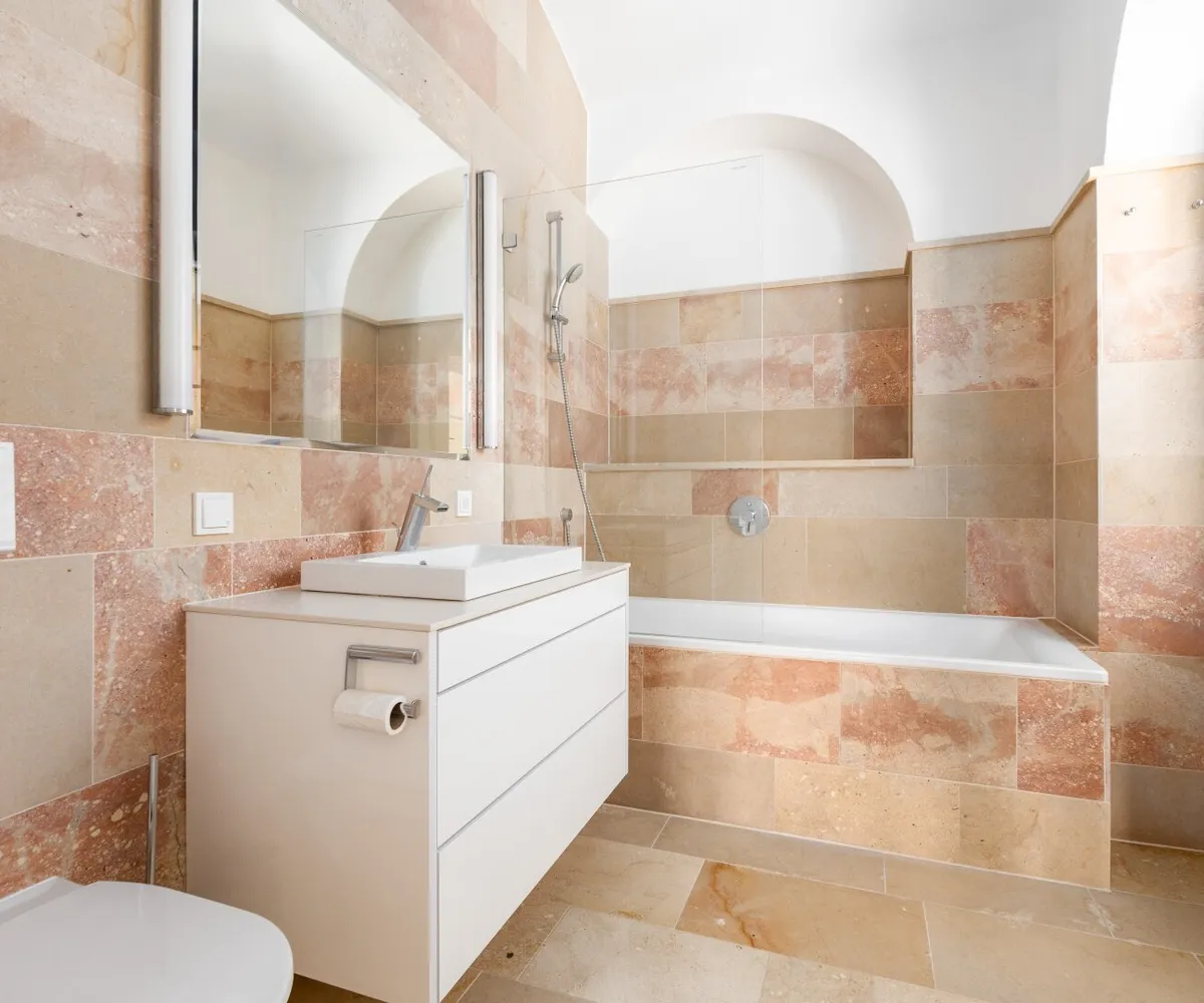 Modern und mit hochwertiger Ausstattung präsentiert sich auch das taghelle Badezimmer samt WC, das sowohl mit einer schönen Badewanne samt Glasduschabtrennung und edlem Waschtisch ausgestattet ist. Ein Sprossenheizkörper bietet die Möglichkeit zur zusätzlichen Raumbeheizung. Naturstein und helle Farben sorgen für einen eleganten Kontrast.