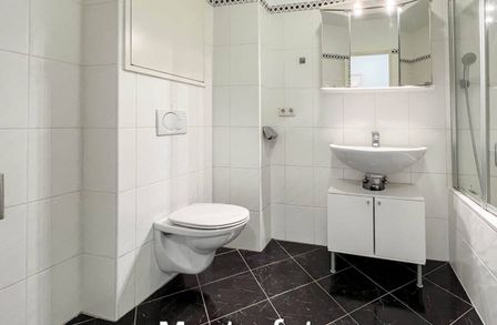 - Badezimmer mit Badewanne, WC und Waschmaschinenanschluss