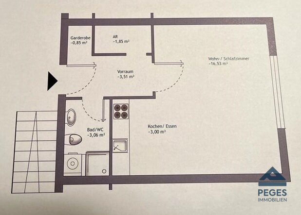 Raumaufteilung: Vorraum, Bad (mit Dusche und Waschmaschinen-Anschluss)/ WC, Abstellraum, Wohn-/Schlafraum mit Küchenzeile ; Kellerabteil, PKW-Stellplatz allgemein vor dem Wohnhaus