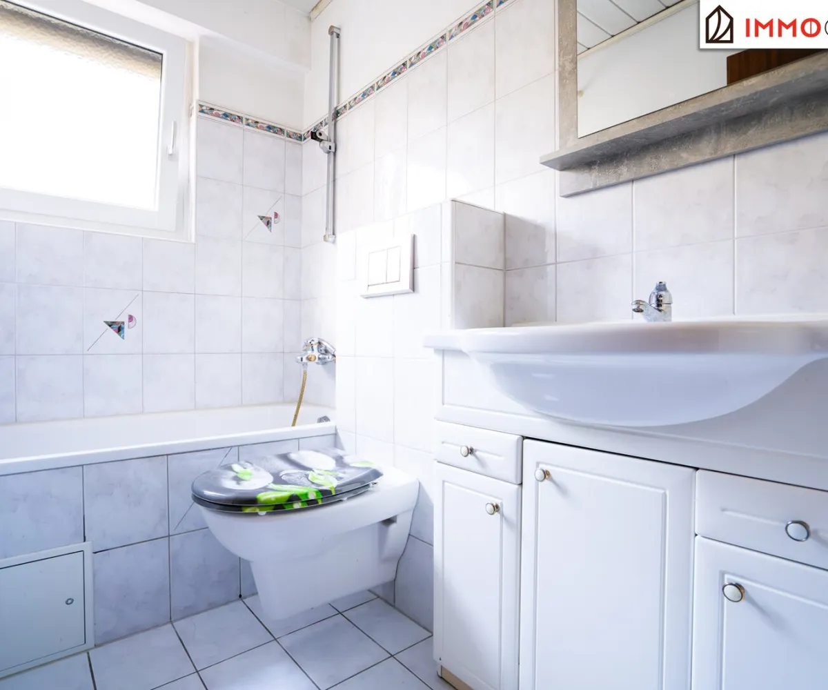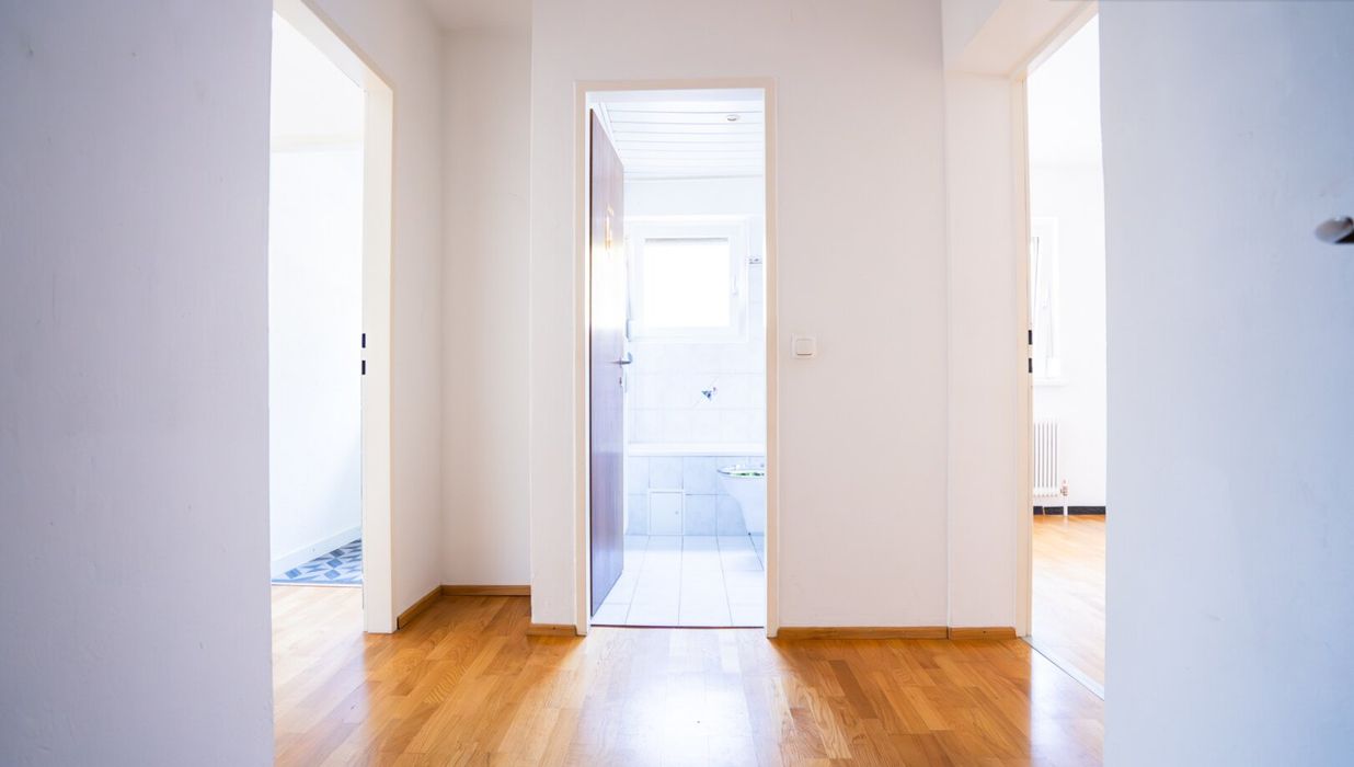 Schon beim Eintreten empfängt Sie ein harmonisch geschnittener Grundriss, der Privatsphäre und Offenheit zugleich schafft. Rechter Hand liegt das Schlafzimmer – ein ruhiger Rückzugsort mit Fenster in eine grüne Oase. Der großzügige Flur verbindet alle Räume zentral und bietet Platz für Garderobe oder stilvolle Akzente. Gegenüber liegt das Badezimmer mit Badewanne, WC, Fenster und gepflegter Ausstattung, ein seltener Komfort in dieser Wohnkategorie.