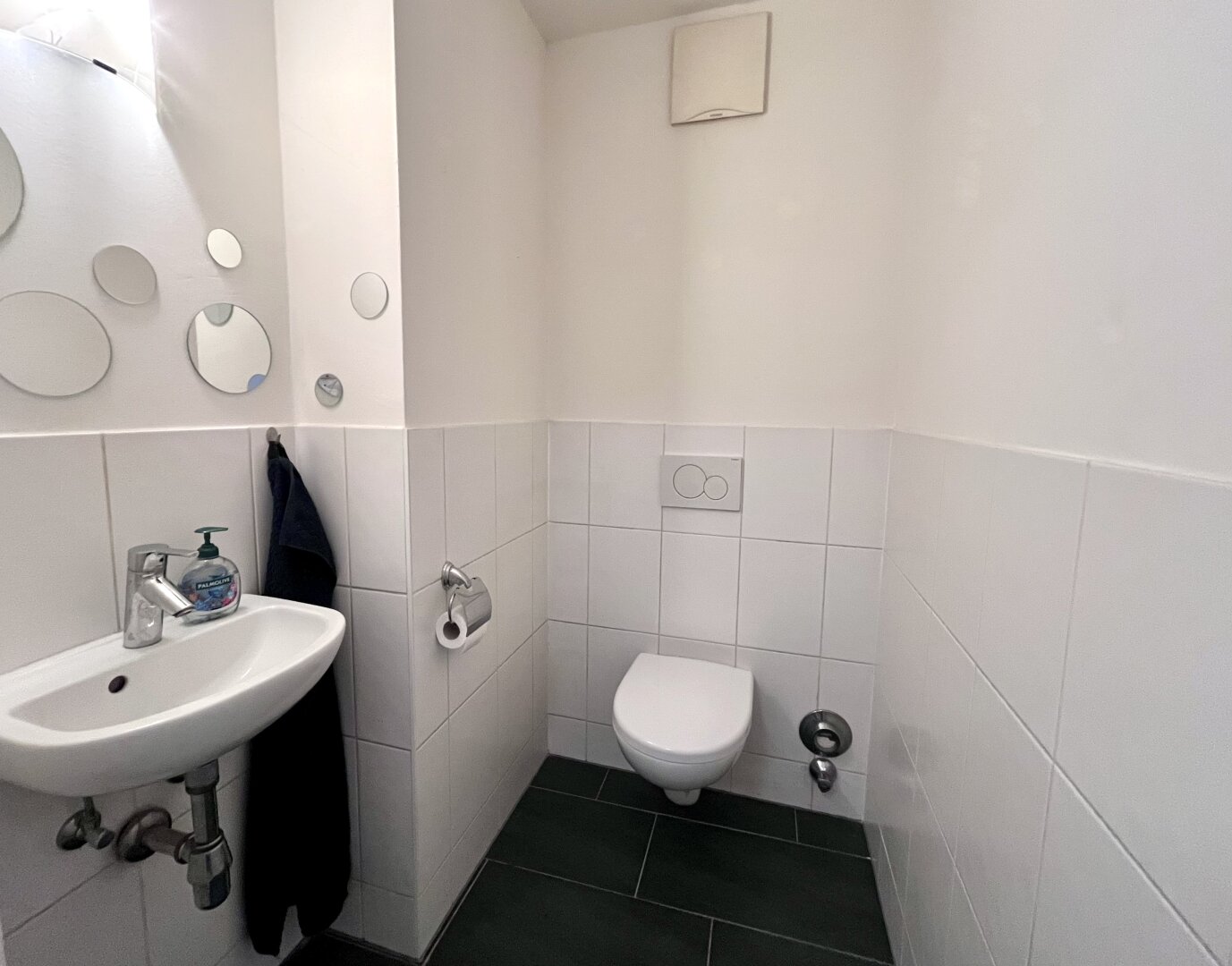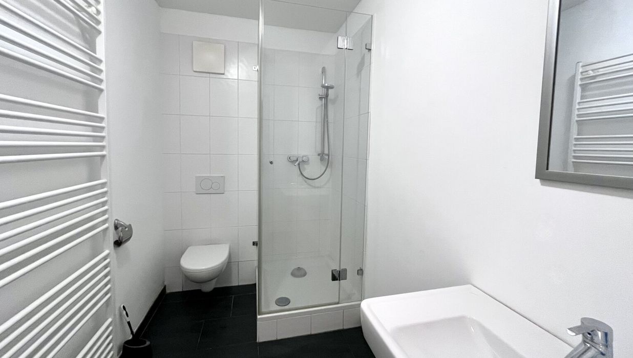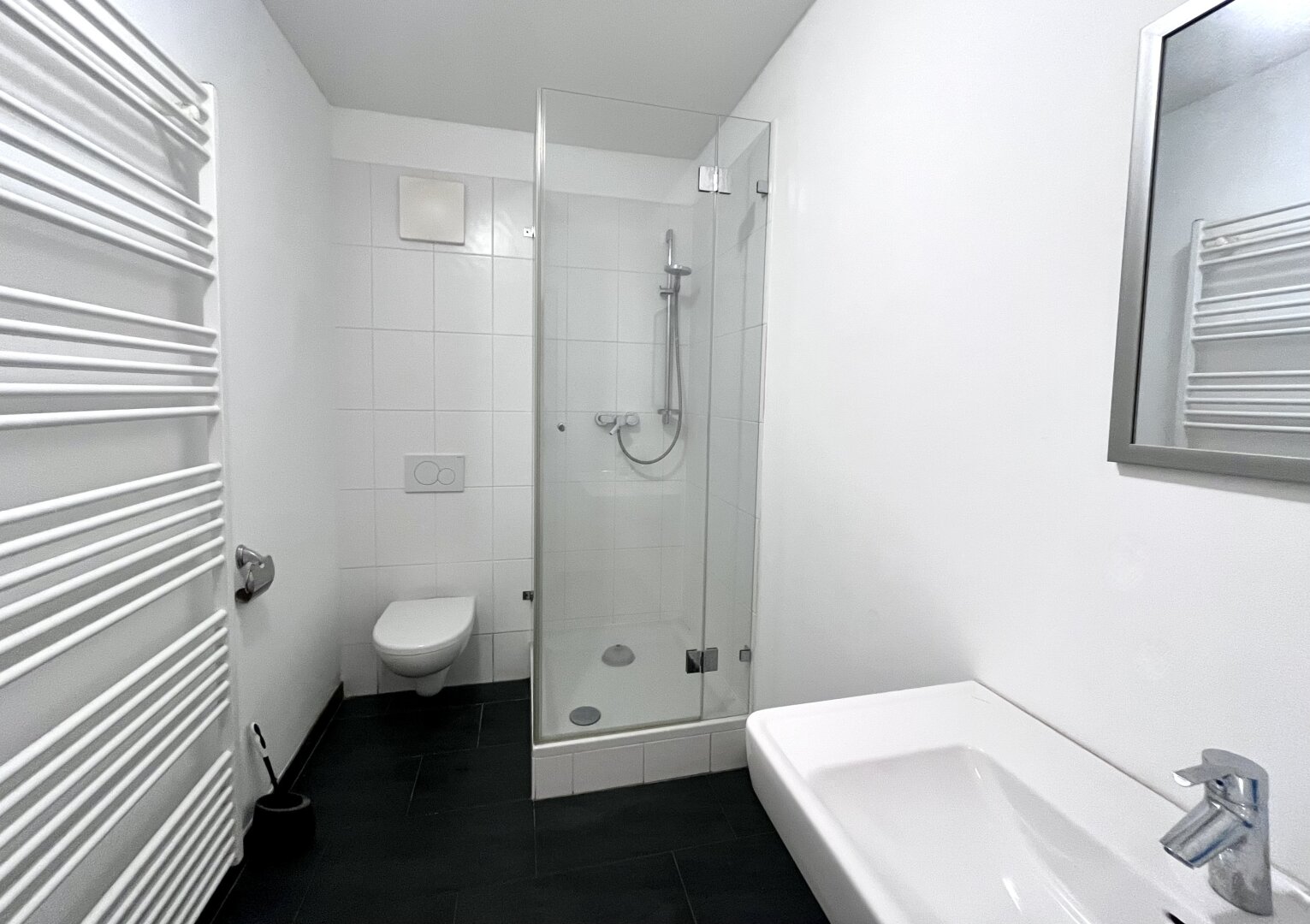 Im unteren Bereich der Wohnung steht ein weiteres Badezimmer mit Dusche und Toilette, sowie ein weiterer Raum zur Verfügung, der sich flexibel als Schlafzimmer oder Homeoffice nutzen lässt.