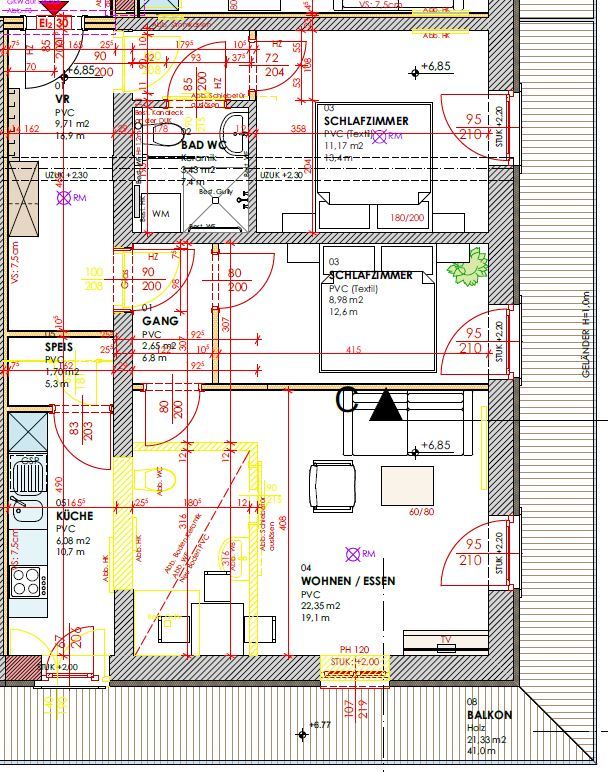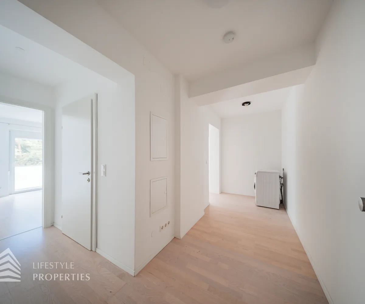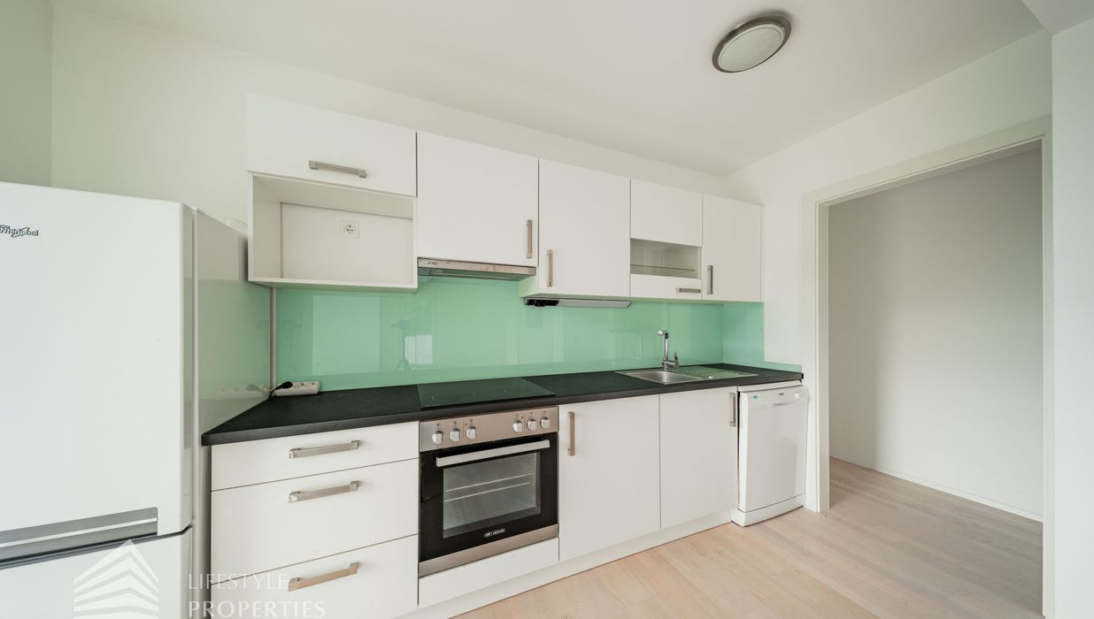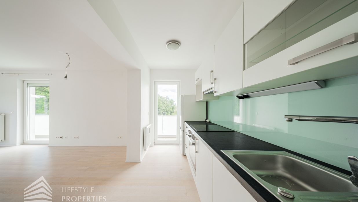Die Immobilie befindet sich im 2. OG eines vierstöckigen Gebäudes und hat ca. 66,07 m². Sie betreten die praktisch aufgeteilte 3-Zimmer Wohnung und gelangen in einen geräumigen Vorraum mit ca. 9,71 m². Dieser bietet aufgrund seiner Größe ausreichend Platz für jegliche Garderobe. Unmittelbar auf der linken Seite finden Sie zwei Türen, welche zum Badezimmer und zum ersten Schlafzimmer der Wohnung führen. Das Badezimmer verfügt über eine Dusche, eine Toilette und einen Waschmaschinenanschluss. Das Schlafzimmer ist ca. 11,17 m² groß. Am Ende des Vorraumes führt eine weitere Tür zu einem Gang, welcher sowohl in die Wohnküche als auch zum zweiten Schlafzimmer führt. Letzteres hat ca. 8.98 m², die Wohnküche ca. 22,35 m². Die Küche ist vom Wohnbereich des Zimmers räumlich gut abgegrenzt. Eine Tür in der Küche führt zu einem kleinen aber praktischen Abstellraum, welcher sich ideal als Speisekammer anbietet. Sowohl die beiden Schlafzimmer, als auch die Wohnküche, haben einen eigenen Zugang zu dem großartigen, ca. 21,33 m² großen Balkon. Dieser stellt ohne Zweifel mit seinem Blick ins Grüne das Highlight der wunderbaren Wohnung dar. Sämtliche Zimmer sind mit einem wunderschönen Parkettboden, das Badezimmer mit hochwertigen Fliesen verlegt.