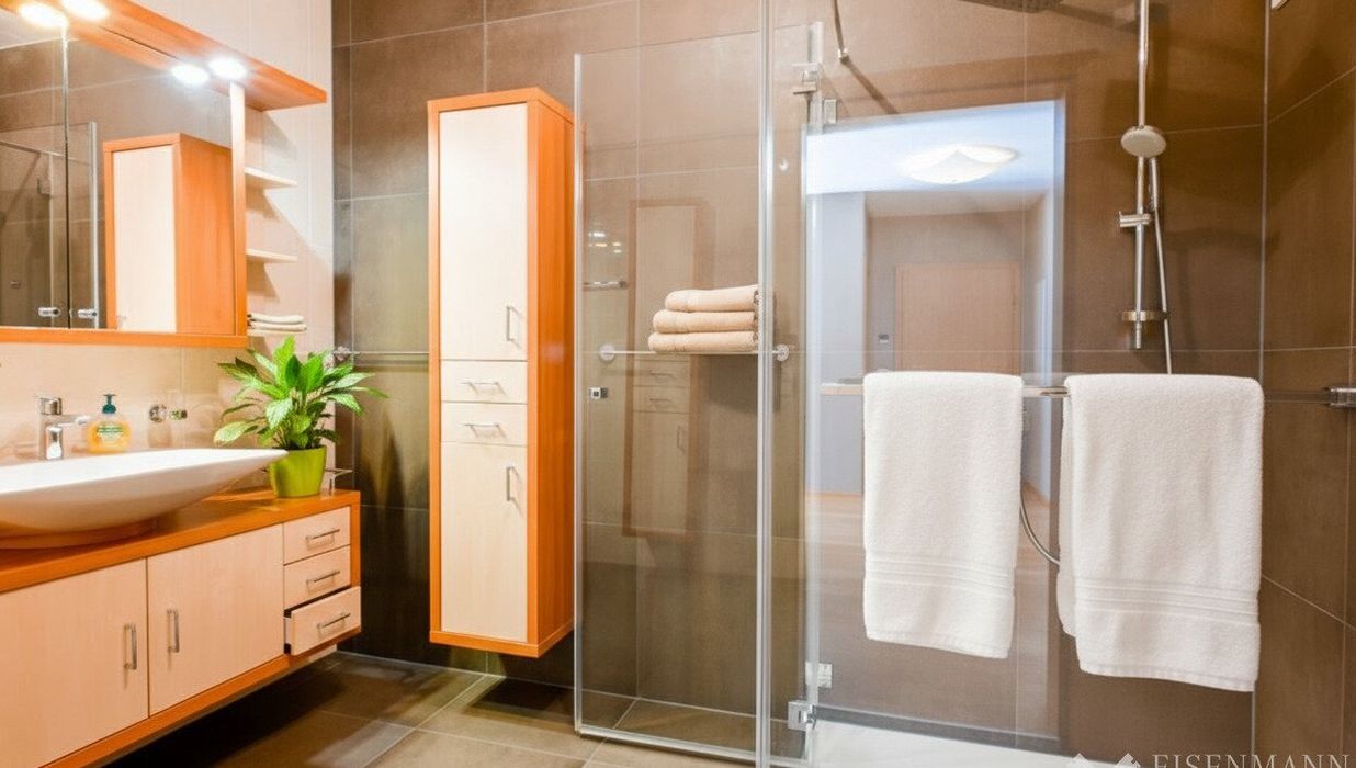 Von hier gelangen Sie in die offenen Bereiche: der lichtdurchflutete Wohn- und Essbereich bildet das Herzstück dieser besonderen Penthouse-Wohnung. Die maßgefertigte Einbauküche besticht durch ihr zeitloses Design und ist mit erstklassigen Geräten ausgestattet. Eine direkt angeschlossene Speisekammer bietet zusätzlichen Stauraum. Von der Küche sowie vom Wohnbereich aus gelangen Sie auf die großzügige Terasse , die durch ihre Südwest-Ausrichtung zu jeder Tageszeit den perfekten Sonnenplatz bietet. Die zwei Schlafzimmer sind nach Norden ausgerichtet, dies sorgt auch an heißen Sommertagen für ein angenehm kühles Raumklima . Das modern gestaltete Badezimmer ist mit Dusche und Waschtisch ausgestattet. Anschlüsse für Waschmaschiene und Trockner sind platzsparend integriert. Das WC ist vom Badezimmer getrennt und befindet sich gleich nach dem Eingangsbereich. In allen Wohnräumen garantiert ein hochwertiger Parkettboden eine warme und behagliche Atmosphäre. Eine energieeffiziente Fußbodenheizung sorgt in der gesamten Wohnung für gleichmäßige Wärme und maximale Freiheit bei der Möbilierung. Alle Wohn- und Schlafräume sind mit elektrischen Rolläden ausgestattet, die eine bequeme Steuerung des Lichteinfalls und der Privatsphäre ermöglichen.