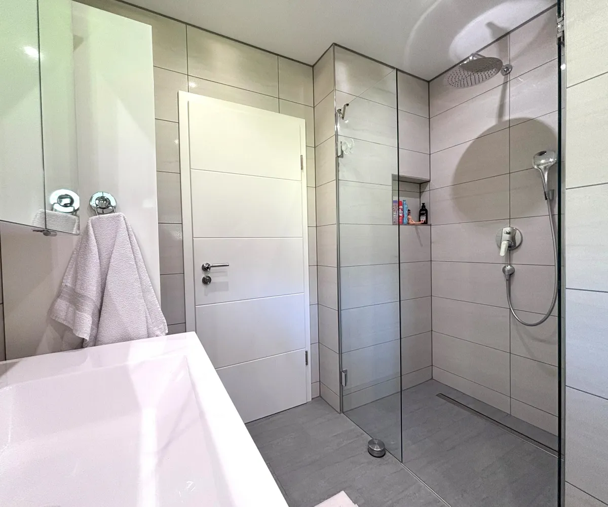Stilvolles Badezimmer mit großer, begehbarer Dusche