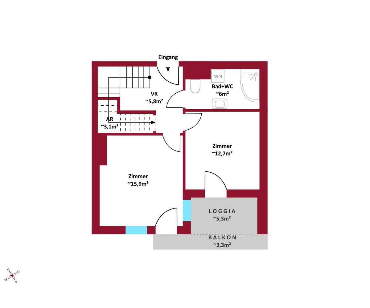 Auf einer Wohnfläche von ca. 88 m² erstreckt sich über zwei Etagen die folgende Raumaufteilung: