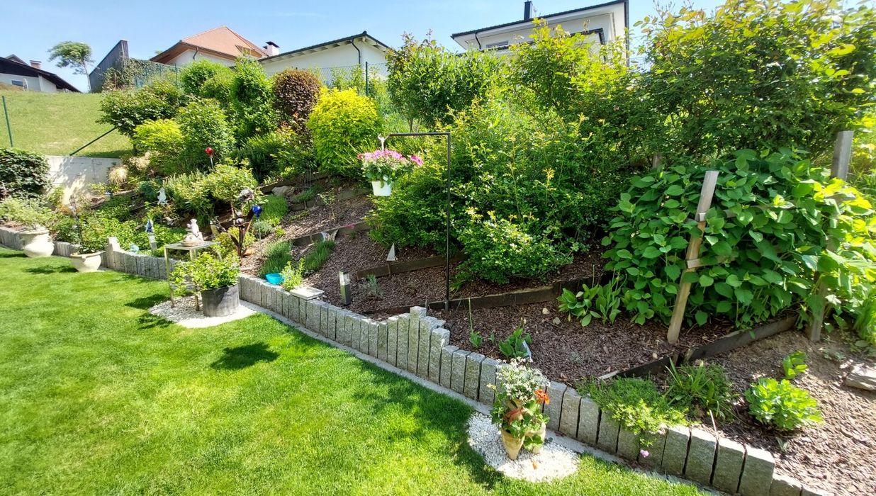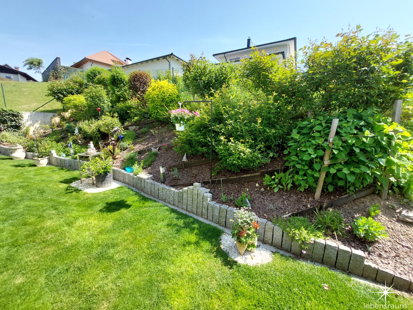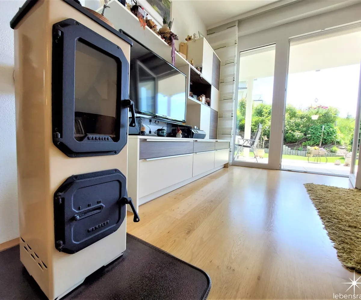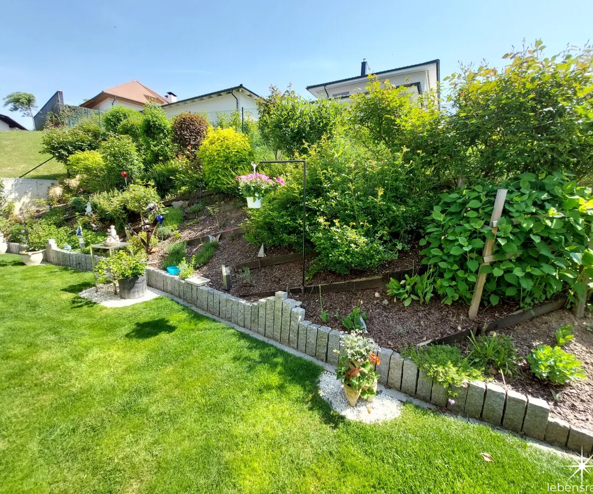 Die offene Wohnküche mit Dan-Markenküche und Miele Einbaugeräten geht fließend in den Wohnbereich mit stylischem Holzofen inkl. Feuerkegelsichtfenster über, von welchem man direkt auf die schöne Terrasse und in den gepflegten Garten gelangt. Die ebene Gartenanlage mit separatem Blumengarten genießt hohe, uneinsehbare Privatsphäre und bietet großzügige Möglichkeiten zum Relaxen und Grillen. Bestehendes Gartenhäuschen für Grill- und Gartenutensilien vorhanden. Hier kann man seine Freizeit genießen und die Seele baumeln lassen.