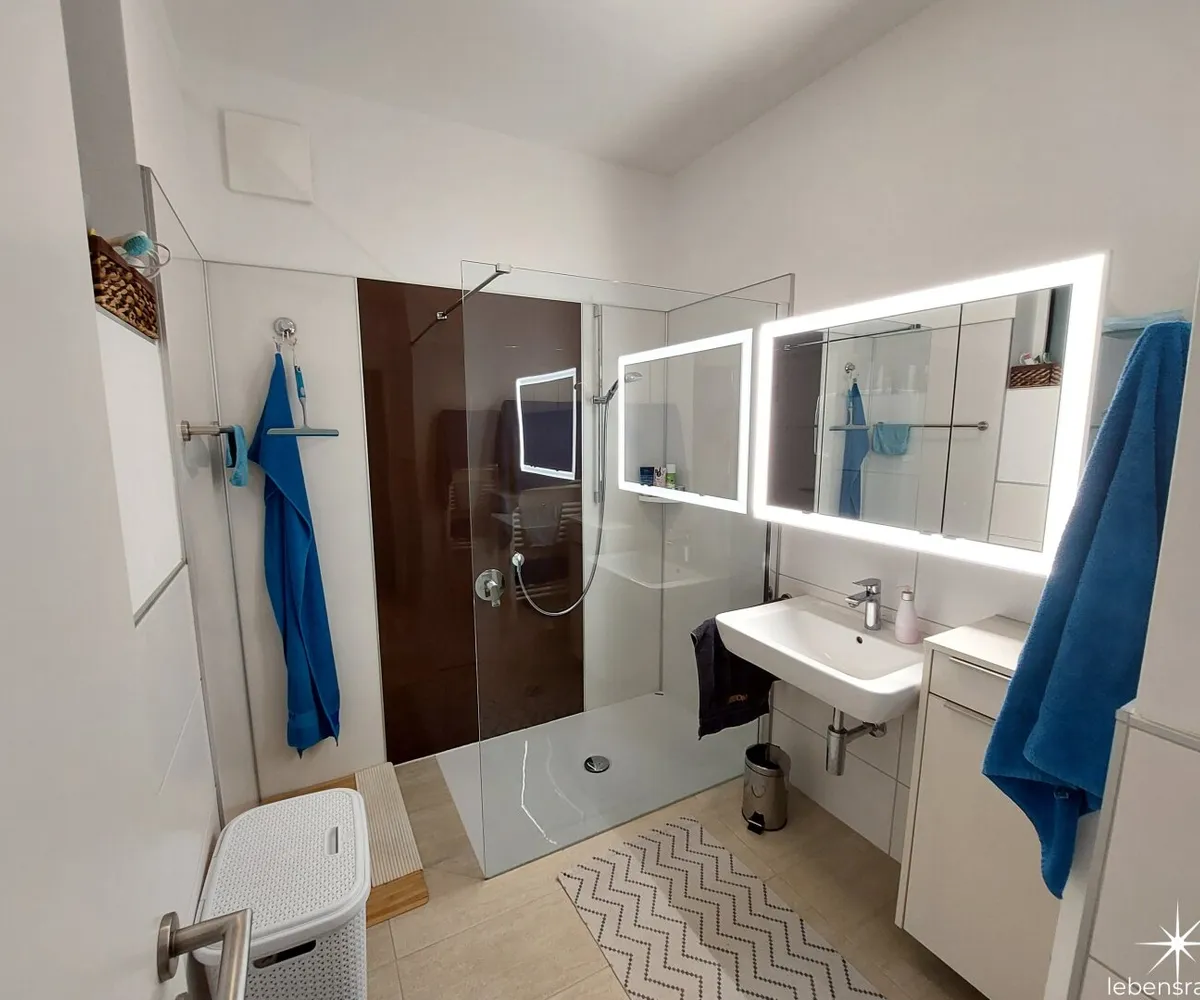 Das moderne Badezimmer ist mit einer großen, barrierefreien Dusche und einer Oberlichte ausgestattet.