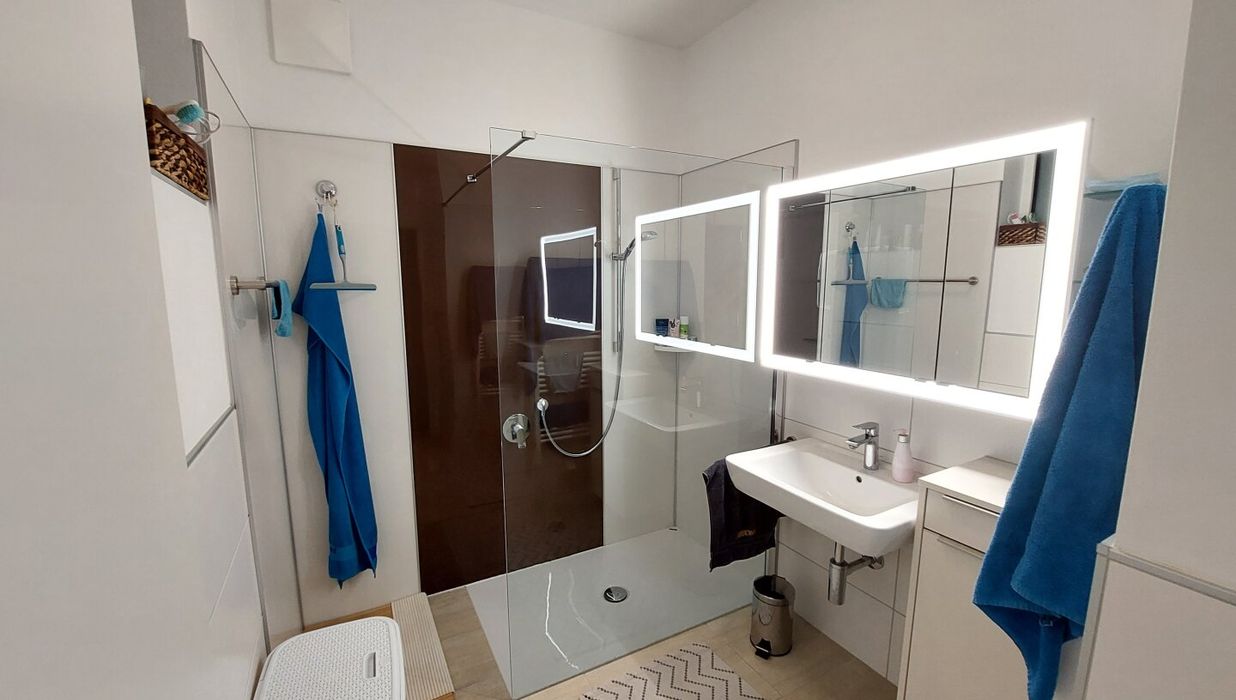 Das moderne Badezimmer ist mit einer großen, barrierefreien Dusche und einer Oberlichte ausgestattet.
