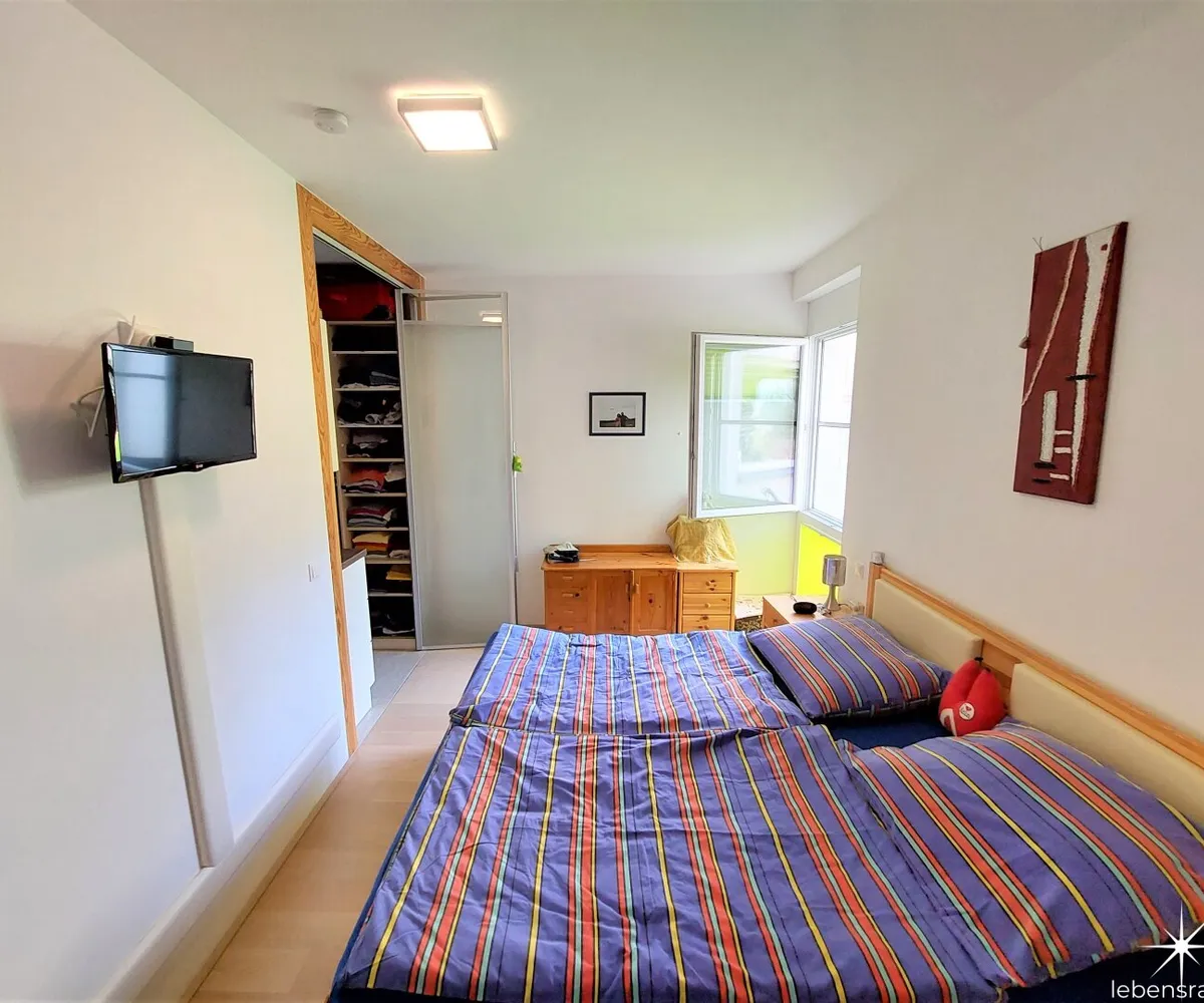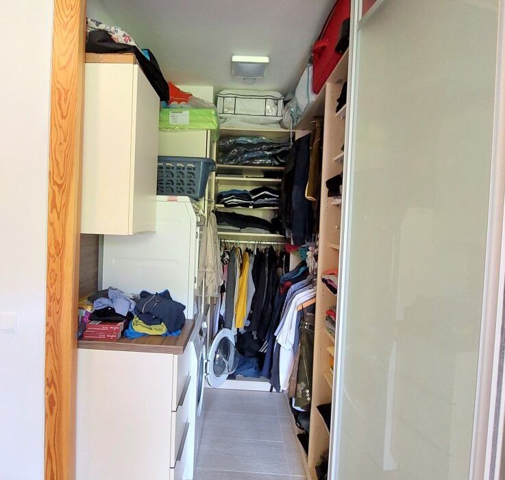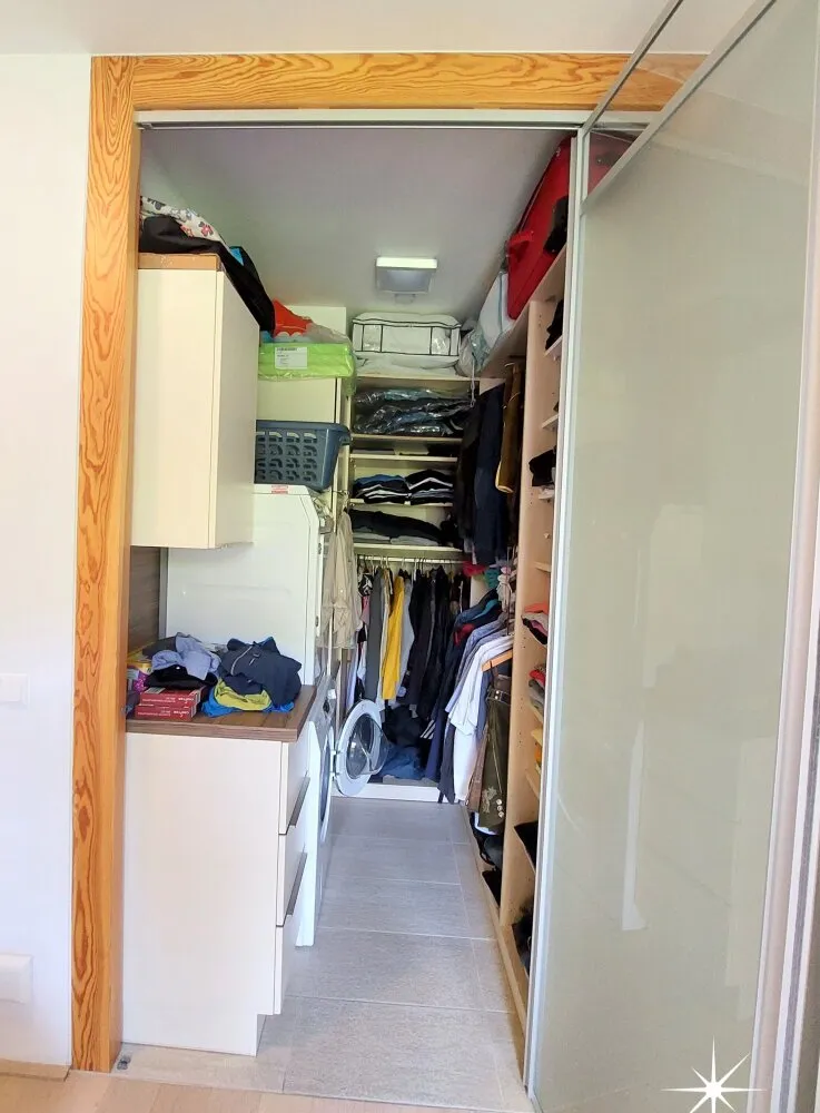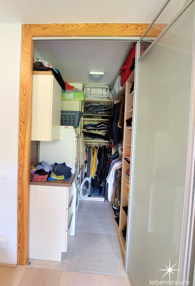 Bei einem Schlafzimmer wird kein Kasten mehr benötigt, da dieses mit einem begehbaren Ankleideraum inkl. Waschmaschinen- und Trockneranschluss ausgestattet ist. Der Ankleideraum ist über ein Glas-Schiebeelement vom Schlafbereich trennbar.