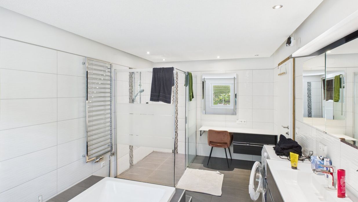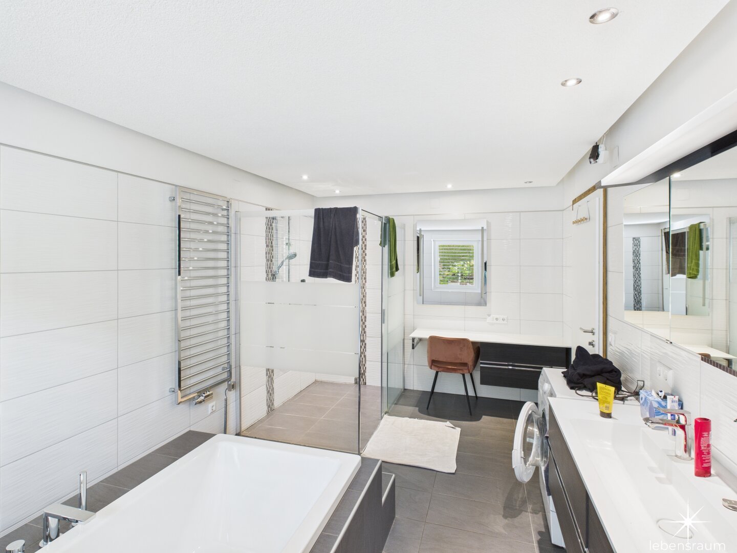 Die Wohnung verfügt über ein sehr geräumiges und stillvoll ausgestattetes Badezimmer mit Fenster und einer einladenden Badewanne, ideal für entspannende Momente nach einem aktiven Tag in der Natur. Ebenso verfügt das Badezimmer über eine begehbare Dusche.
