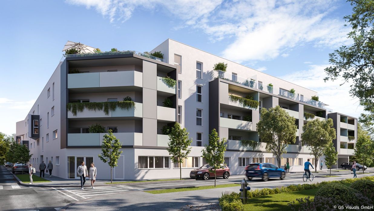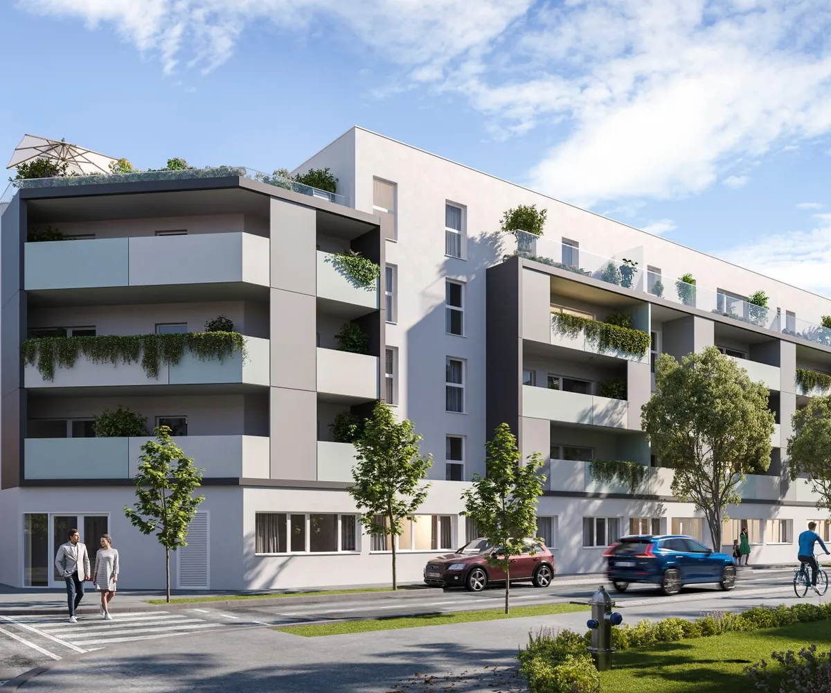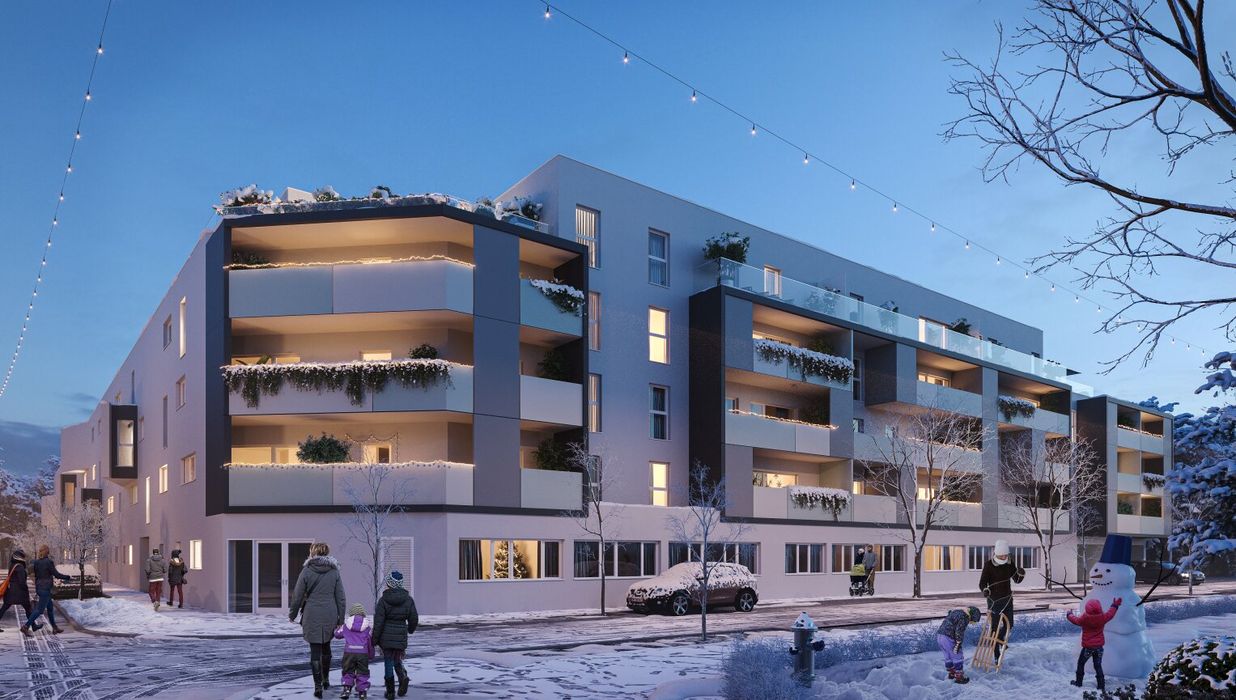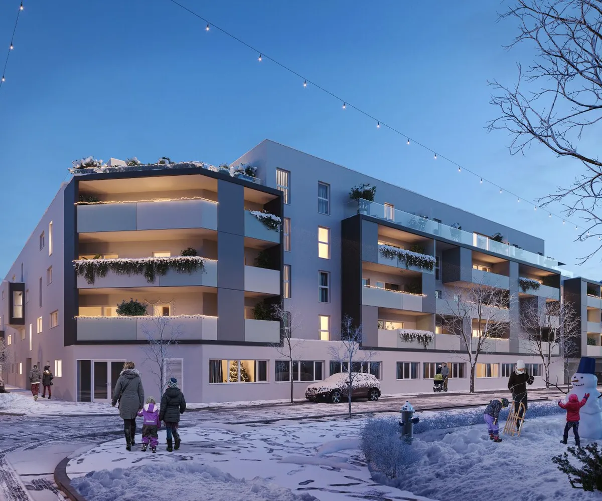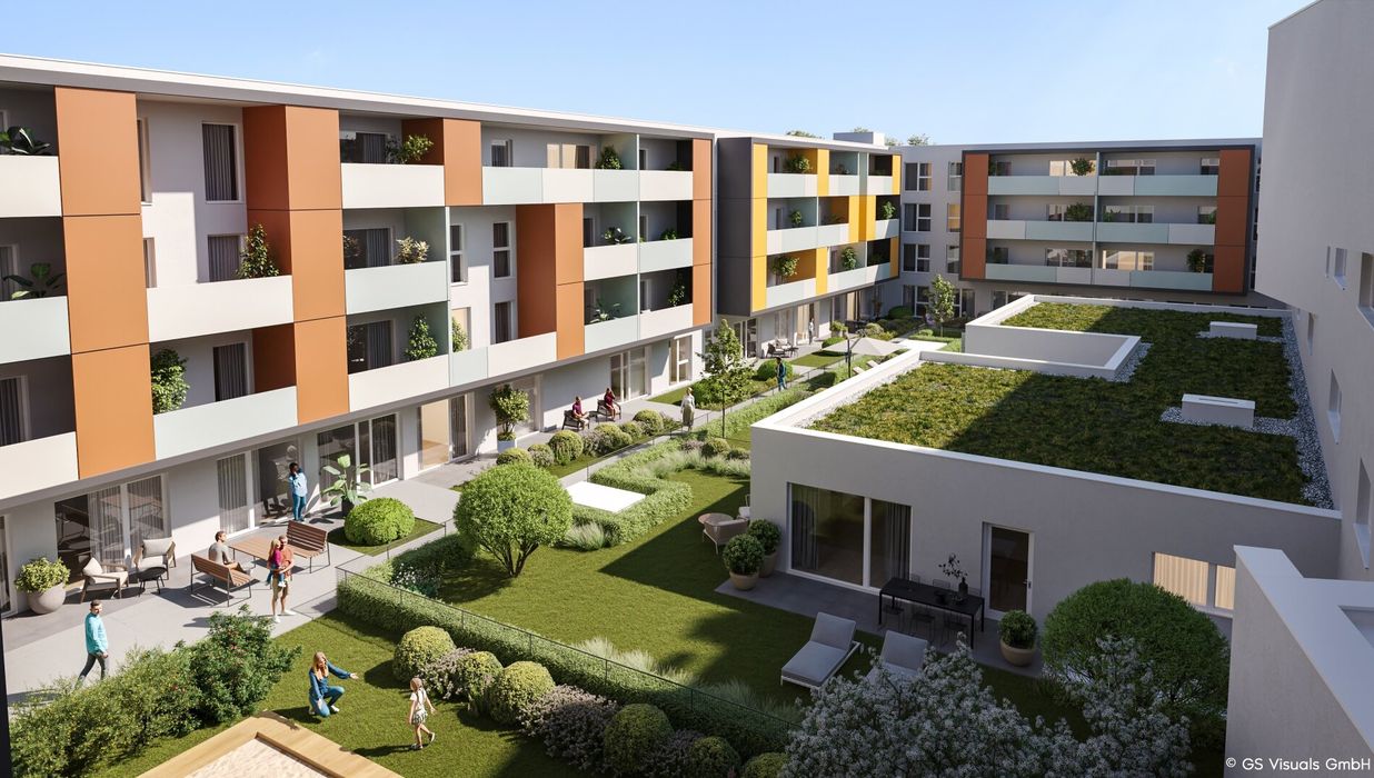 Am Dach wird eine gemeinschaftliche Photovoltaikanlage errichtet, damit alle Bewohner von der Sonnenenergie profitieren können. Die Sonne genießen kann man jedoch nicht nur über die Steckdose, sondern auch auf den großzügigen Freiflächen der einzelnen Wohnungen. Wer Gemeinschaft sucht, oder ein schattiges Plätzchen im Grünen, findet dies unter der lauschigen Pergola im Innenhof des Gebäudes. Damit auch die Jüngsten die Zeit im Freien genießen können, wird ein Kinderspielplatz Raum für Spiel und Spaß an der frischen Luft bieten.
