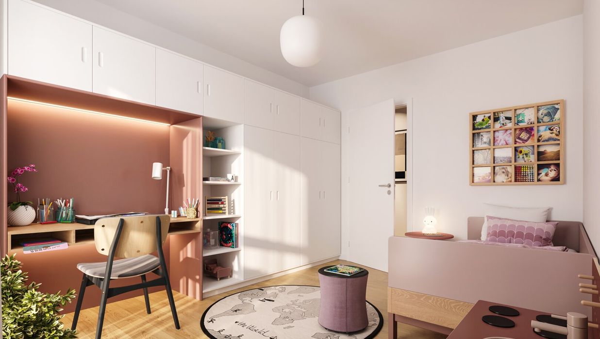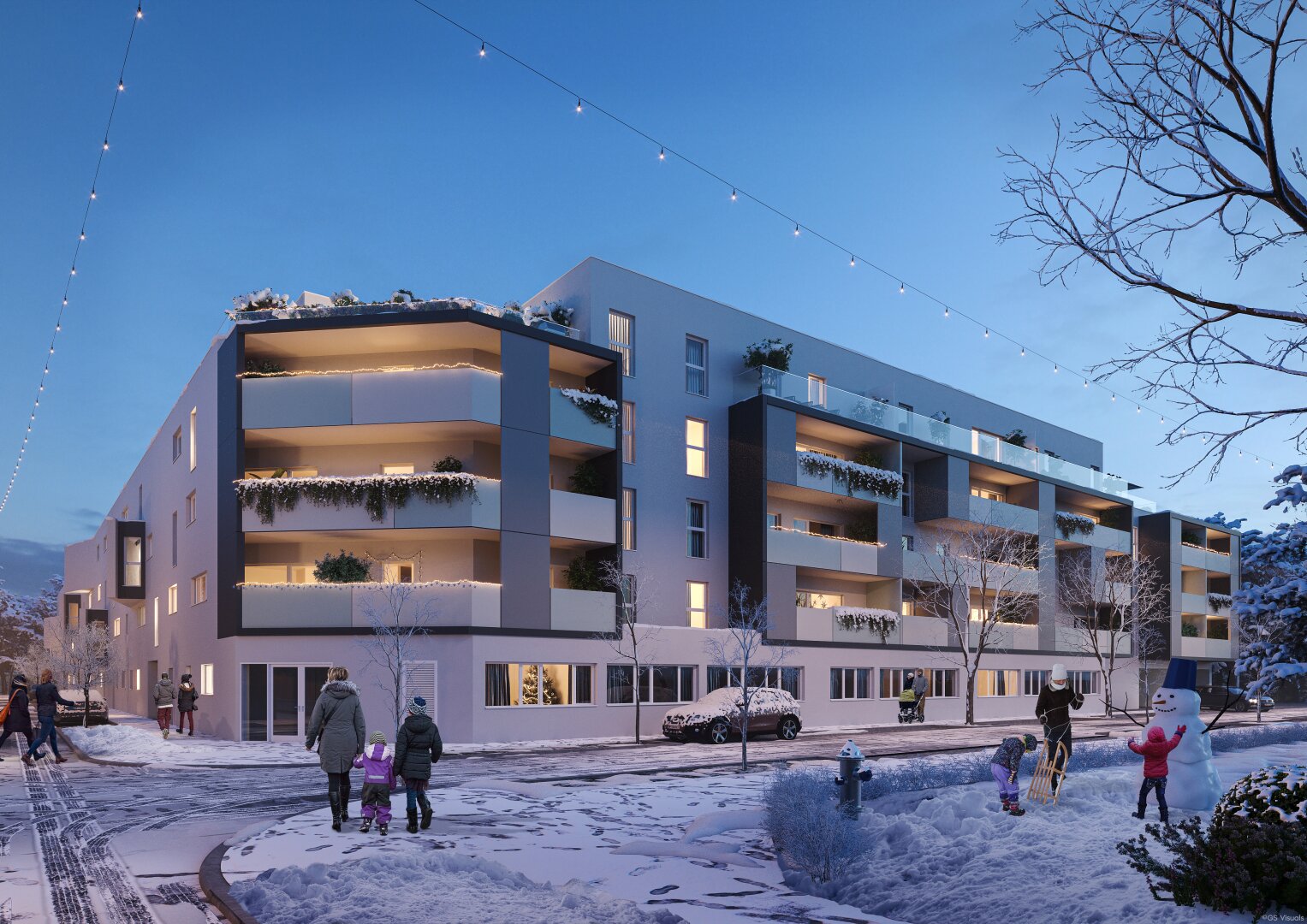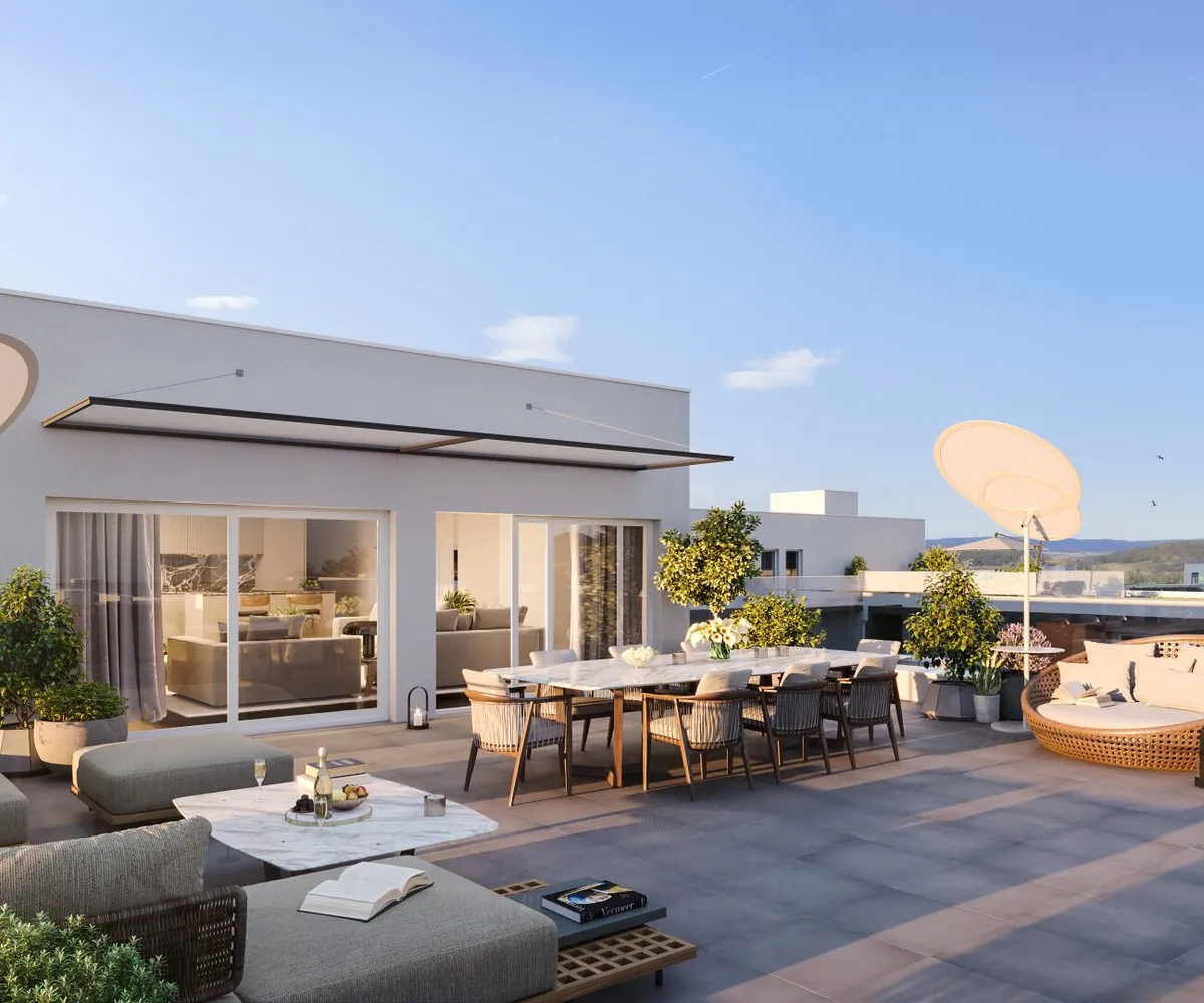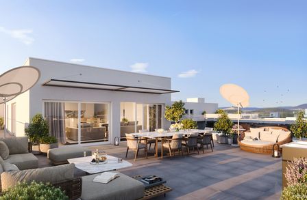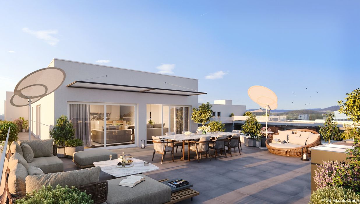 Am Dach wird eine gemeinschaftliche Photovoltaikanlage errichtet, damit alle Bewohner von der Sonnenenergie profitieren können. Die Sonne genießen kann man jedoch nicht nur über die Steckdose, sondern auch auf den großzügigen Freiflächen der einzelnen Wohnungen. Wer Gemeinschaft sucht, oder ein schattiges Plätzchen im Grünen, findet dies unter der lauschigen Pergola im Innenhof des Gebäudes. Damit auch die Jüngsten die Zeit im Freien genießen können, wird ein Kinderspielplatz Raum für Spiel und Spaß an der frischen Luft bieten.
