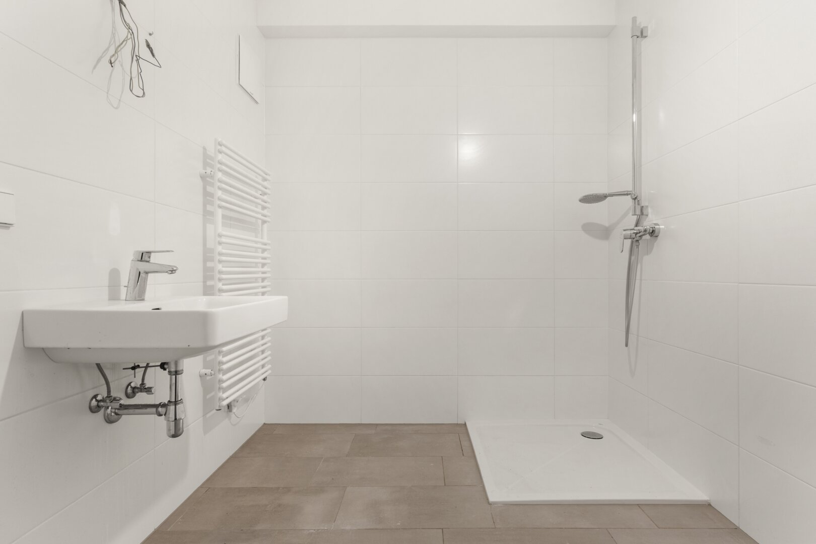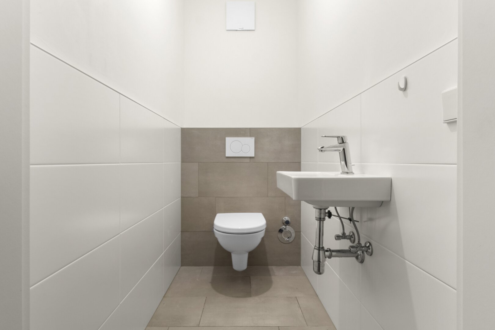 Reduzierte Farbe, geölter Eichenparkett in den Wohnräumen und hochwertiges Feinsteinzeug in den Nassräumen.
