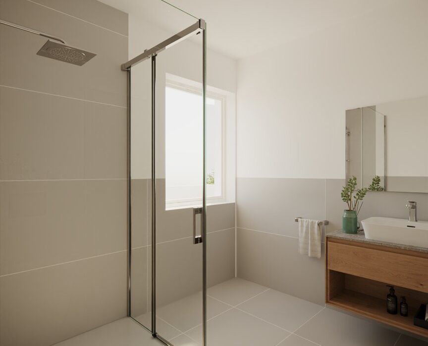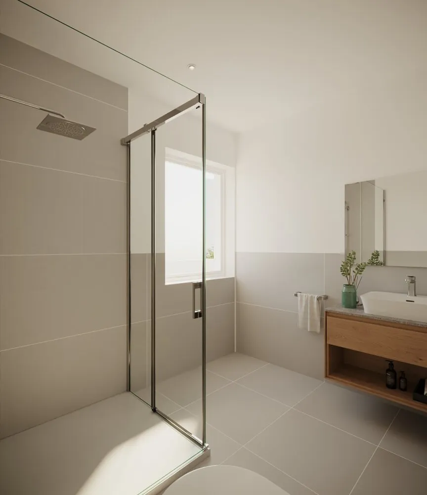 Im stilvoll ausgestatteten Bad lädt eine moderne Dusche dazu ein, sich nach einem erlebnisreichen Tag in den Bergen zu erfrischen und zu entspannen.
