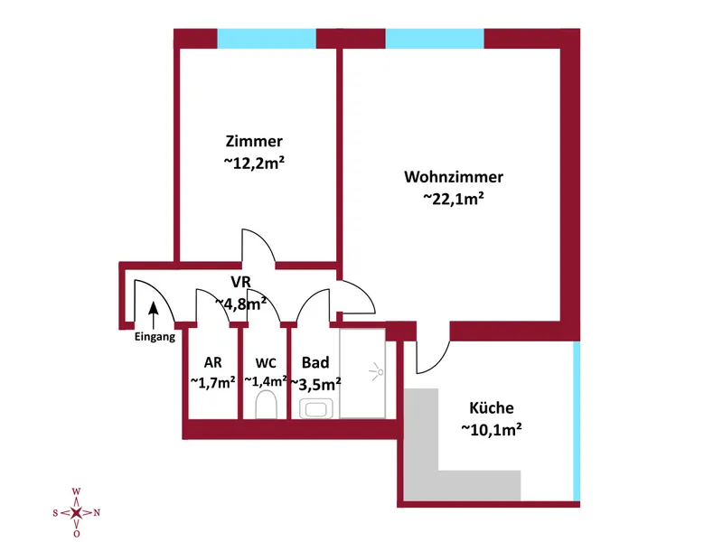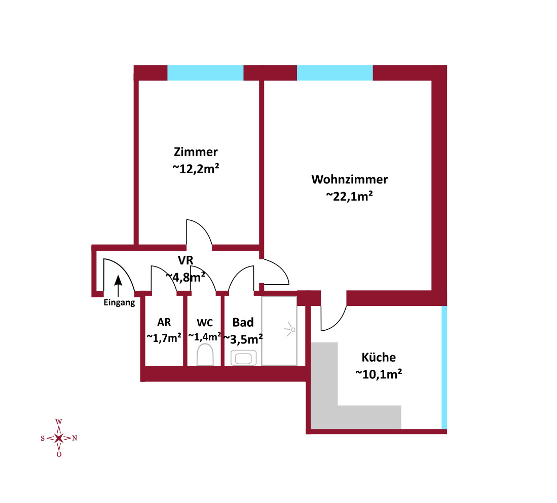 Auf einer Gesamtfläche von ca. 55,65 m² erwartet Sie folgende Raumaufteilung :