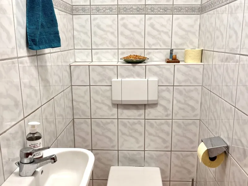 Das Badezimmer verfügt über eine Badewanne, eine separate Dusche, ein Waschbecken, eine Toilette und über einen Waschmaschinenanschluss.