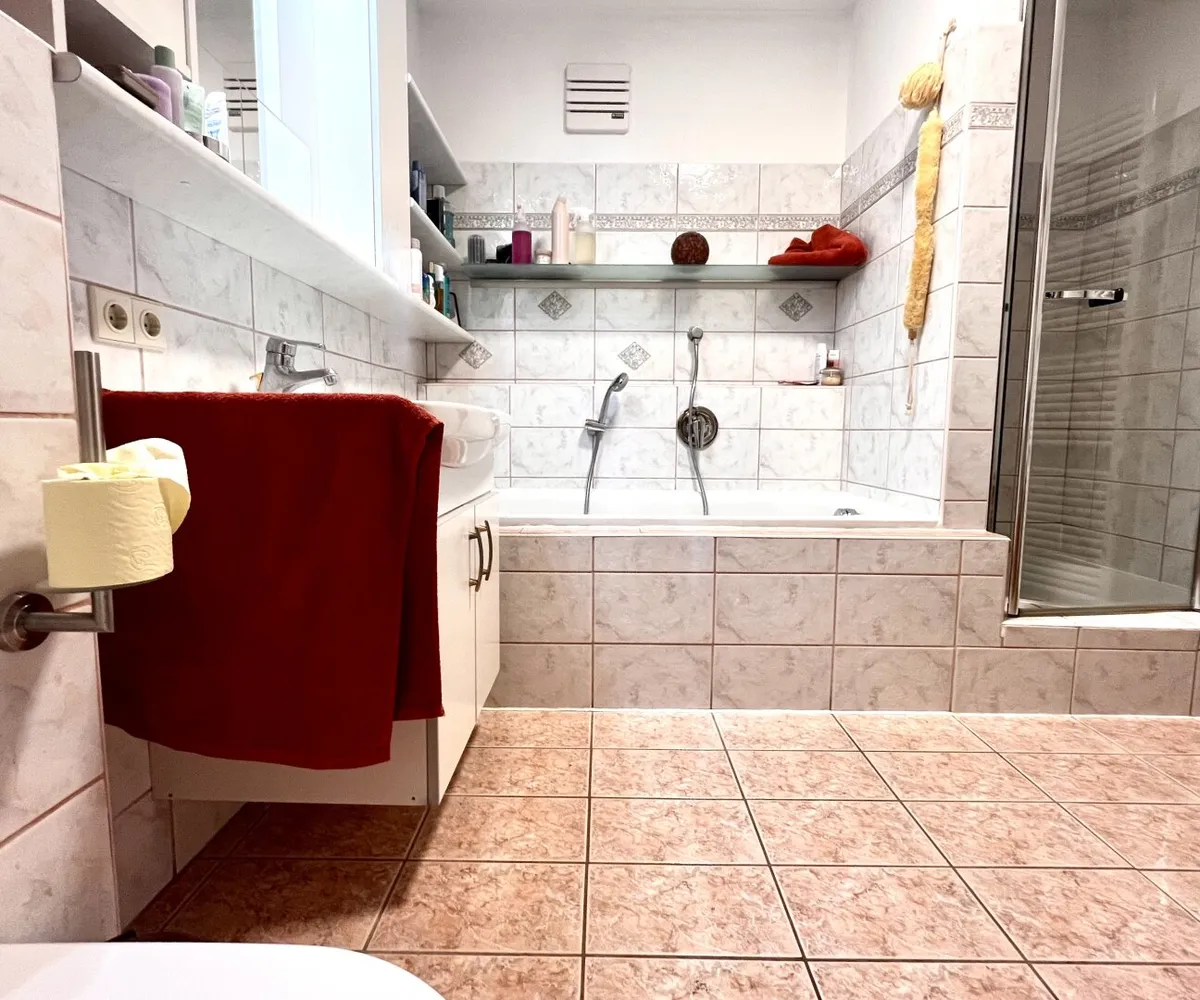 Badezimmer mit Badewanne, Dusche, Toilette und Waschmaschinenanschluss