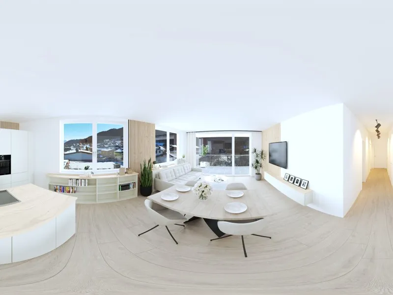 Die Raumkonfiguration innerhalb der Wohnungen wurde optimal an die Qualitäten der Umgebung angepasst: Die Schlafräume befinden sich im ruhigen, nordseitigen Bereich des Hauses, während die offenen Wohn- und Essbereiche nach Südwesten ausgerichtet sind. Diese sind direkt mit großzügigen Terrassen verbunden, die einen atemberaubenden Blick über das Dorf und auf den Alpenhauptkamm bieten.