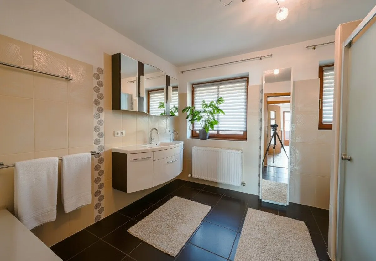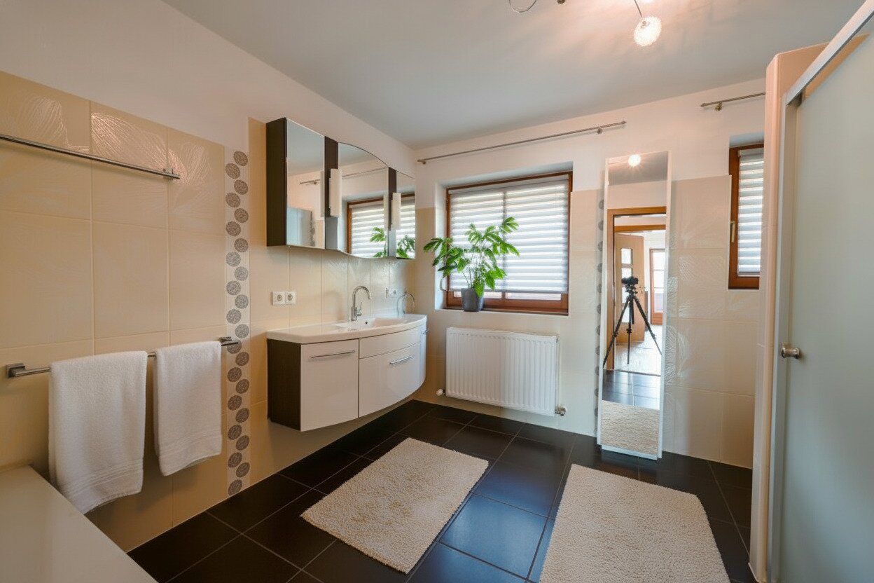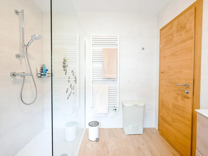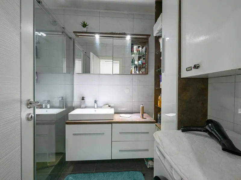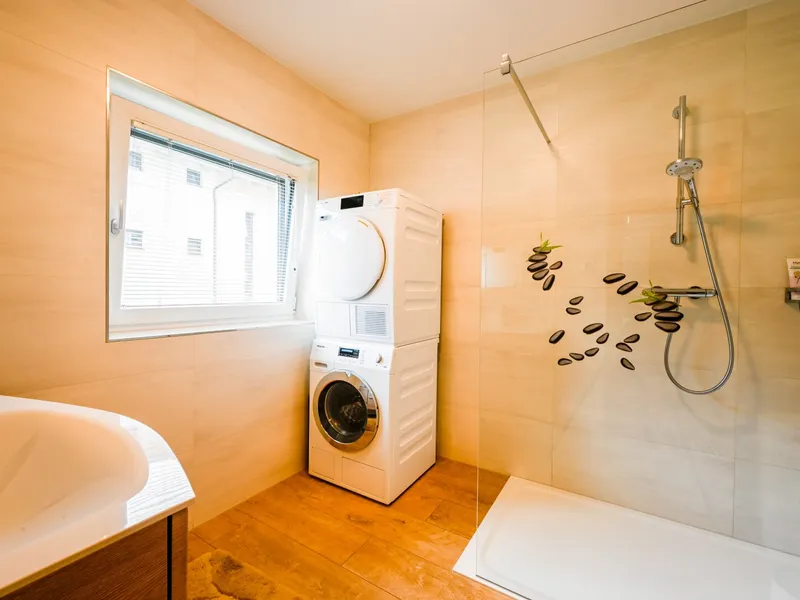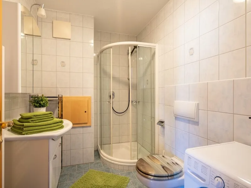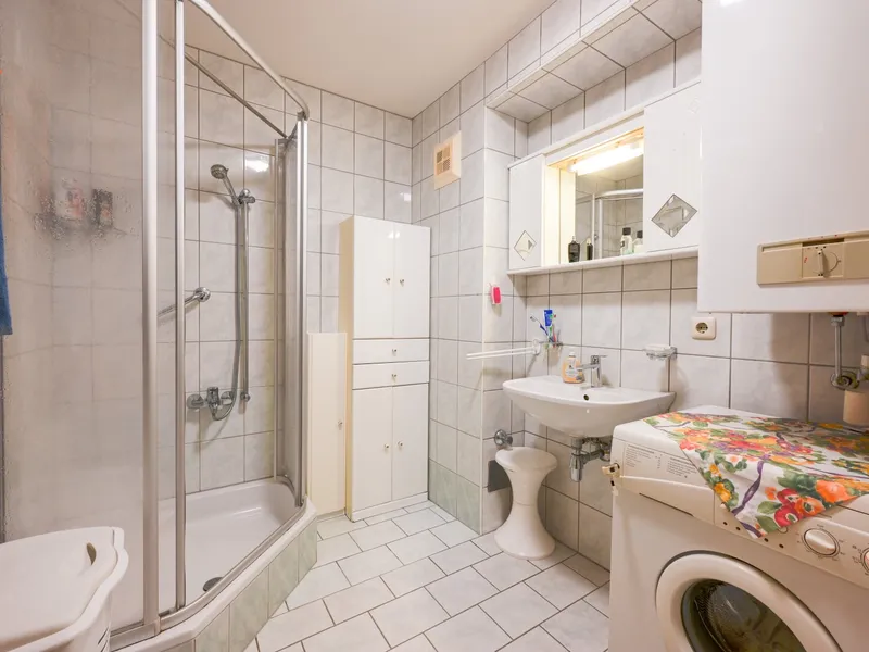 1 Badezimmer mit Dusche, WC, Waschtisch und Waschmaschinenanschluss