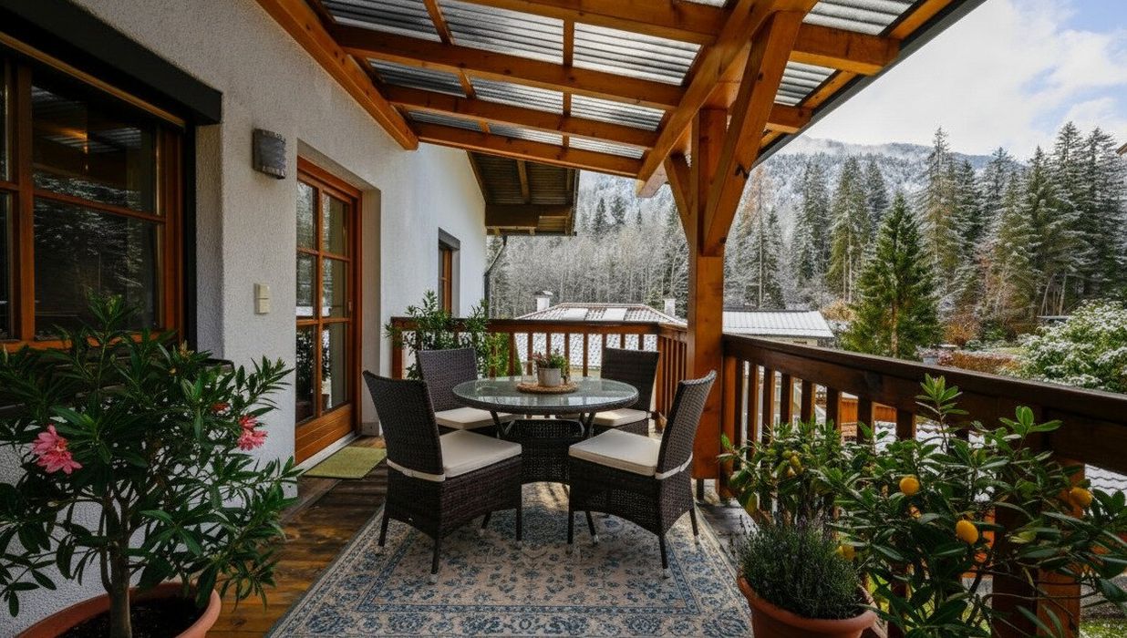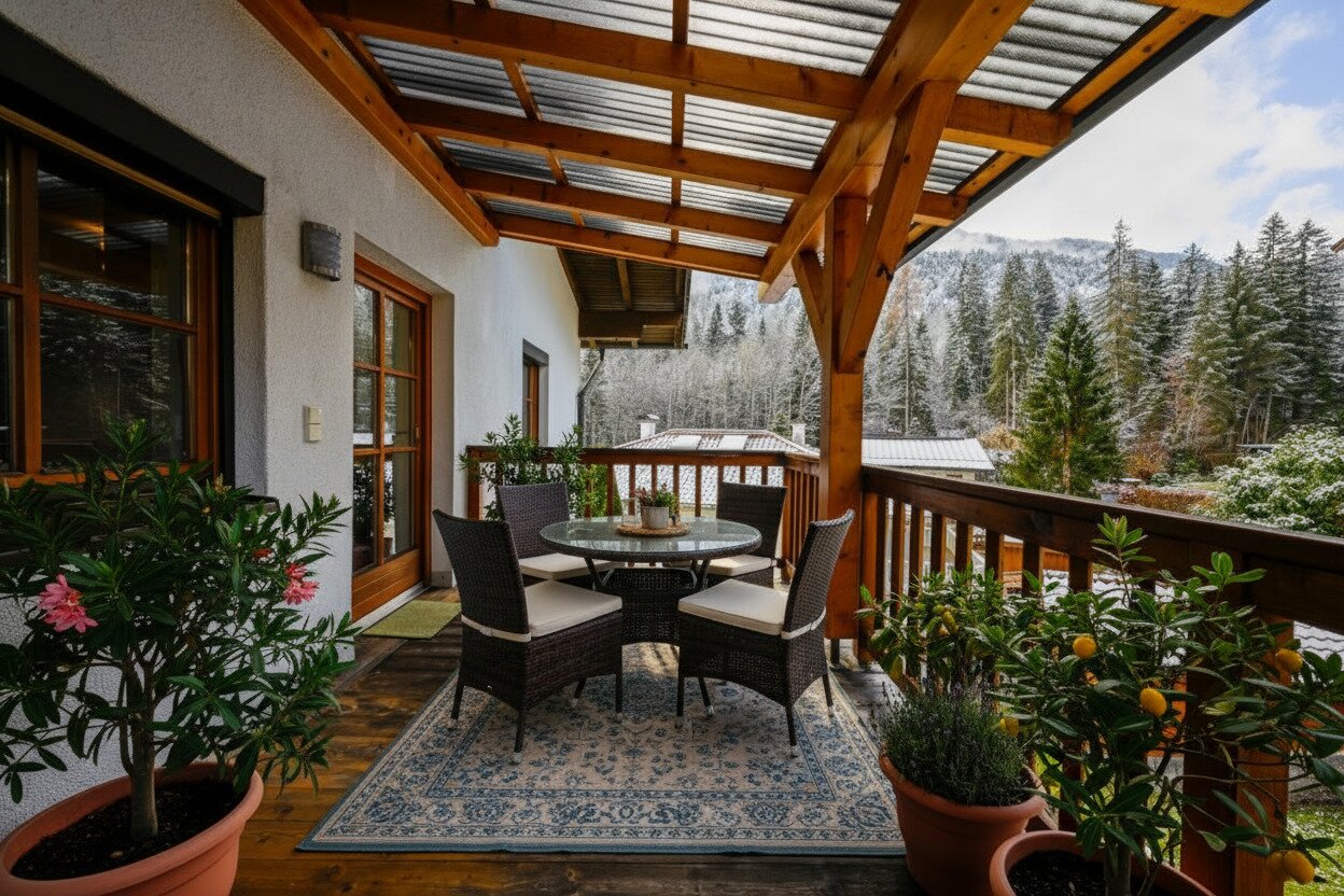 Zwei Balkone und eine großzügige, überdachte Terrasse laden dazu ein, die frische Tiroler Luft und die beeindruckende Natur zu genießen. Stellen Sie sich vor, wie Sie an einem sonnigen Morgen mit Blick auf das Wasser und die Berge Ihren Kaffee genießen oder am Abend bei einem Glas Wein den Sonnenuntergang bewundern. Der Fernblick und der grüne Ausblick sorgen für eine entspannte Atmosphäre, die zum Verweilen einlädt.