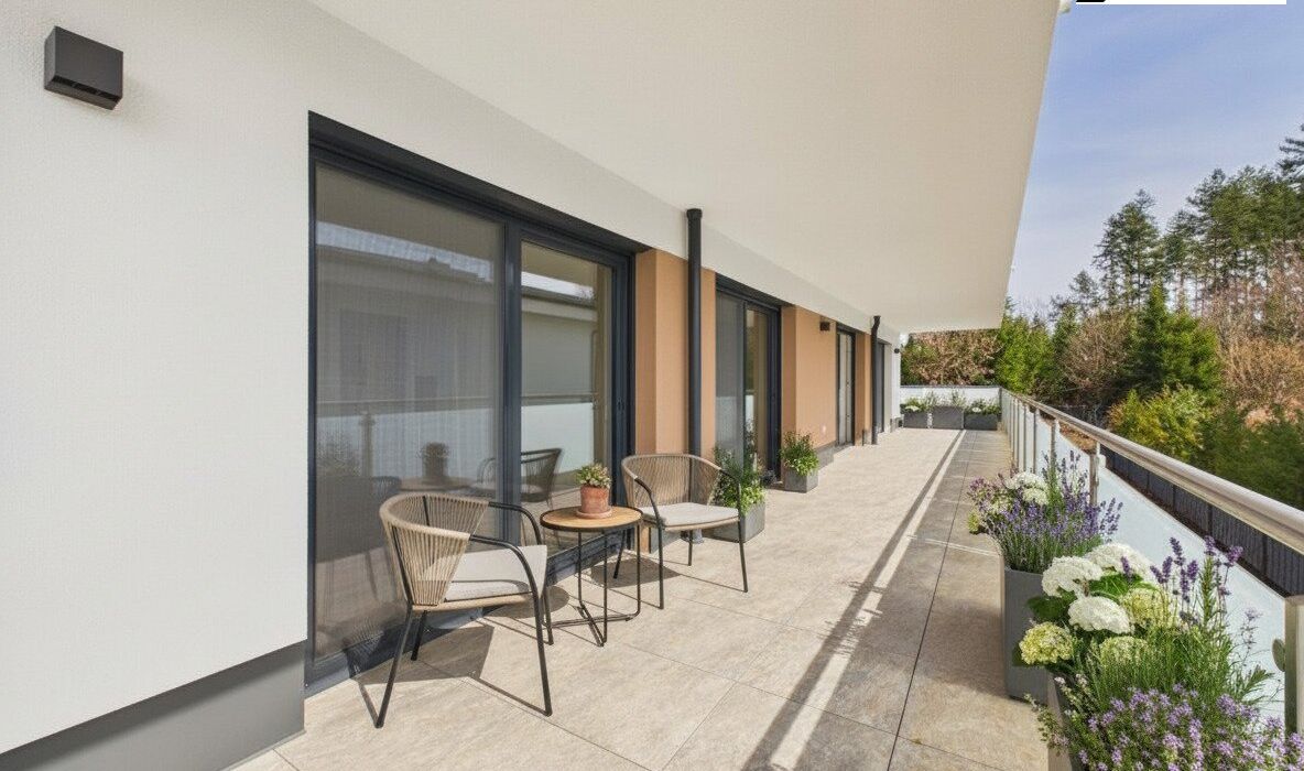 Ein absolutes Highlight ist die großzügige, nach Südosten ausgerichtete Terrasse. Ob Frühstück in der Morgensonne, entspannte Stunden am Nachmittag oder stilvolle Abende mit Freunden – hier genießen Sie ein unvergleichliches Wohngefühl mit Blick ins Grüne.