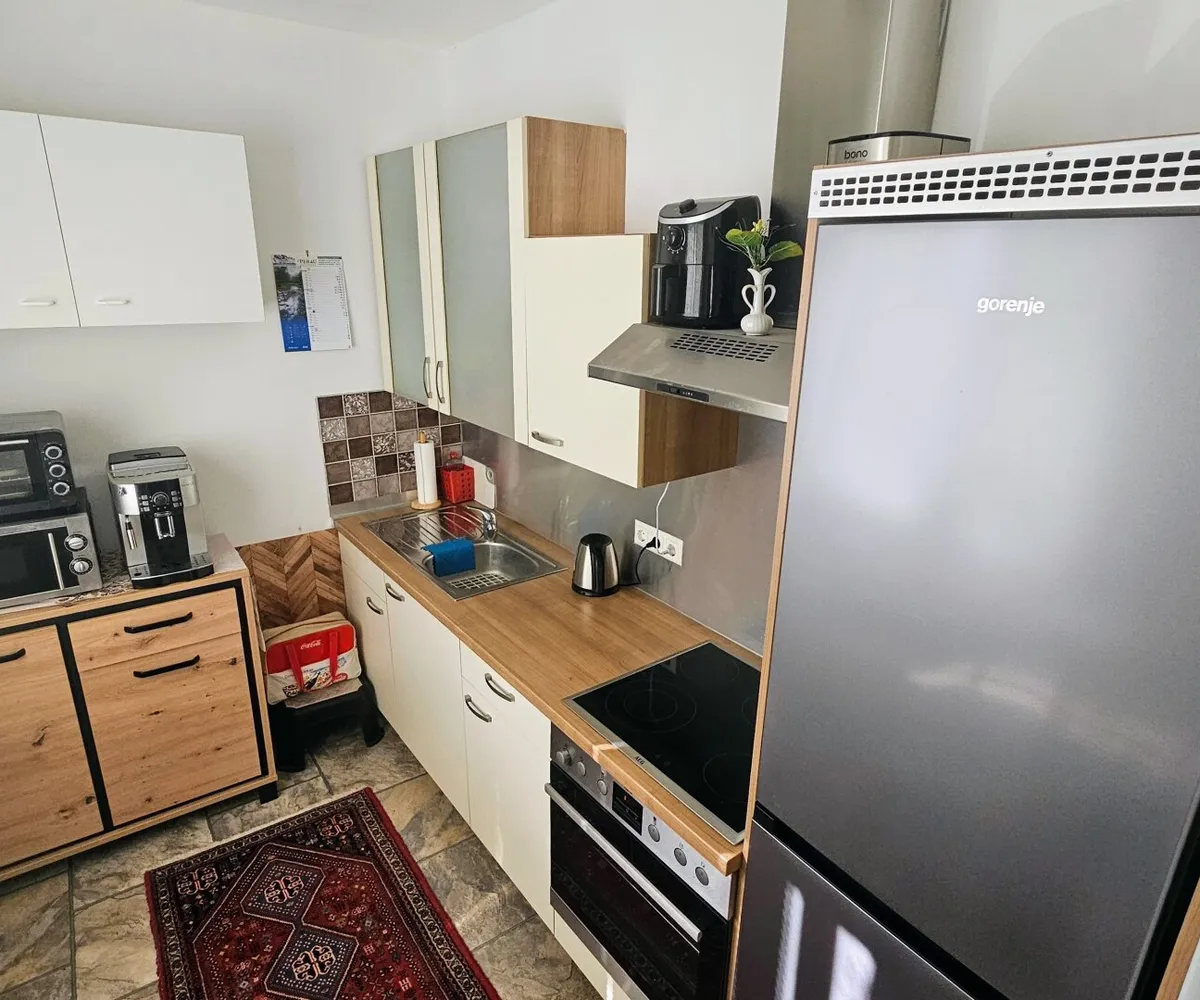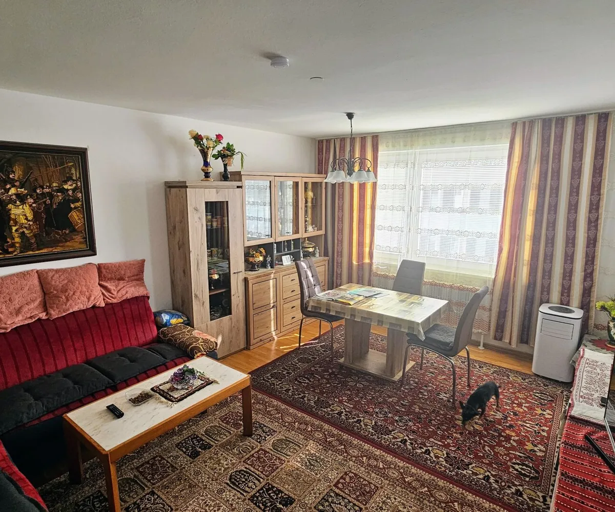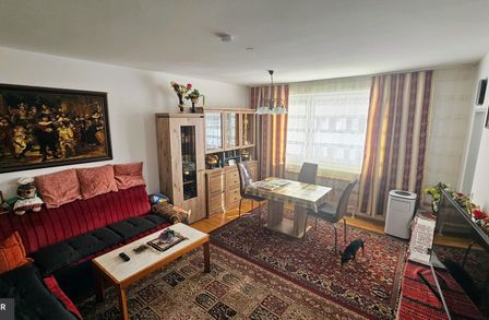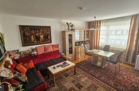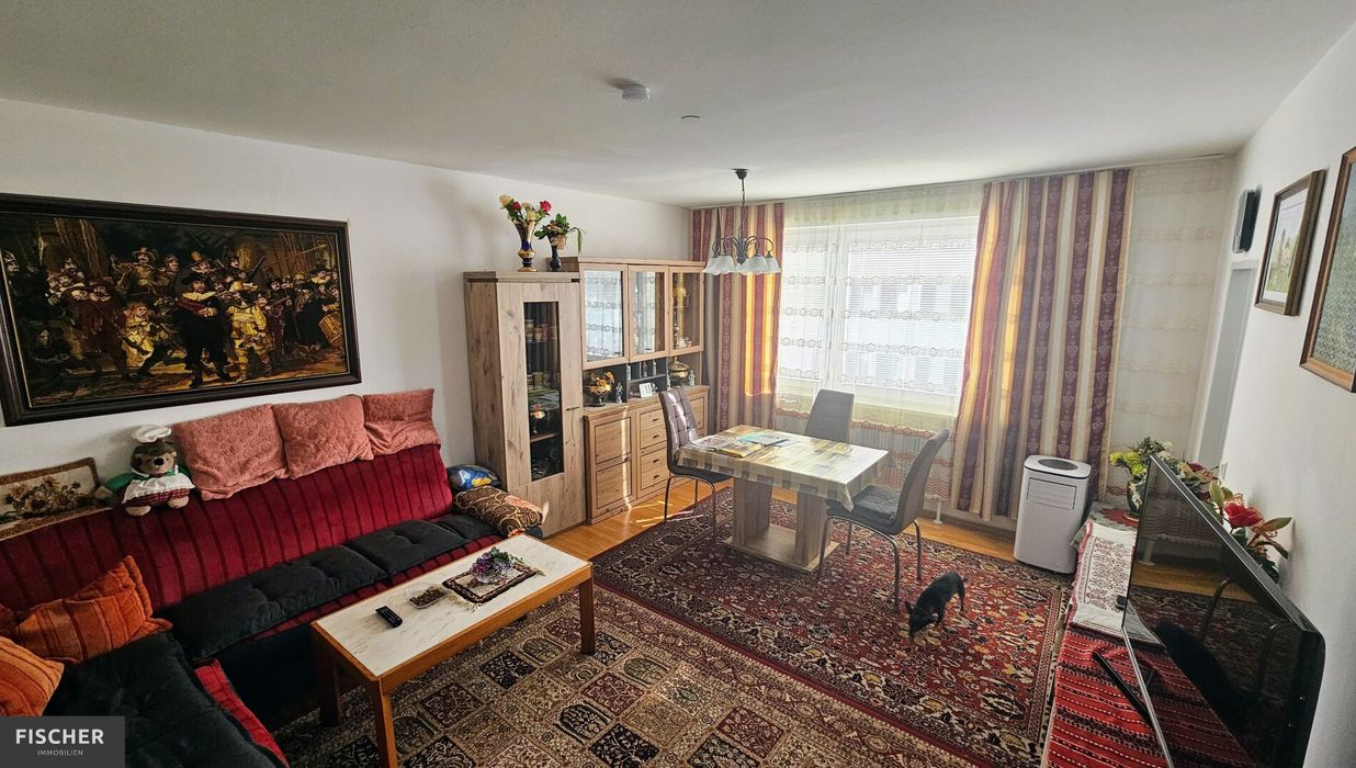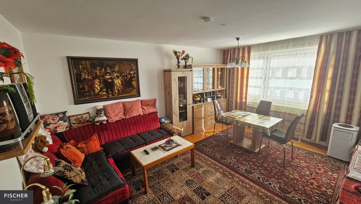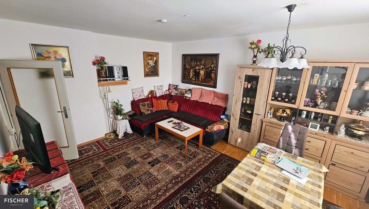 Ein großer gemütlicher Wohnraum, ausgestattet mit schönen Echtholzböden sowie einer großen Süd-Befensterung, bildet wohl das Herzstück dieser Wohnung. Direkt angrenzend befindet sich die offene Küche samt integrierter Einbauküche.