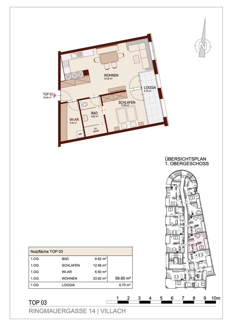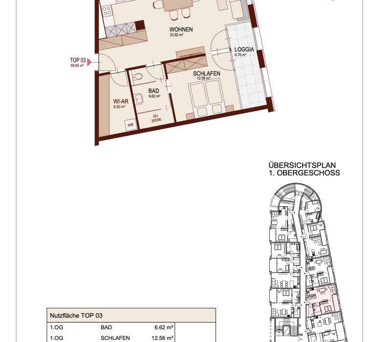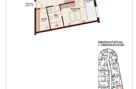 Die Wohnung Top 3 hat eine Gesamtfläche von ca. 60,54 m² und befindet sich im 1. Obergeschoss. Beim betreten gelangt man zunächst in einen Vorraum/Gang (ca. 6,77m²), von dem aus alle Räume zentral erreichbar sind. Der Wohnbereich besteht aus einem großzügigen Wohn-, Ess- und Küchenbereich (ca. 33,92 ²). Die Küche ist offen in den Wohnraum integriert. Im Wohnbereich gibt es Platz für eine Essgruppe sowie eine Sofalandschaft. Von hier aus gelangt an direkt auf die Loggia die zusätzlichen Außenraum bietet.