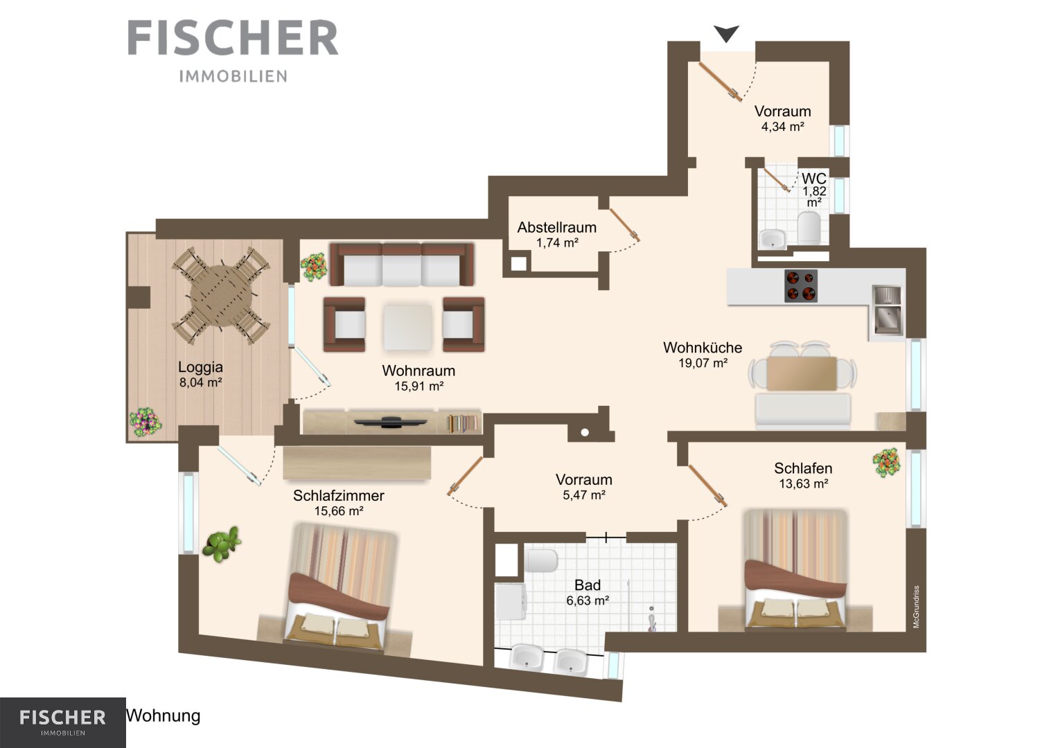 Ein Highlight ist die sonnige und gemütliche Loggia, die zum Entspannen einlädt und zusätzlichen Wohnkomfort im Freien bietet – ideal für ruhige Stunden oder gesellige Abende.