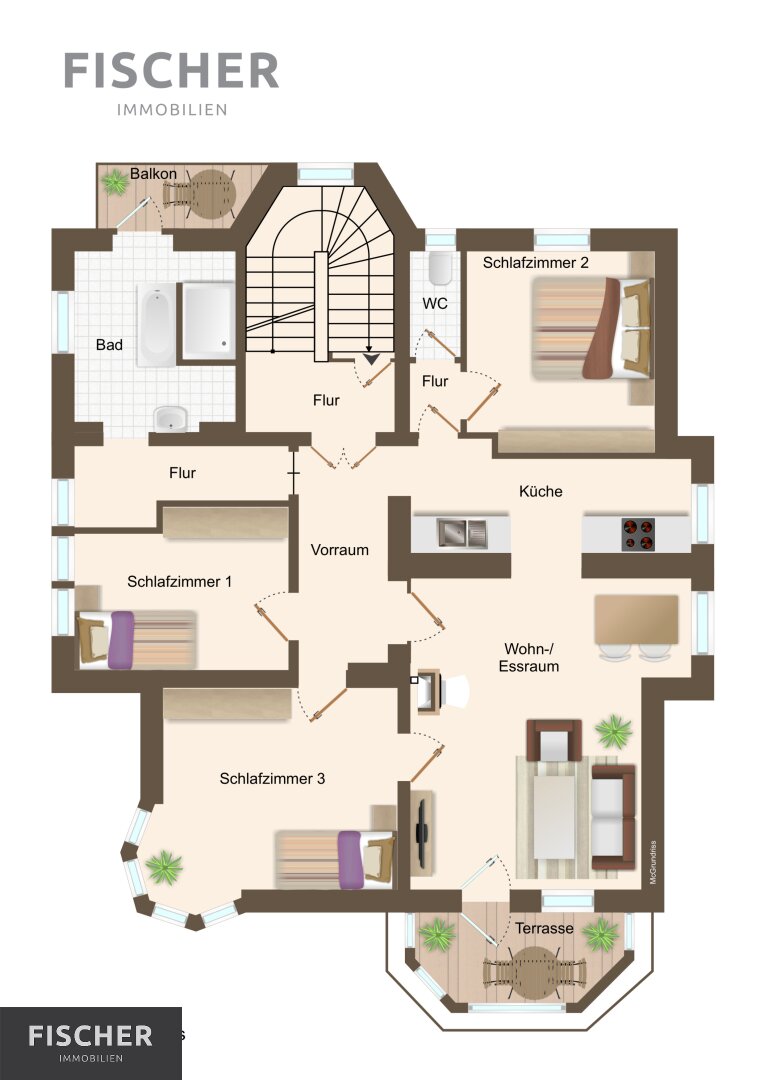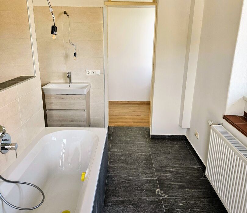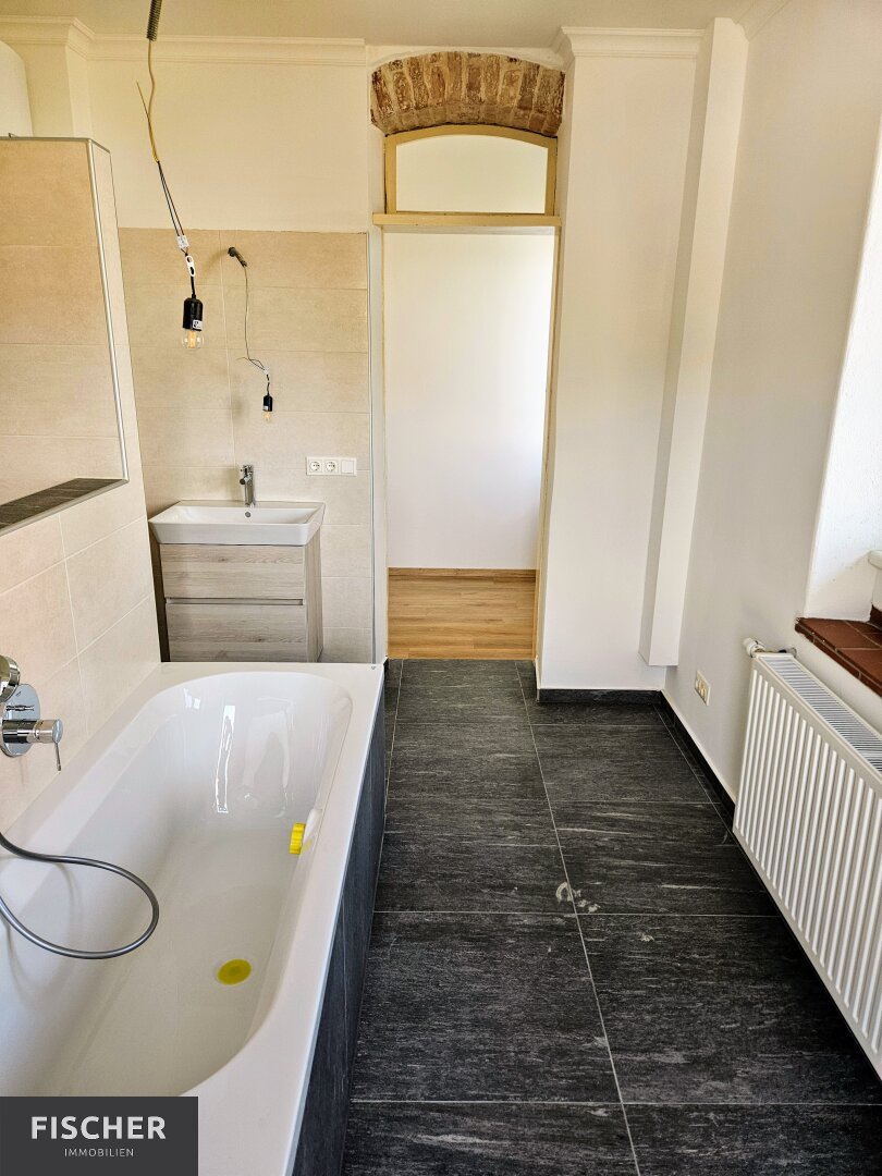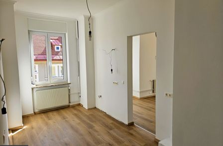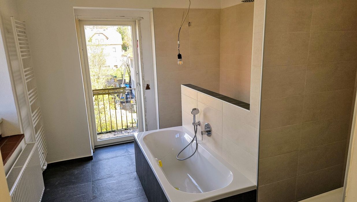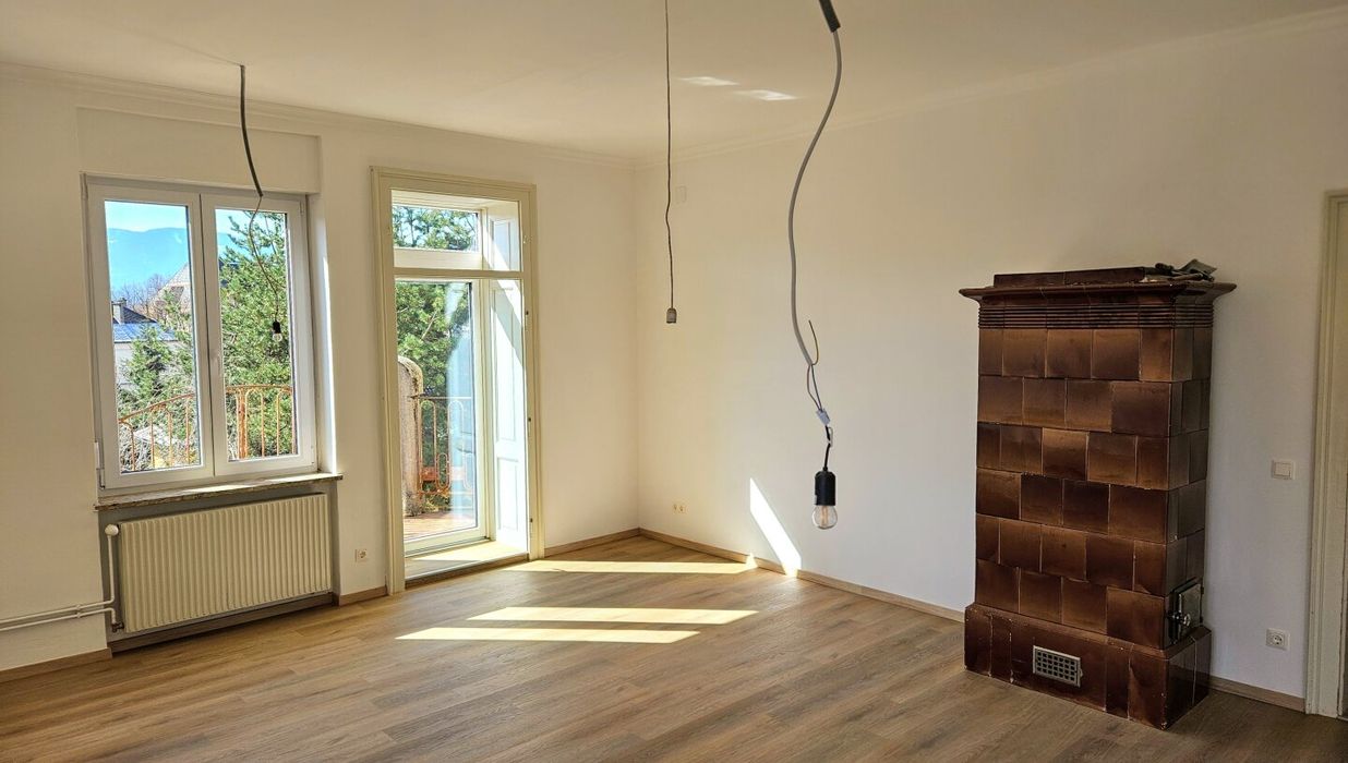 Eingangsbereich mit Flur/Garderobe, großer Wohnraum mit stilgerecht verglastem Erker, heller Wohnraum z.B. als Speisezimmer, neu saniertes Badezimmer mit Wannenbad sowie offener Dusche, Badheizkörper und kleinem Balkon, im Herzen der Wohnung befindet sich die Küche, zwei weitere Zimmer wobei das größere über einen angeschlossenen Zusatzofen und über eine Terrasse mit schönem Fernblick verfügt, eine Toilette samt Handwaschbecken vollendet das Raumkonzept dieser Wohnung.