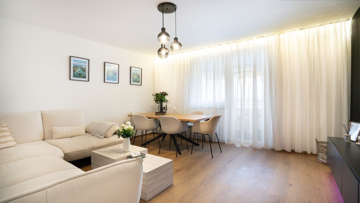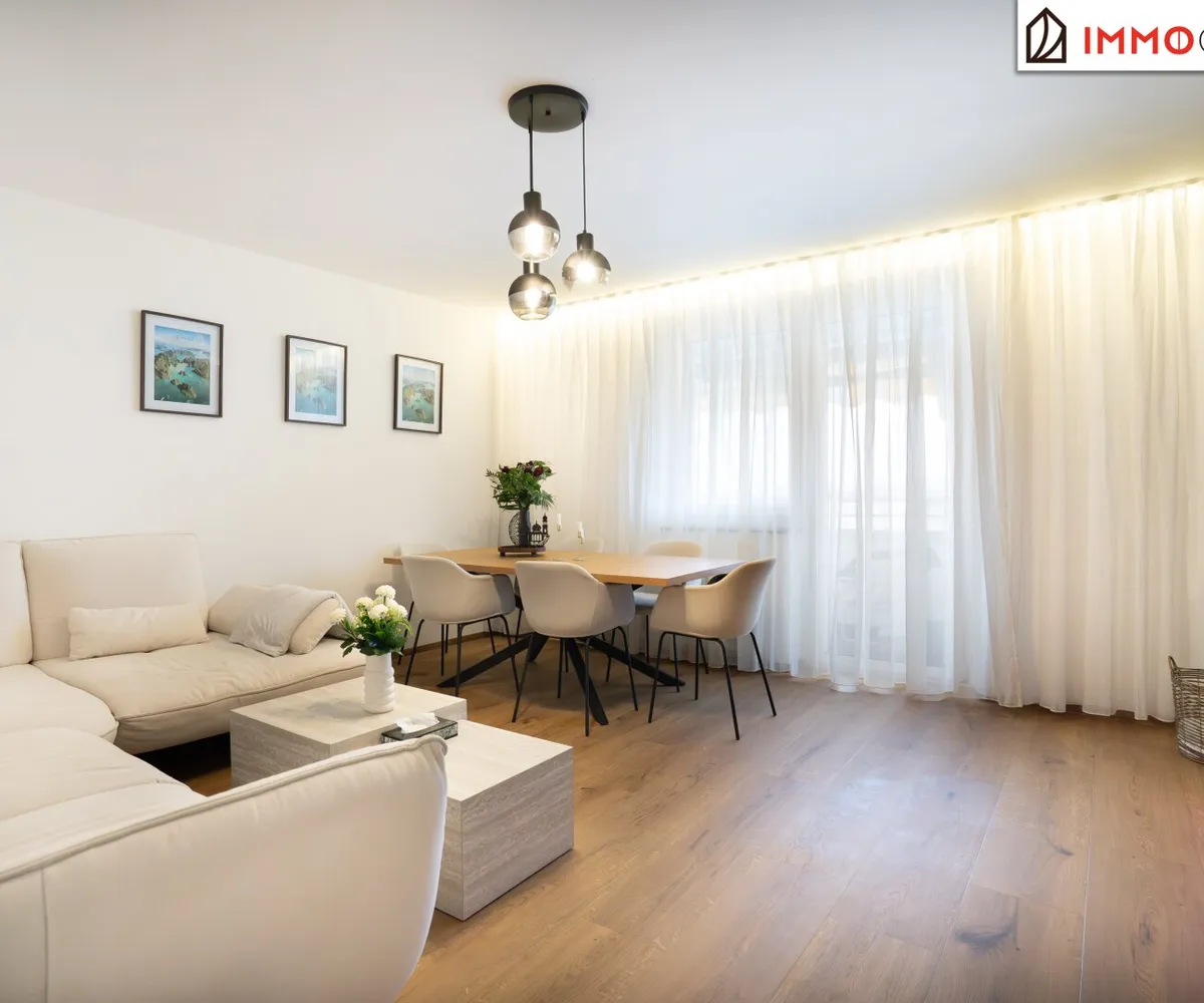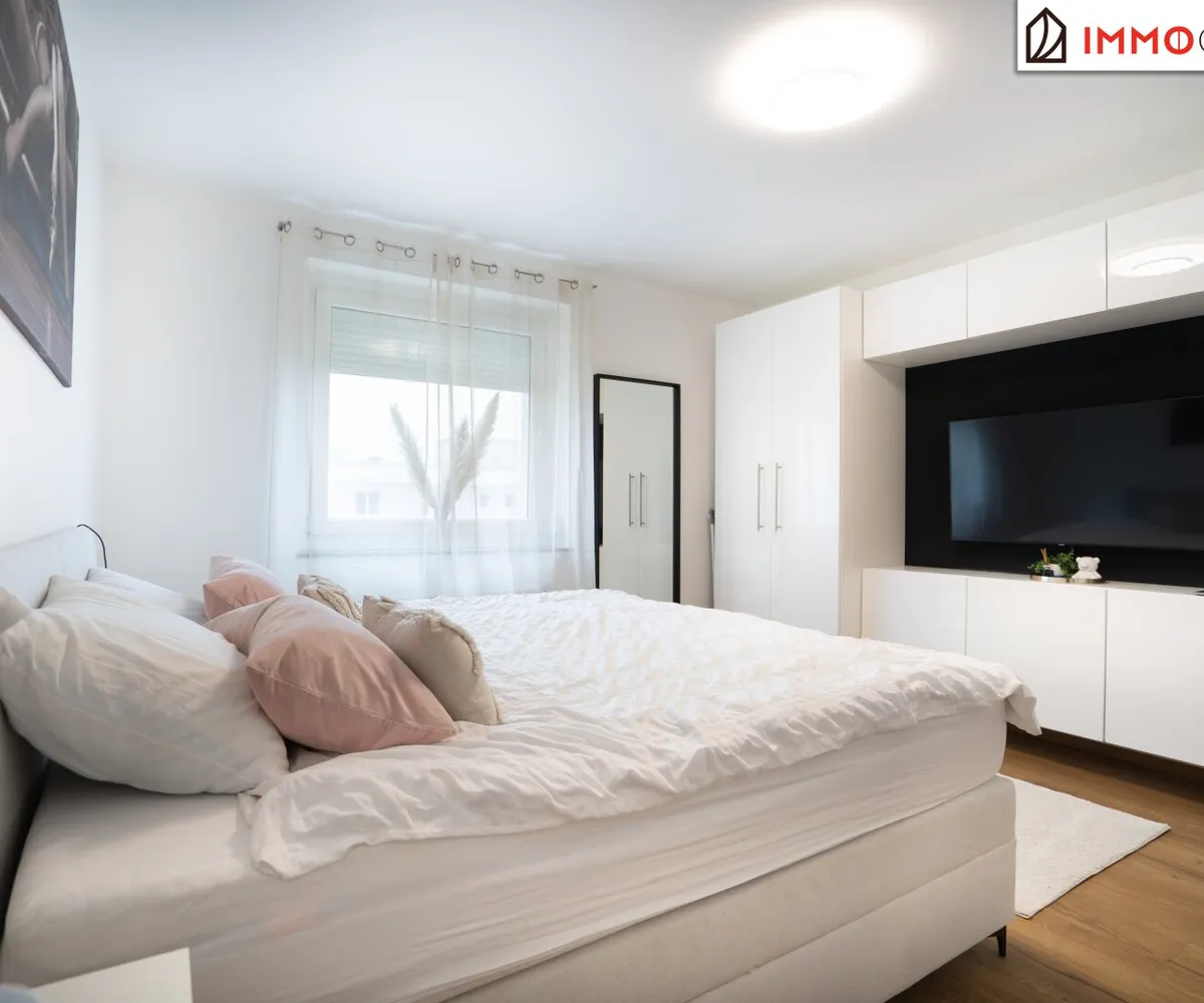 Das Herzstück der Wohnung bildet das großzügige Wohnzimmer. Dieser Raum lädt zum Verweilen ein und wird schnell zum Mittelpunkt des täglichen Lebens. Hier können Sie entspannte Abende verbringen, Gäste empfangen oder einfach die gemütliche Atmosphäre Ihres Zuhauses genießen. Vom Wohnzimmer aus gelangt man direkt auf die südlich ausgerichtete Loggia, die einen angenehmen Platz zum Verweilen bietet. Hier lässt sich die Sonne genießen und der Tag in ruhiger und entspannter Umgebung ausklingen.
