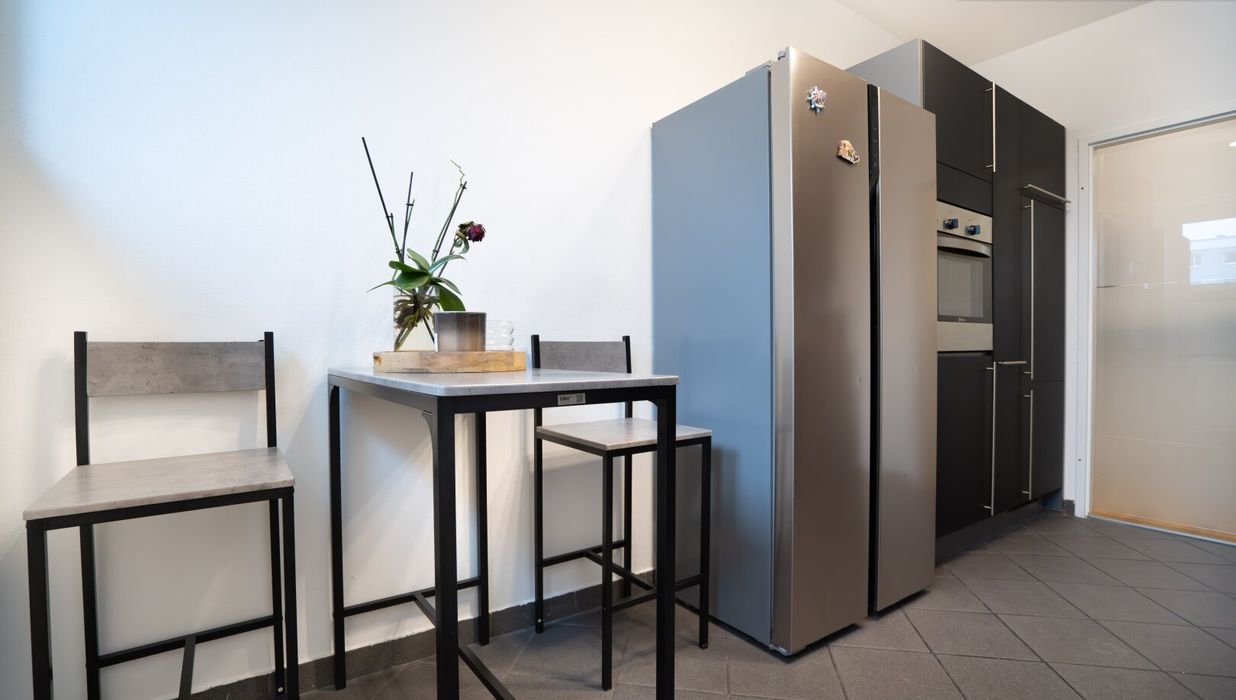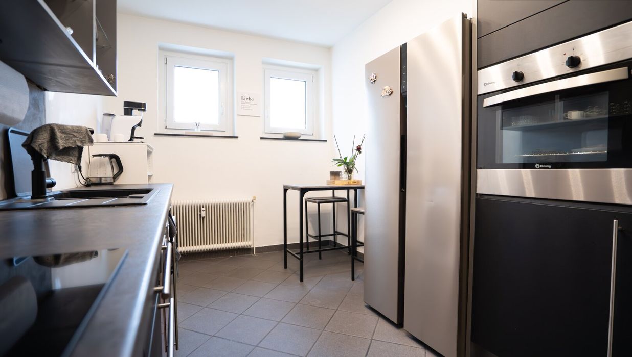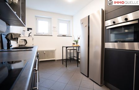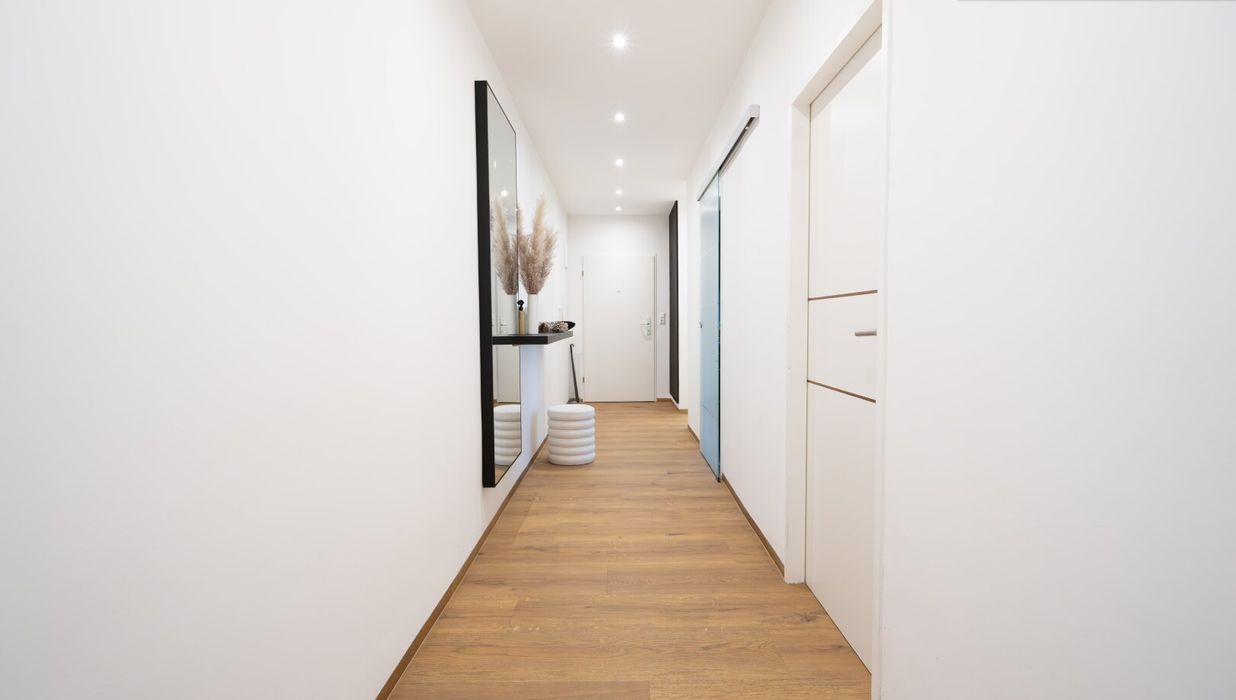 Schon beim Betreten der Wohnung empfängt Sie ein einladender Flur, der die Räume harmonisch miteinander verbindet und einen ersten Eindruck der gelungenen Aufteilung vermittelt. Auf der linken Seite des Flurs befindet sich zunächst die Küche. Durch die Fenster wirkt der Raum besonders hell und freundlich und schafft eine gemütliche Atmosphäre zum Kochen und Verweilen.