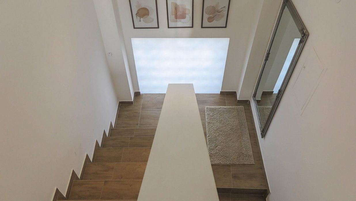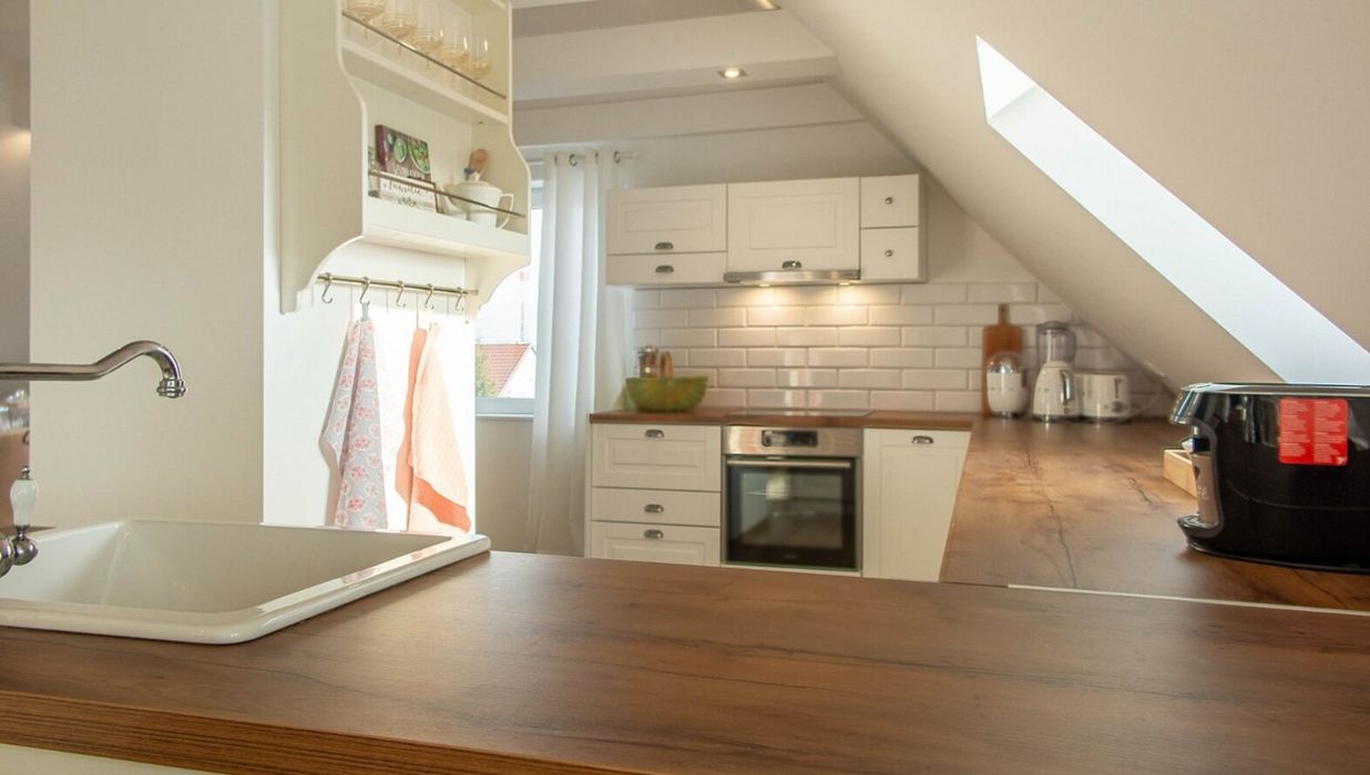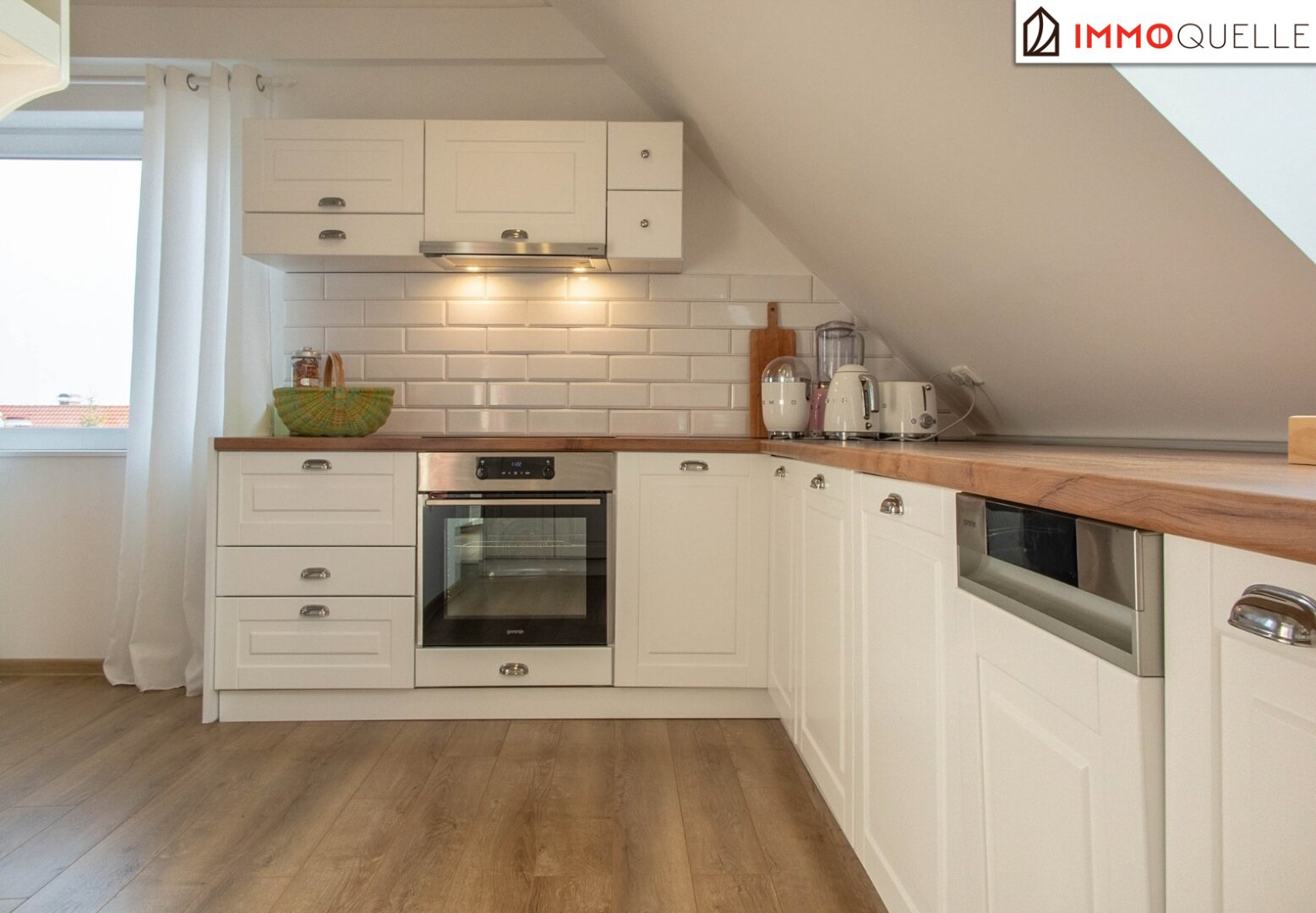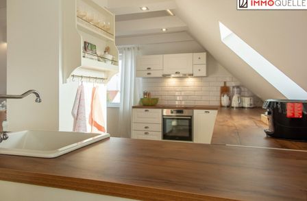 Die angrenzende Küche lädt zu kulinarischen Experimenten ein, großzügig dimensioniert, bestens belichtet und mit ausreichend Platz für gesellige Stunden mit Freunden oder der Familie. Über eine charmante Treppe erreichen Sie die offene Empore, ein zusätzlicher Rückzugsort für Gäste, ein Lesebereich oder Ihre persönliche Kreativzone.