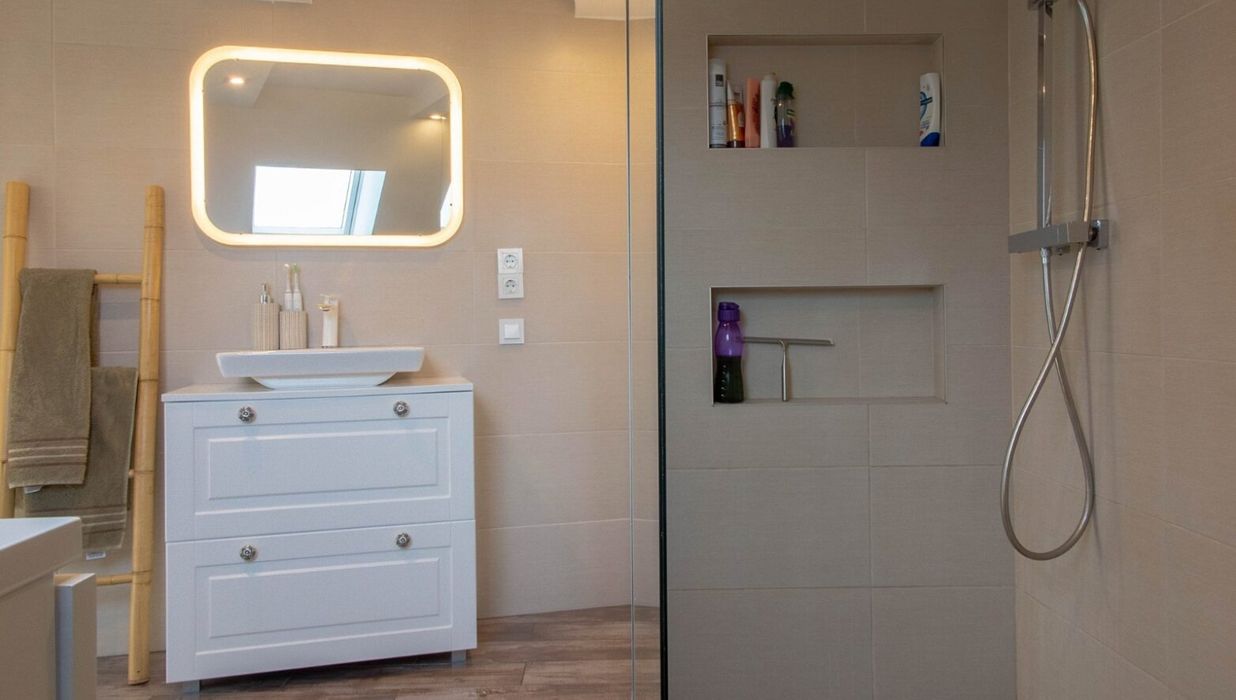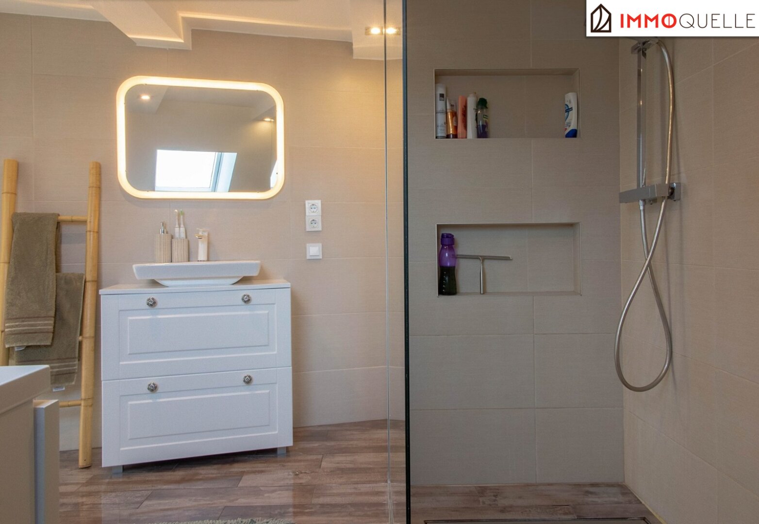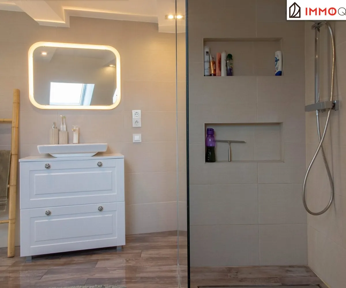 Das Schlafzimmer präsentiert sich als harmonischer Ort der Ruhe, mit angrenzendem Schrankraum und viel Stauraum für Ihre Garderobe. Das modernisierte Badezimmer mit Regendusche verwöhnt mit hochwertigen Materialien und zeitgemäßer Ausstattung. Hier beginnt und endet jeder Tag mit Komfort und Stil.