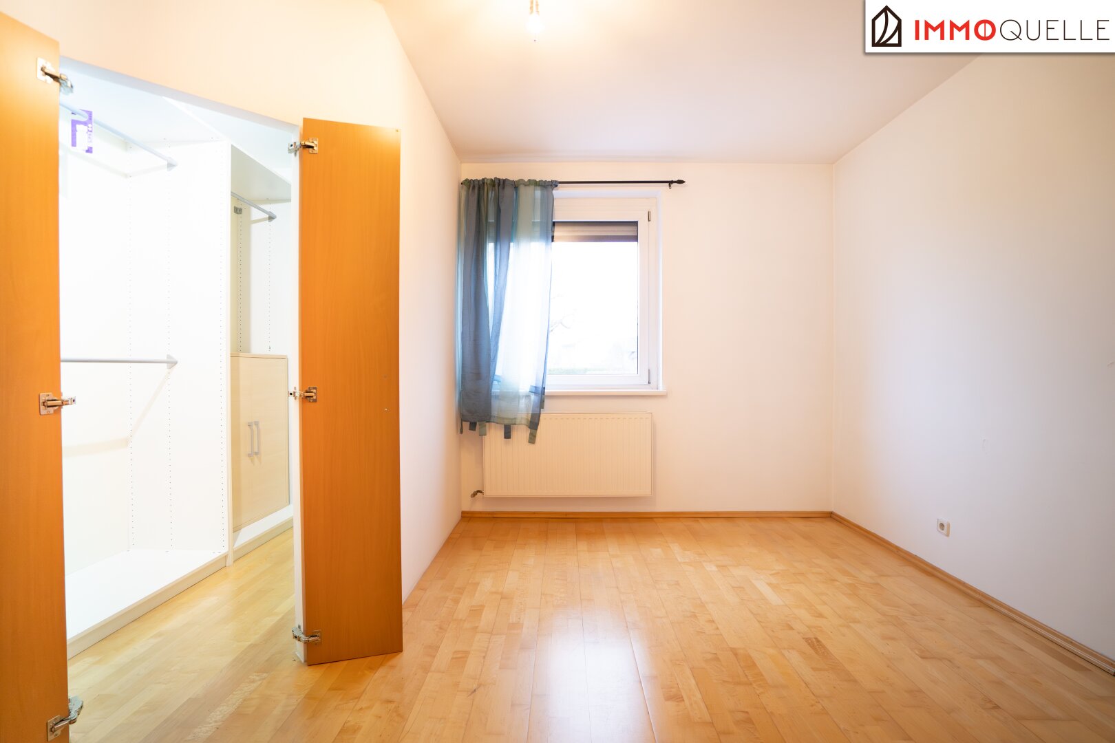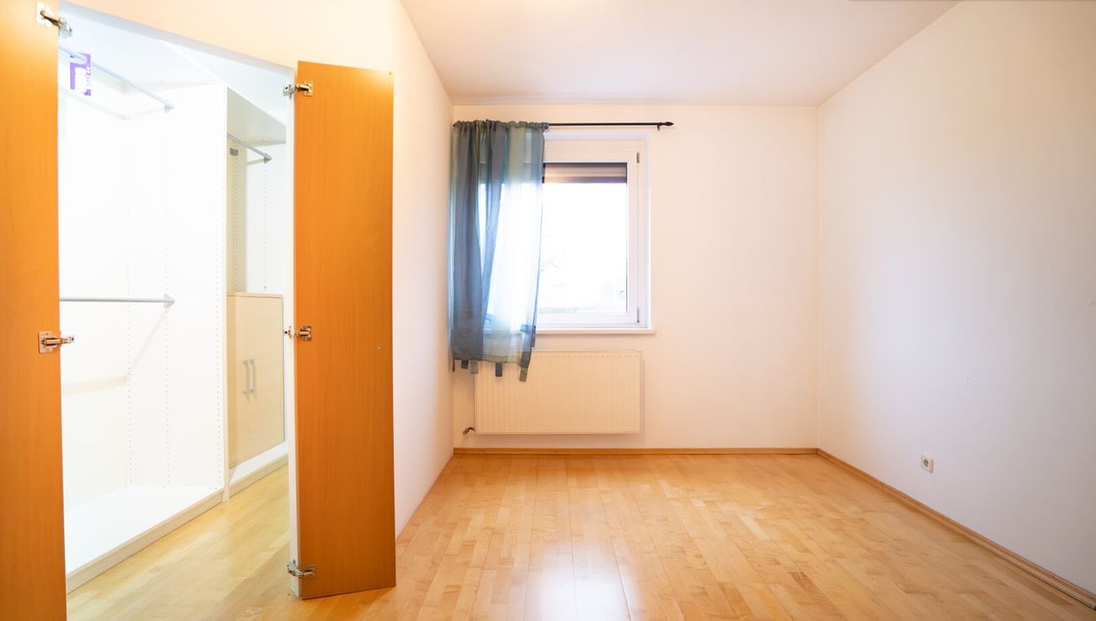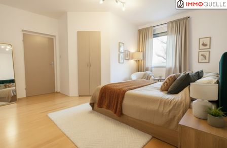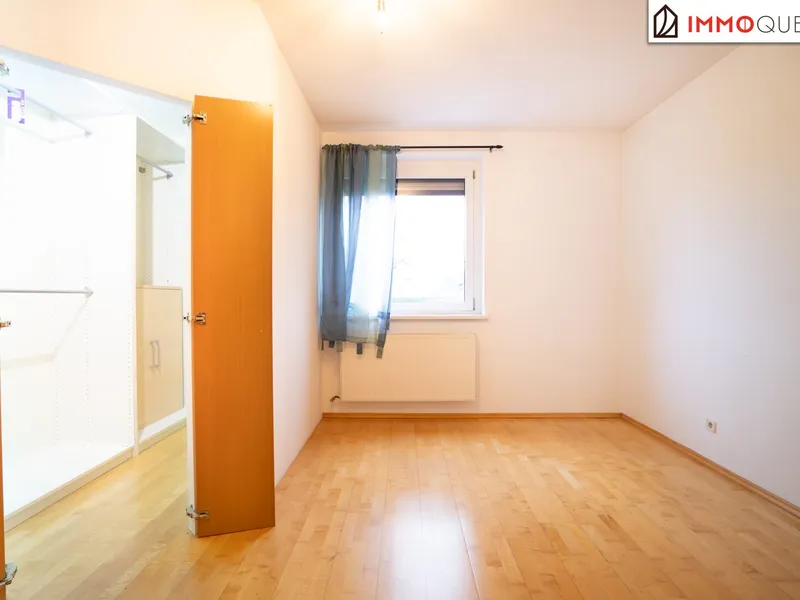 Am Ende des Wohnbereichs gelangen Sie in das sehr großzügig geschnittene Schlafzimmer. Der separate, integrierte Schrankraum schafft hier zusätzliche Ordnung - ganz ohne das klassische Schrankgefühl.