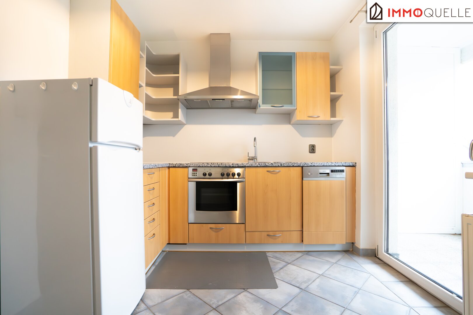 Folgen Sie dem Flur weiter, öffnet sich die Wohnung zu ihrer vollen Großzügigkeit: Der Wohnbereich bildet das Herzstück – lichtdurchflutet, freundlich und offen gestaltet. Hier ist genug Platz für Sofa, Essplatz und Ihre persönlichen Wohnideen. Der angrenzende Küchenraum ist als eigener Raum abgetrennt, bietet ausreichend Arbeitsfläche und einen direkten Zugang zur überdachten Loggia. Diese blickgeschützte Freifläche lädt ein zum Frühstück im Freien, zum Lesen in der Abendsonne oder einfach dazu, die Ruhe zu genießen.