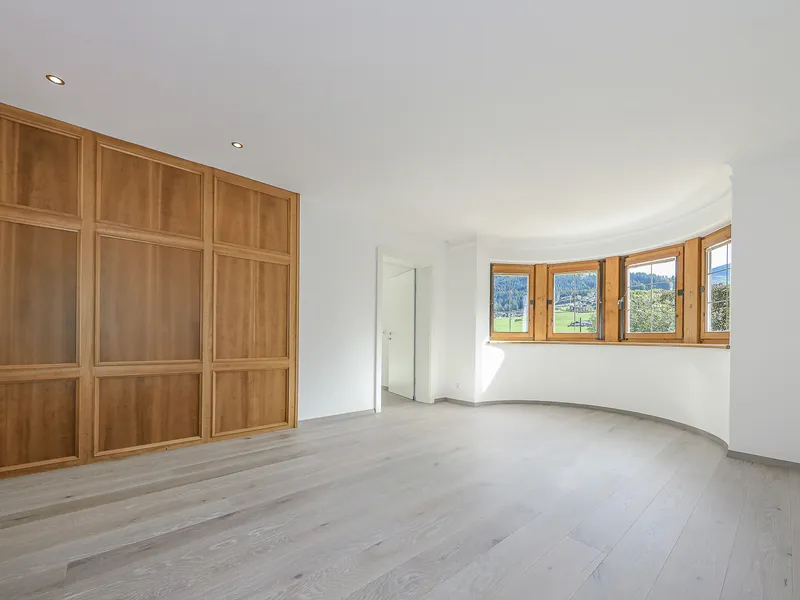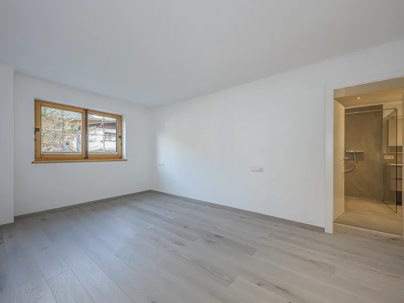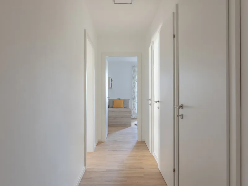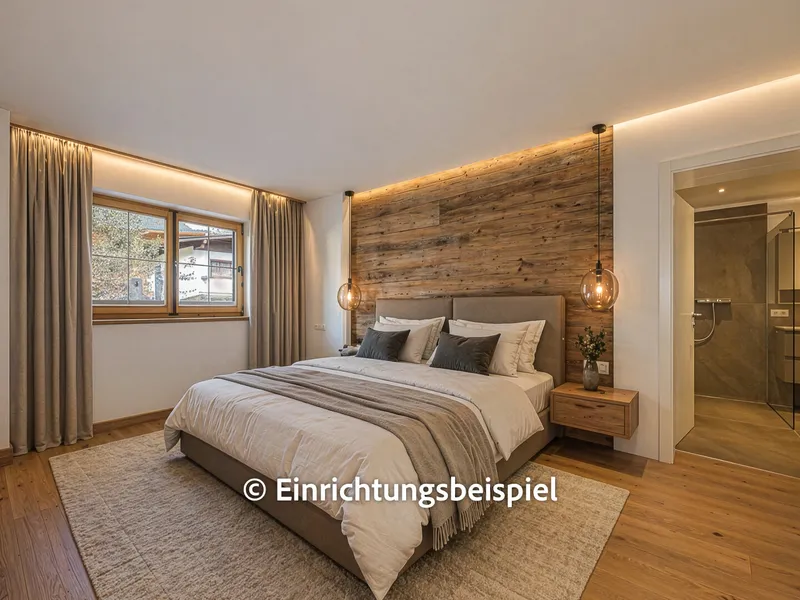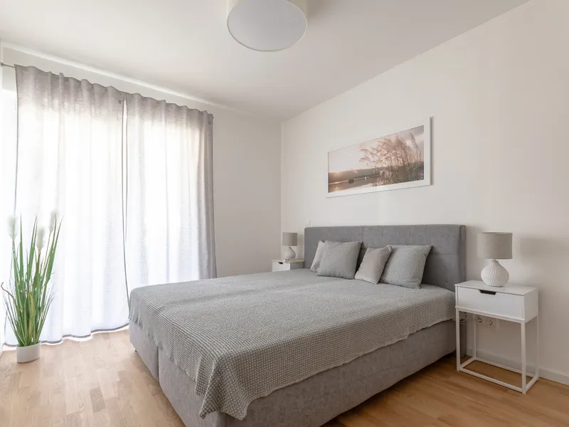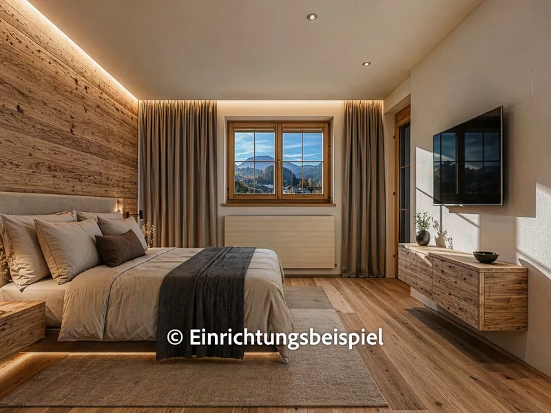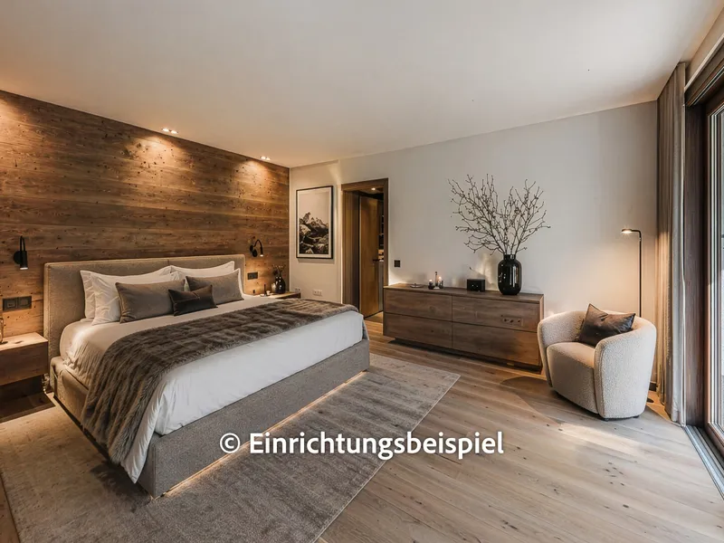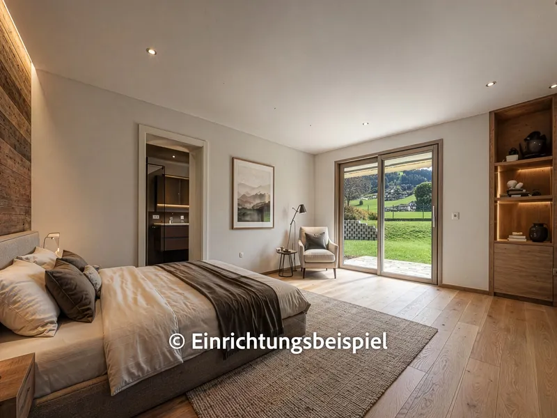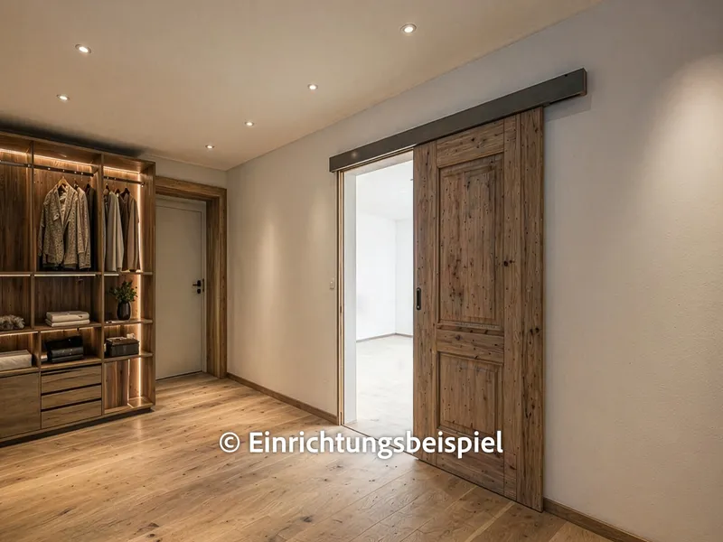 Am Ende des Wohnbereichs gelangen Sie in das sehr großzügig geschnittene Schlafzimmer. Der separate, integrierte Schrankraum schafft hier zusätzliche Ordnung - ganz ohne das klassische Schrankgefühl.
