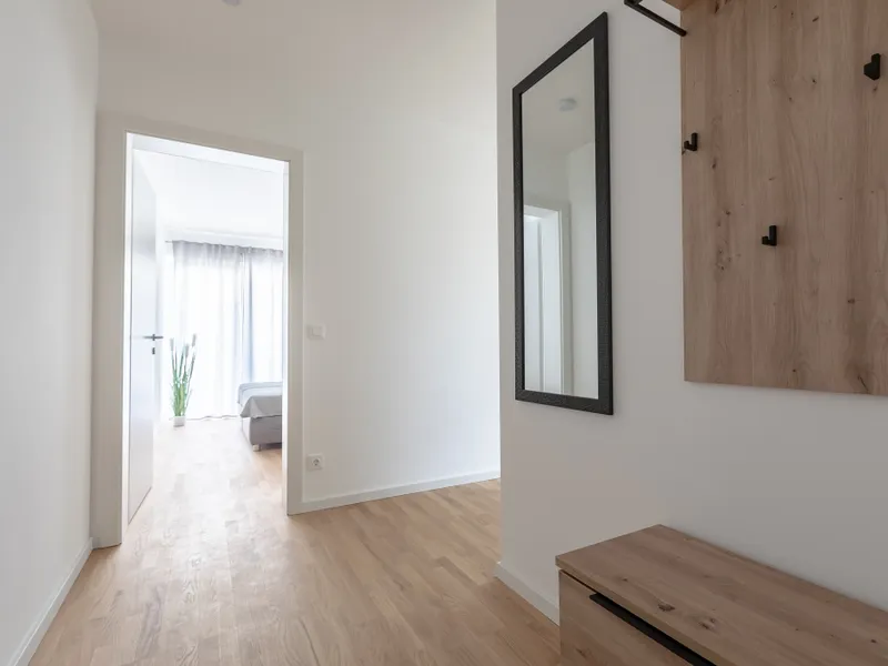 Bereits beim Eintreten empfängt Sie ein einladender Vorraum, der nicht nur als klassischer Eingangsbereich fungiert, sondern geschickt die Funktionen der Wohnung zoniert. Rechter Hand befindet sich das modernisierte Badezimmer - kompakt, aber funktional - sowie ein separates WC. Daneben: ein praktischer Abstellraum mit Waschmaschinenanschluss, ideal für den Alltag.