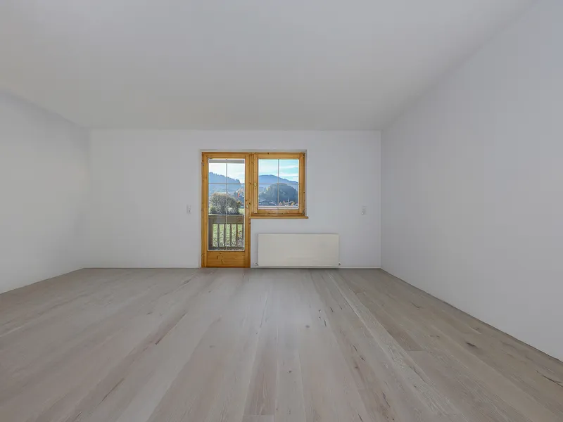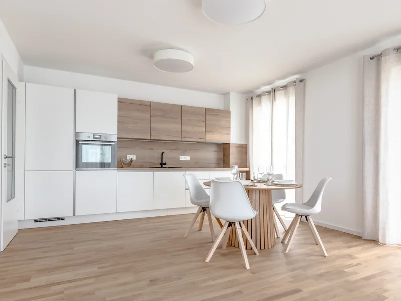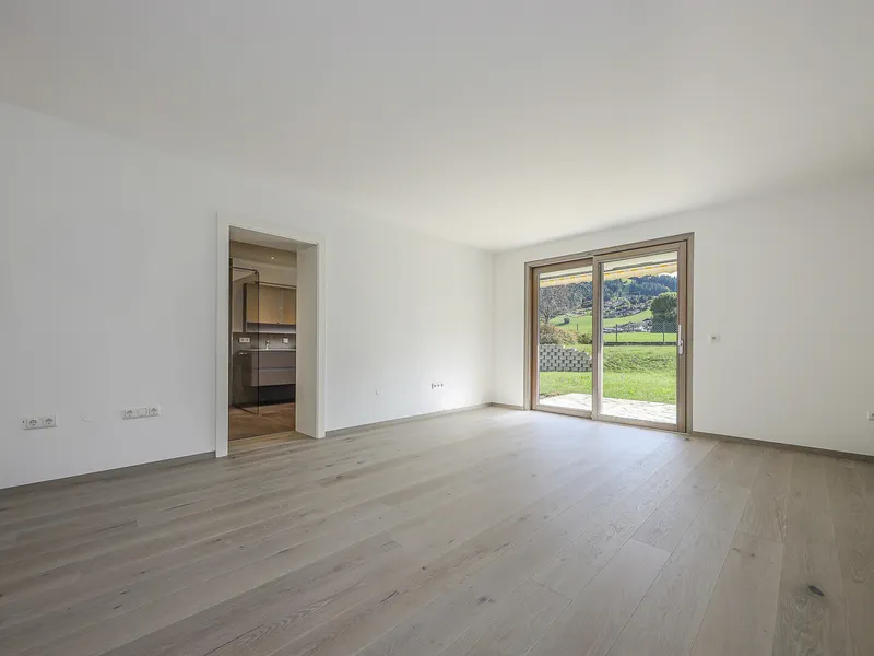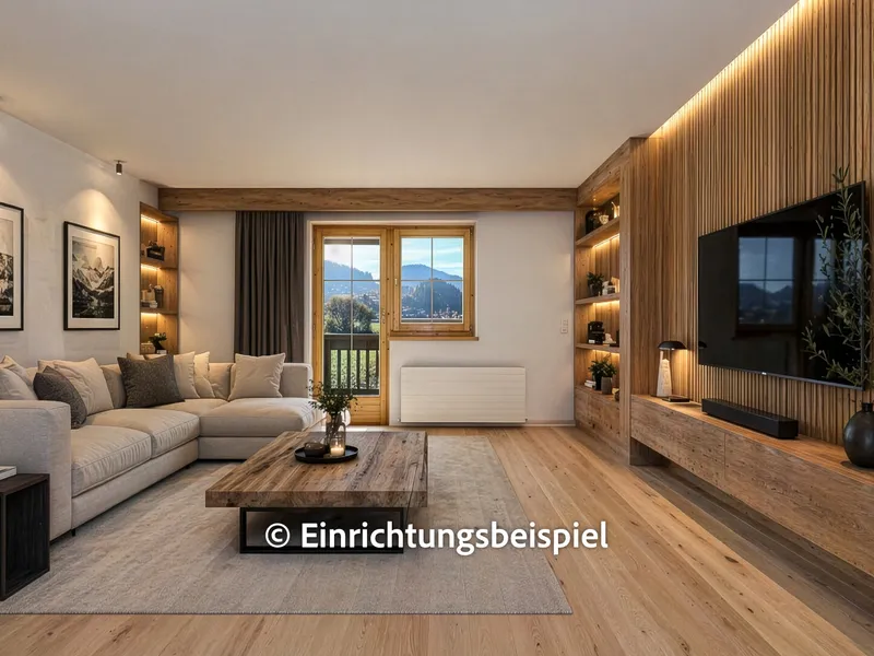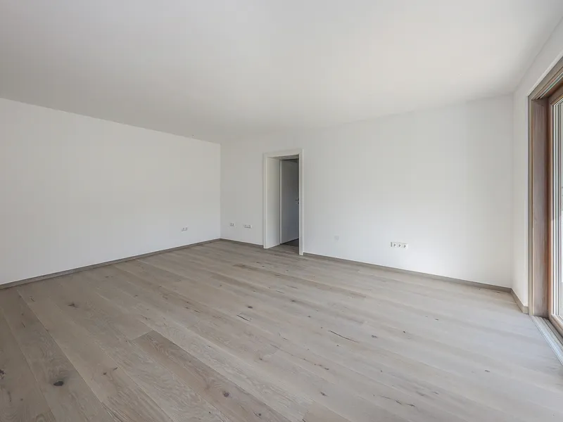 Folgen Sie dem Flur weiter, öffnet sich die Wohnung zu ihrer vollen Großzügigkeit: Der Wohnbereich bildet das Herzstück – lichtdurchflutet, freundlich und offen gestaltet. Hier ist genug Platz für Sofa, Essplatz und Ihre persönlichen Wohnideen. Der angrenzende Küchenraum ist als eigener Raum abgetrennt, bietet ausreichend Arbeitsfläche und einen direkten Zugang zur überdachten Loggia. Diese blickgeschützte Freifläche lädt ein zum Frühstück im Freien, zum Lesen in der Abendsonne oder einfach dazu, die Ruhe zu genießen.
