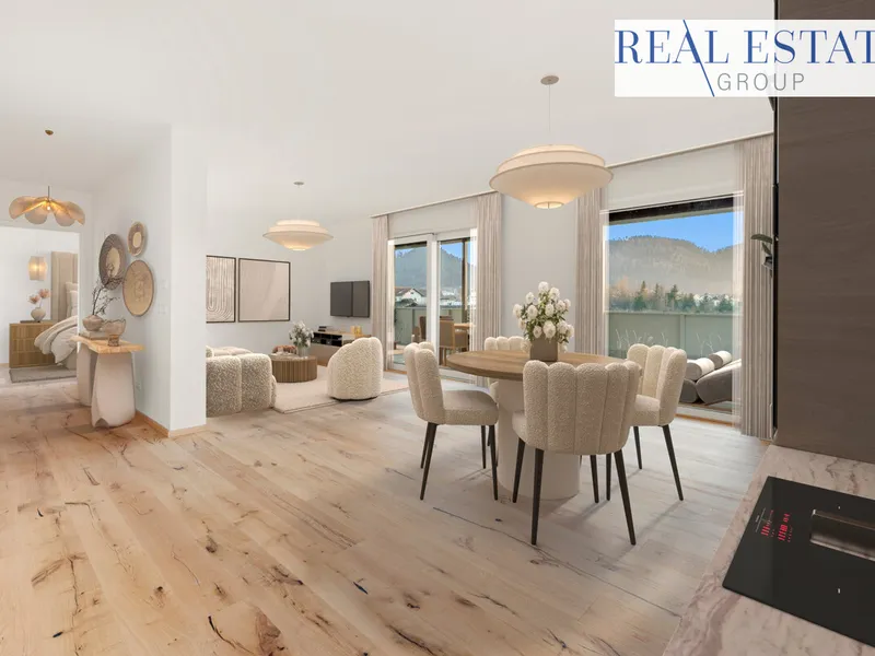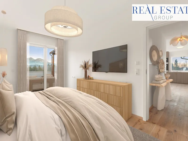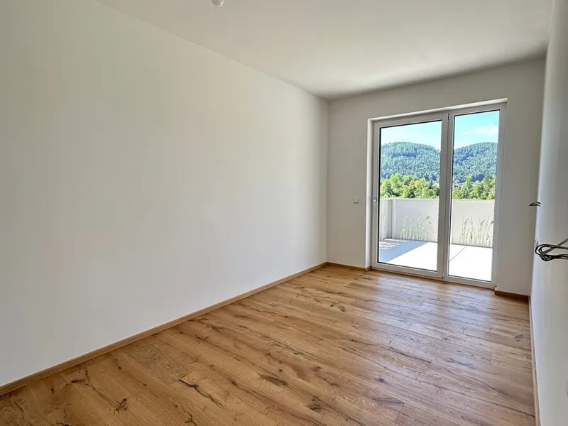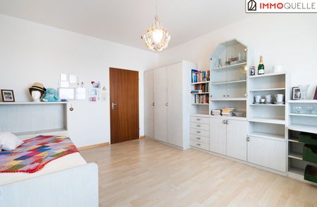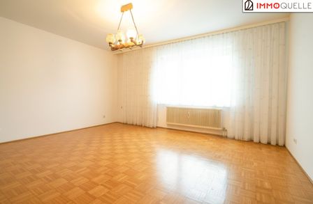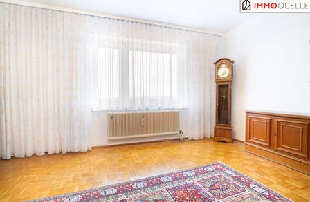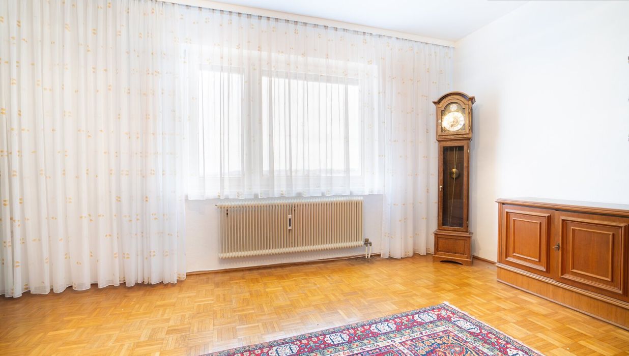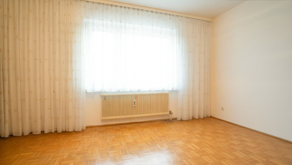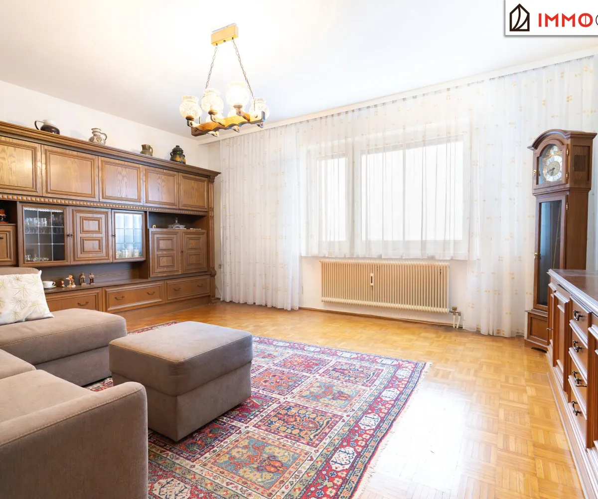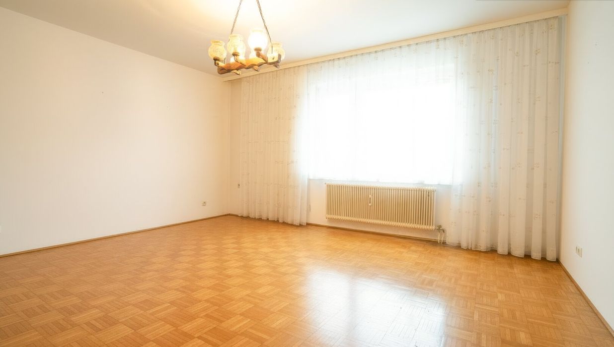 Auf der rechten Seite des Flurs entfaltet sich der private Wohnbereich - alle Räume nach Osten ausgerichtet, mit sanftem Sonnenlicht ab den frühen Morgenstunden. Zunächst das großzügige Wohnzimmer mit breiten Fensterflächen: ein heller, einladender Raum mit herrlichem Ausblick über die Dächer von Wels. Genießen Sie hier einen stillen Moment am Abend, eine Tasse Kaffee am Morgen - oder den Sonnenaufgang ganz für sich allein.