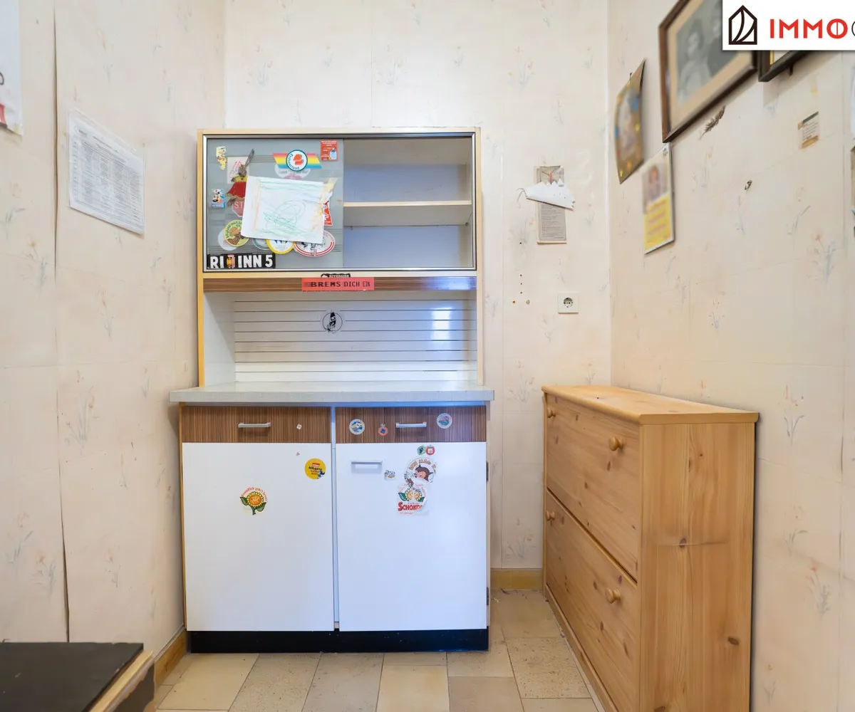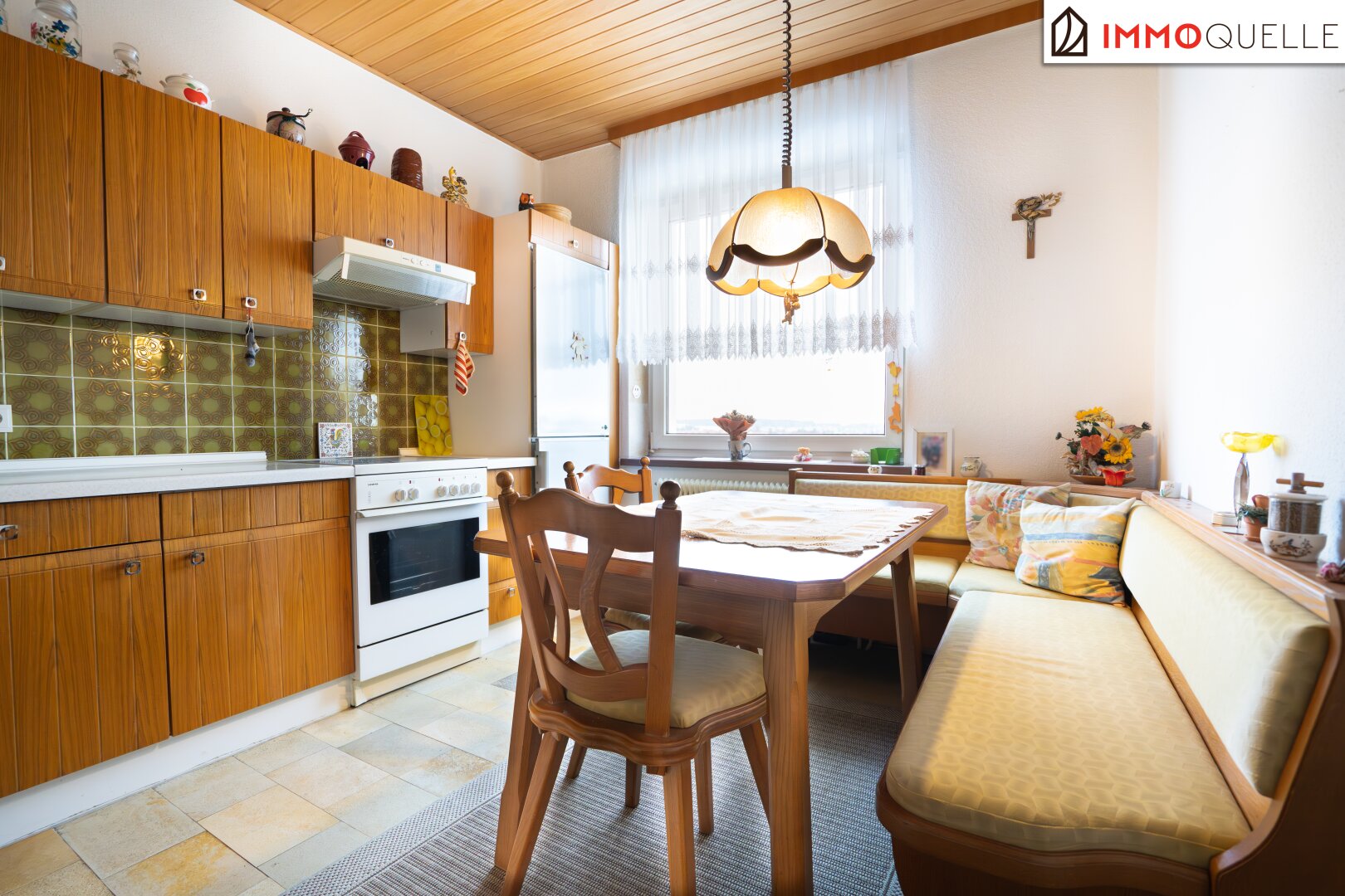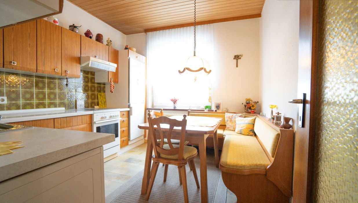 Geradeaus eröffnet sich die nordseitig ausgerichtete Küche mit Fenster - funktional ausgestattet, hell durch Tageslicht und mit freiem Blick in die Ferne. Ob Frühstück am Morgen oder schneller Kaffee zwischendurch: Hier beginnt der Tag mit Klarheit und Ausblick.